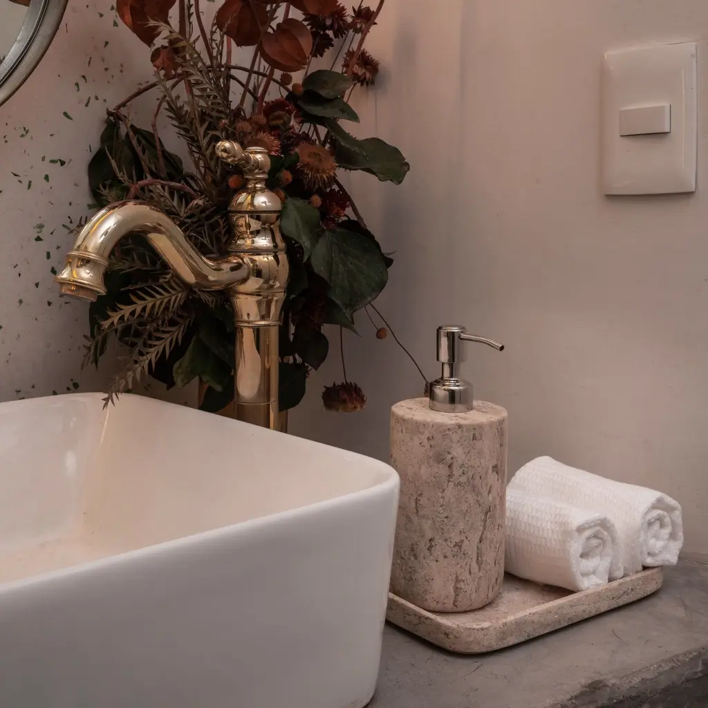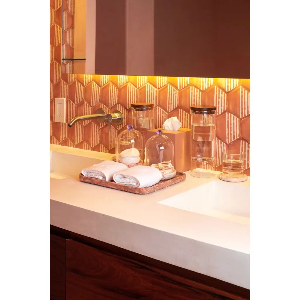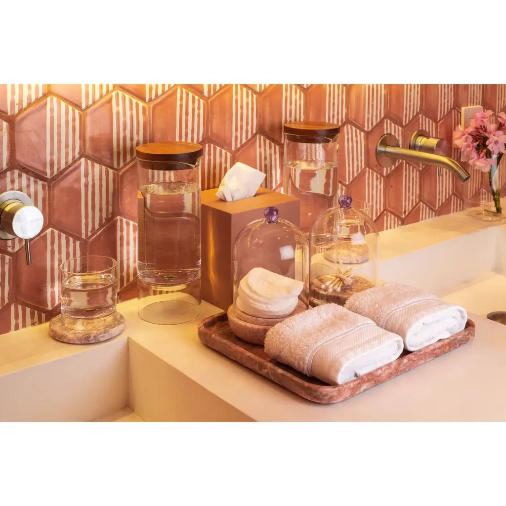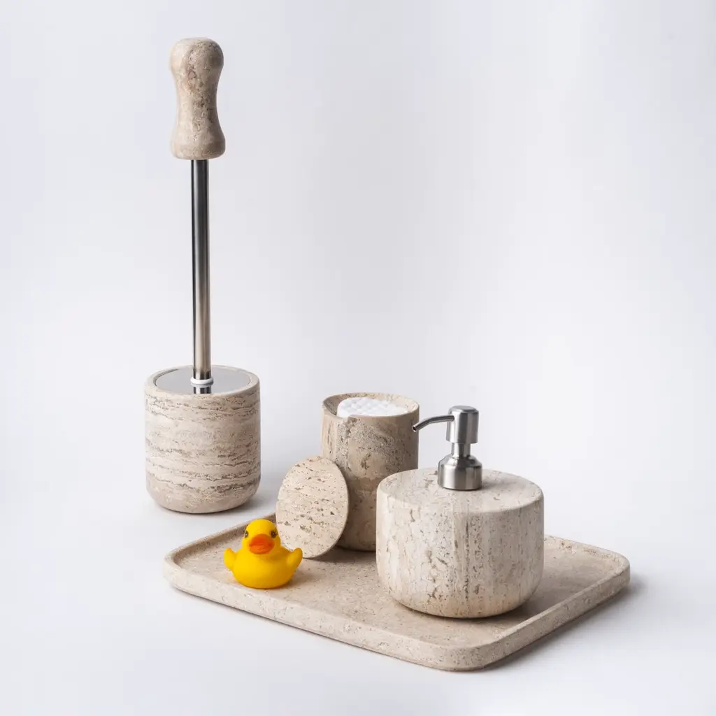 Beautiful hand carved marble or onyx tray. Functional to place towels, dispensers, containers, bathroom products or cosmetics. It is usually located in a bathroom vanity, bedroom, bureau or any other place that is thought of.The stone regularly contains a beautiful variety of betas and contrasts.Available in two sizes.Less Is More Collection Set Accessory