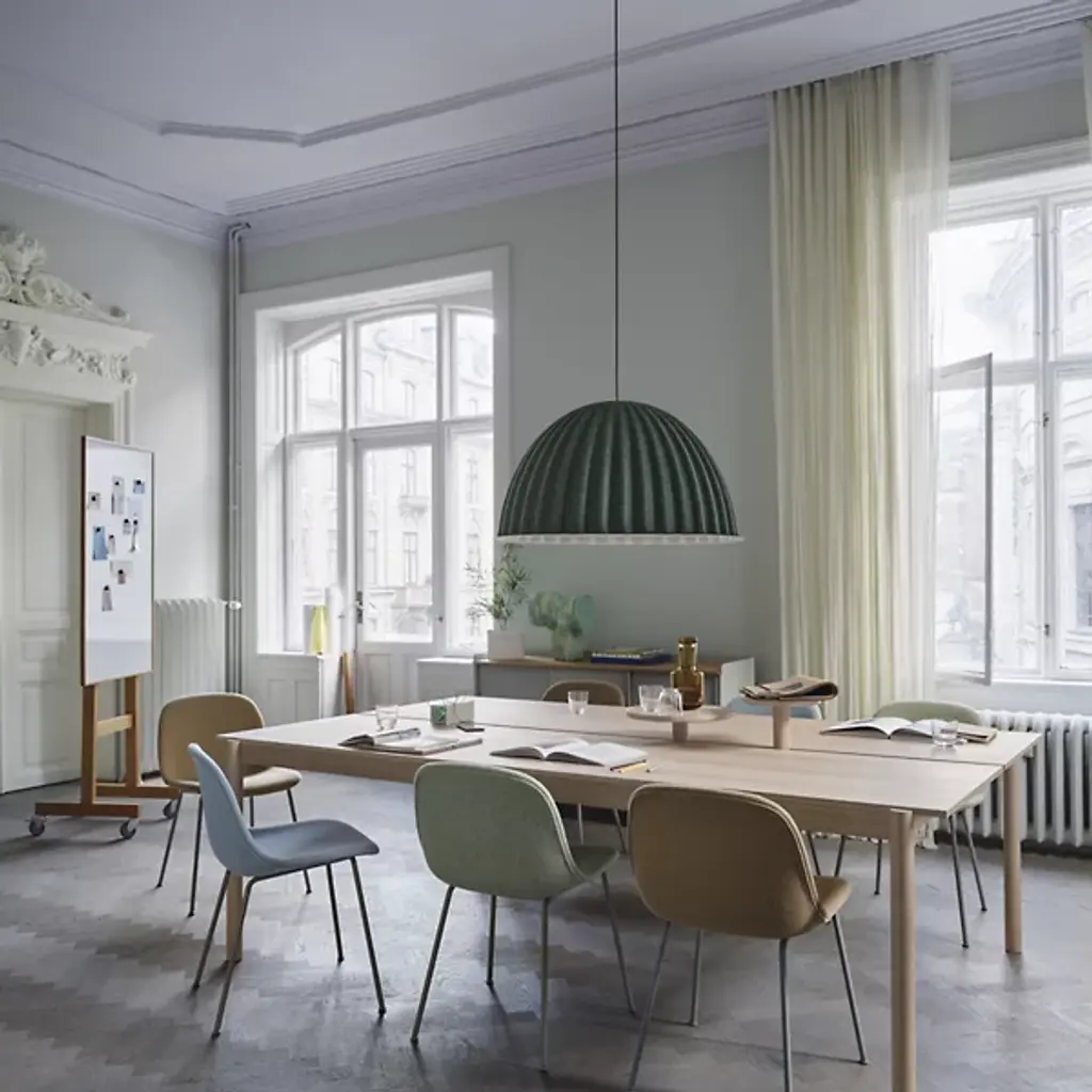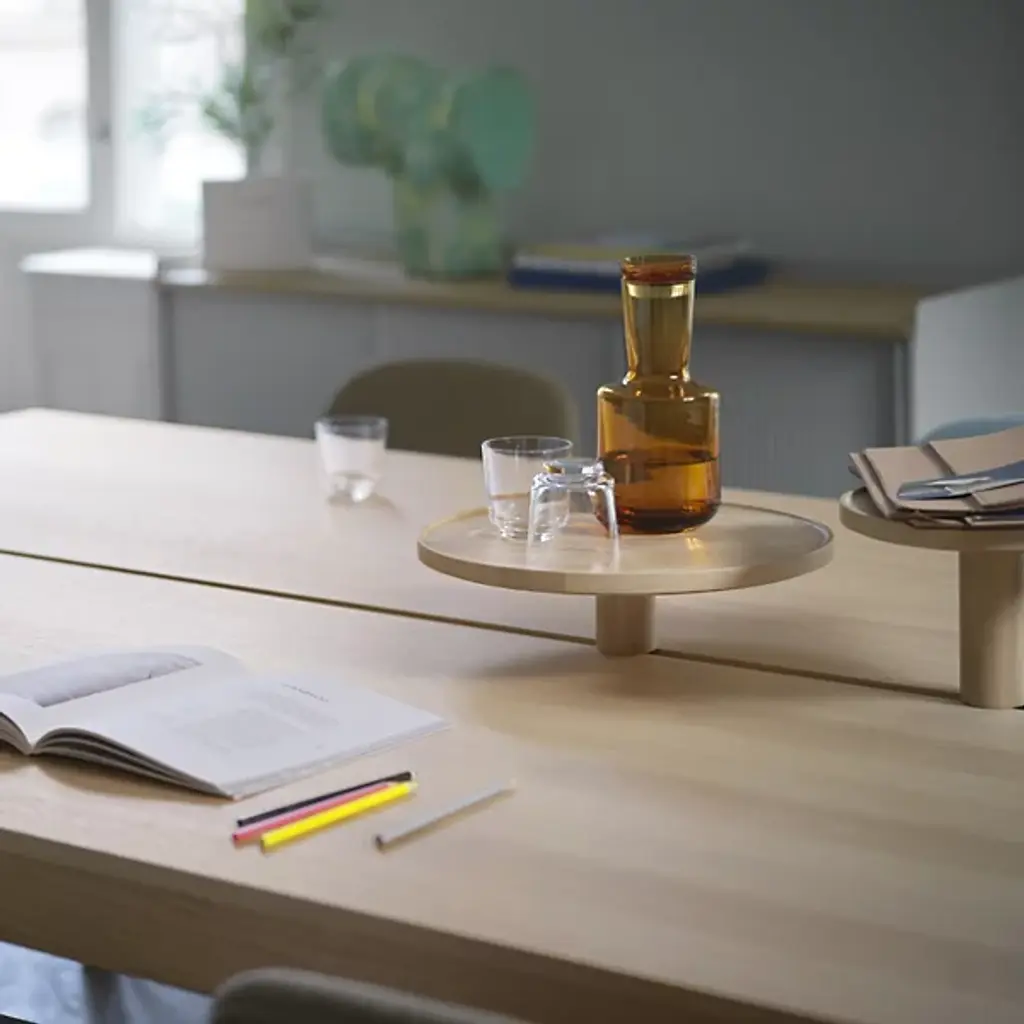 The Linear System Round Tray from Muuto beckons users with its approachable design. Thomas Bentzen's creation is a space-defining tool that carves out intimate areas within broader contexts. The round shape promotes a sense of unity and flow, perfect for displaying cherished objects or serving refreshments. Powder-coated aluminum fixing knobs provide a subtle contrast to the wood's natural grain, adding a hint of industrial chic. Whether mounted in a living room, office, or dining area, it brings intuitive design to life, proving that functionality can be both beautiful and engaging.