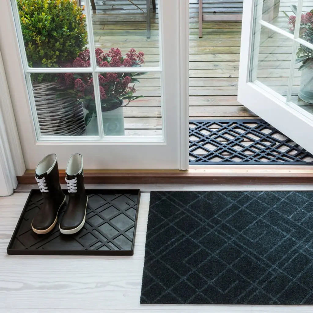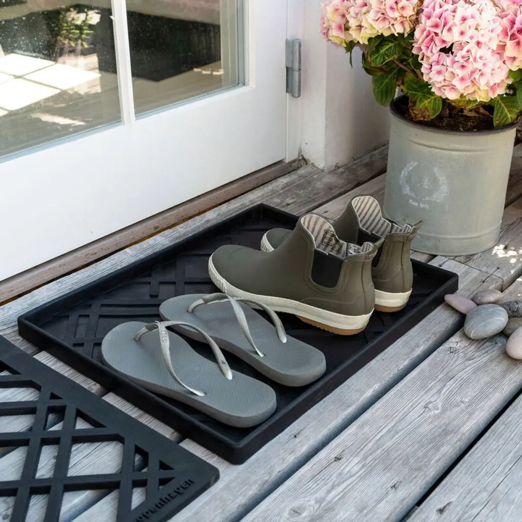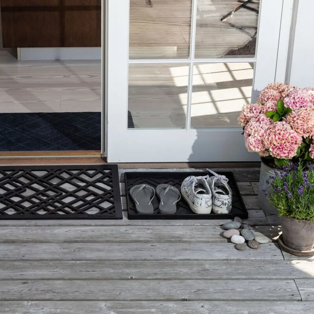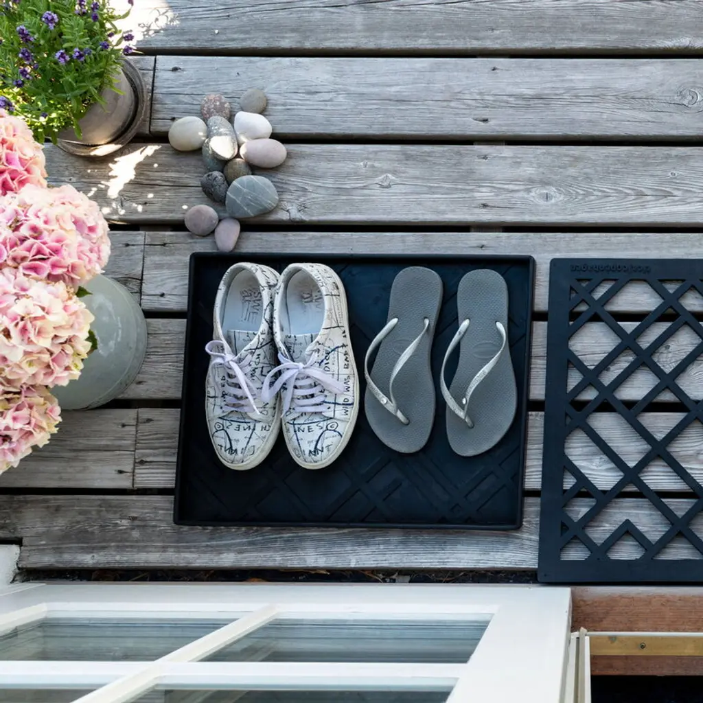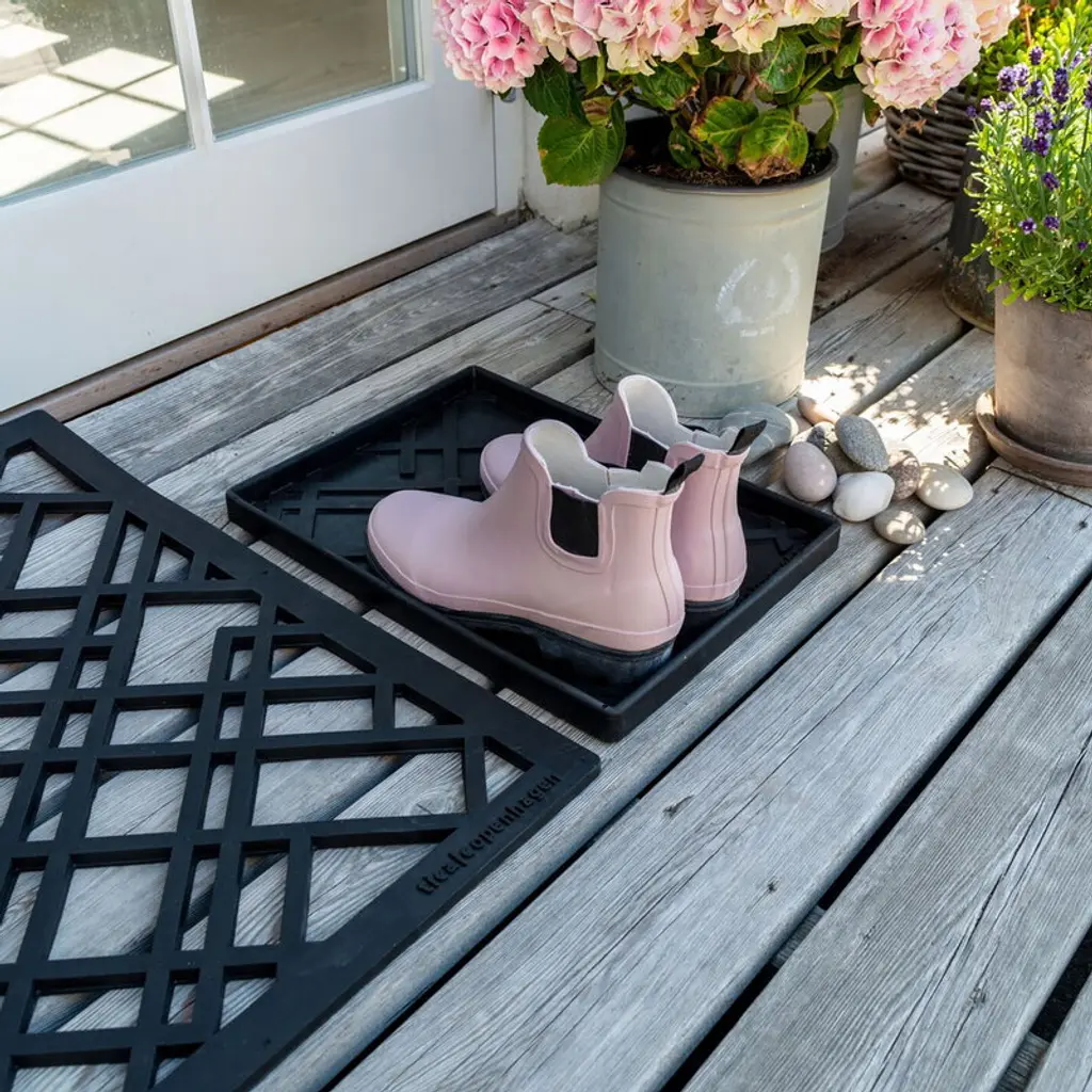 Tica Copenhagen's Lines shoe tray is a beautiful and practical addition to both the hallway and even outdoors – the sturdy rubber mat is designed for both indoor and outdoor use. The Lines shoe mat keeps muddy shoes in check and the hallway clean – the medium size shoe tray can hold two pairs of adult shoes and up to four pairs of kids’ shoes at once. The clever tray is also perfect for drying out wet accessories of all sorts from umbrellas to doggy leashes. Made of dense rubber the Lines shoe mat stays firmly in place on all types of surfaces and is easy to clean by vacuuming or rinsing.