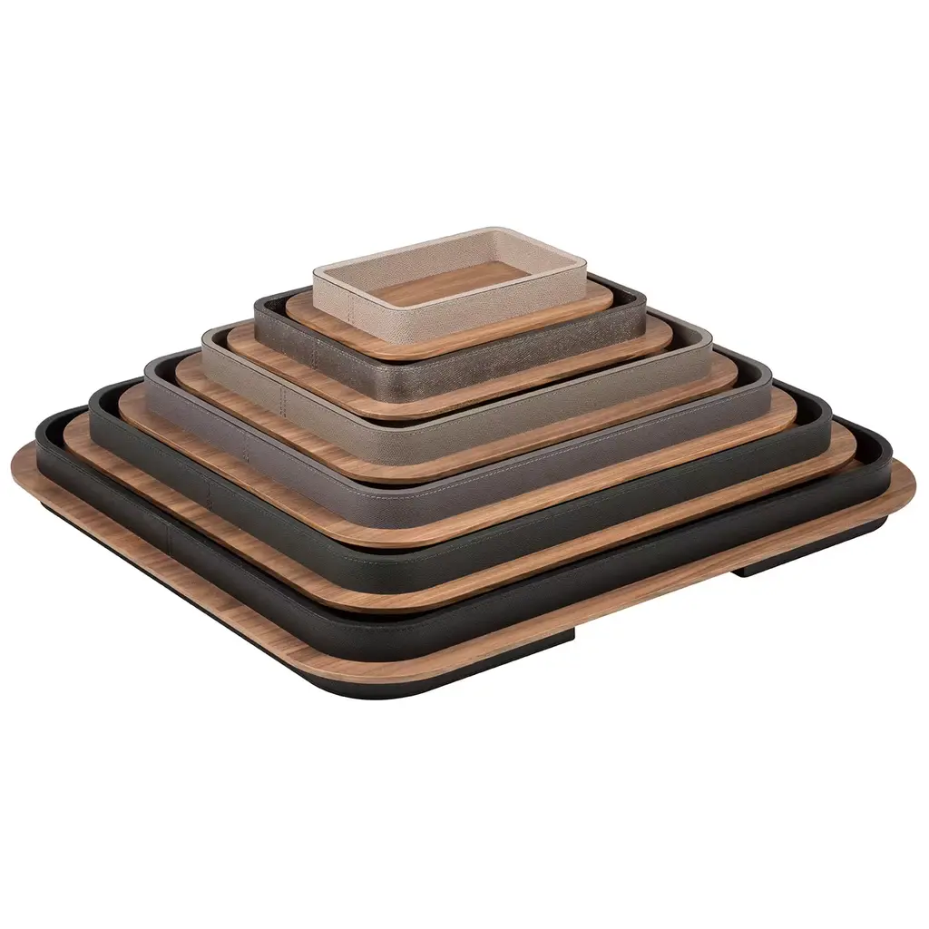 A stylish choice to hold candles and personal objects in an entryway or bedroom dresser, or to serve drinks on a special occasion, this tray will be a enthralling addition to any home decor collection. Showcasing a mesmerizing walnut wood finish, the wooden structure is exquisitely enriched with a beige leather upholstery covering the base support and the top frame, enhanced with a singular shiny effect. Custom sizes and a wenge finish are available upon request, please contact the Concierge for details.