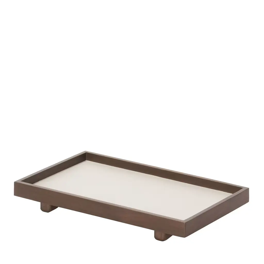 Timeless sophistication and a versatile charm are distinctive traits of this splendid piece of functional decor: a wooden tray enriched with a practical and refined frame. Boasting a minimalist silhouette, it combines an elegant walnut finish that showcases the mesmerizing grains, and a black color characterizing the leather upholstery covering the base support and rectangular frame. Custom sizes and a dark wenge finish are available upon request.