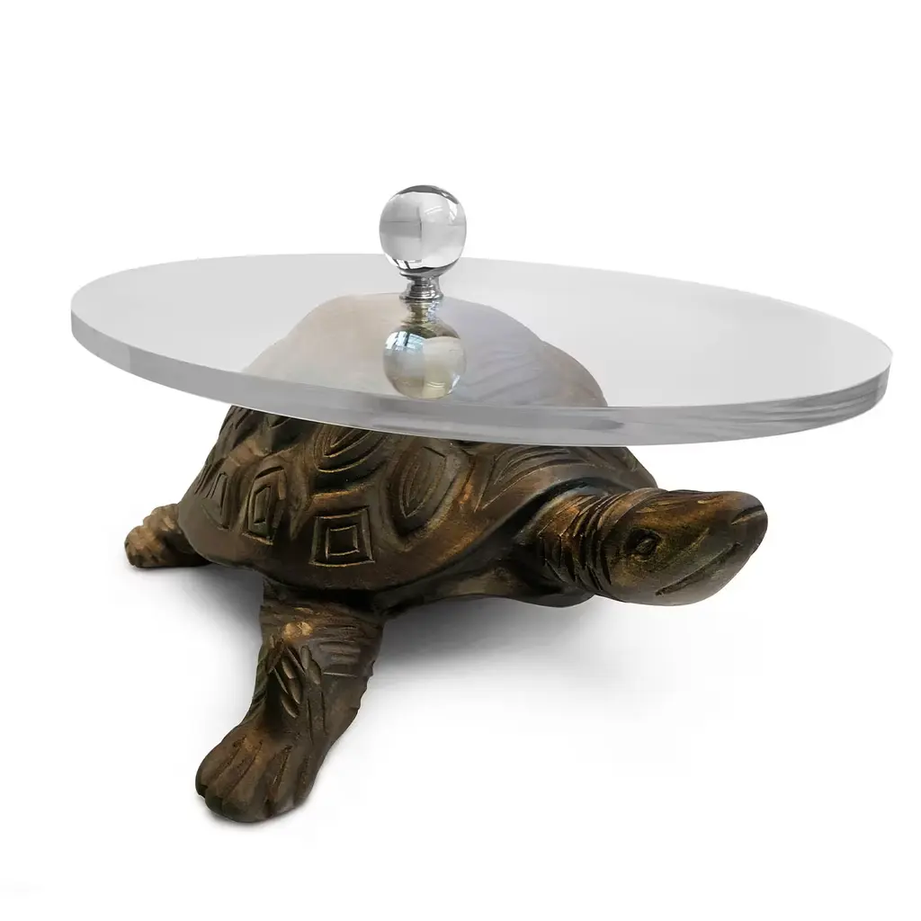 The Lucky Turtle Tray, designed by Carlo Rampazzi, is an unique tray combines the allure of hand-carved wood with modern craftsmanship, featuring a smooth finish that is elegantly enhanced with a bronze patina. Its whimsical turtle base adds a playful touch, while the clear plexiglass top provides a contemporary contrast, making it suitable for both casual and formal occasions. Ideal for serving treats or displaying decorative items.
