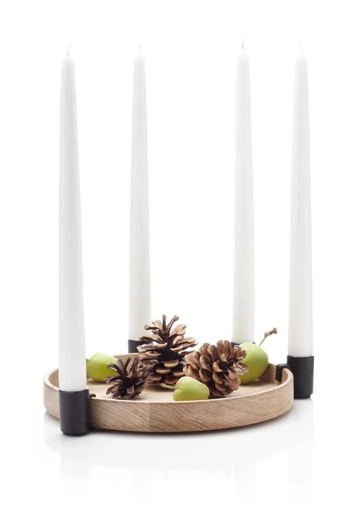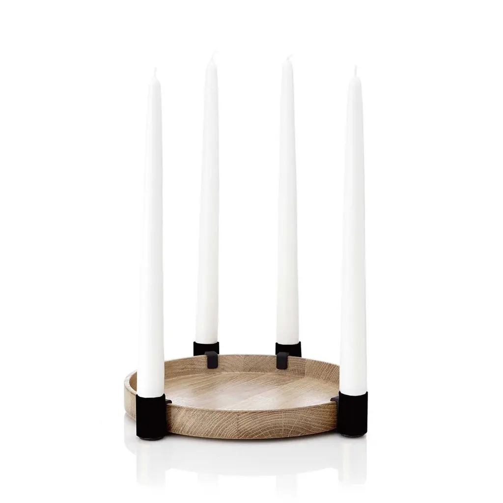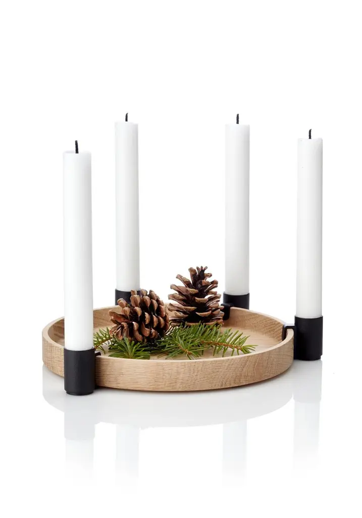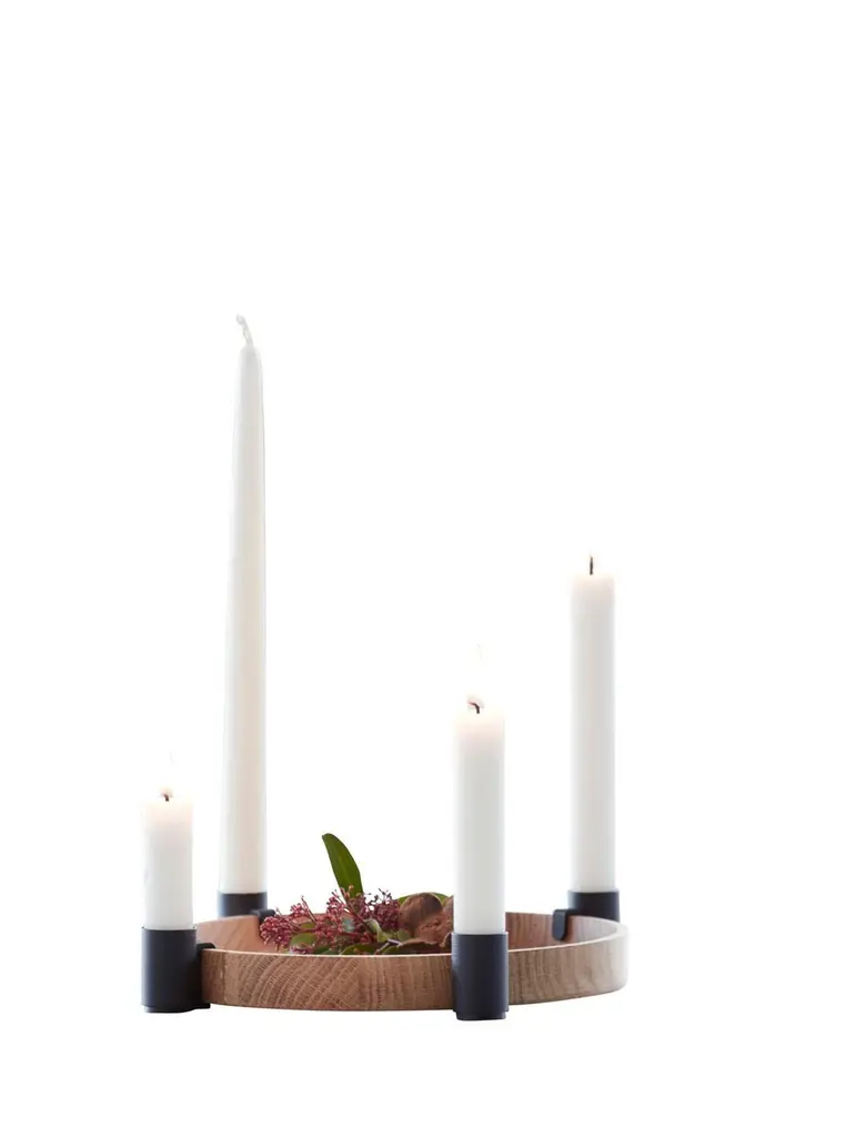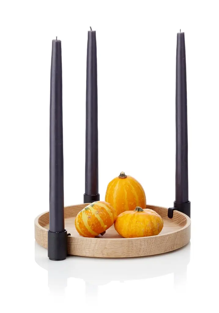 Luna Black Candleholder and Tray by ApplicataDimensions: D 27 x W 27 x H 3.7 cmMaterials: Metal, oak.Available in black or brass candleholders.Available in the Maxi version.The idea was to design a candleholder that can be used all year round for parties and everyday life, with the possibility to add your own style.LUNA can be used as an everyday candleholder on the dining table with nuts or fruit, or it can be decorated for the holiday season. The small candleholders are movable or can even be removed for your choice.LUNA is inspired by the night sky, changing and admirable, with the moon as the focal point and the stars around - sometimes a few, sometimes many. LUNA comes with 4 black or 4 brass candleholders.Applicata’s entire collection is based on the idea of creating "A SPECIAL GIFT FOR A SPECIAL OCCASION" To that end, we have allied ourselves with exciting design talents and artists.We have brought exclusive and genuine materials into play – and ensured that everything is produced in Scandinavia. Even our Eco-friendly gift boxes.Our design DNA is distinctive by taking the vibrant energy, aesthetics, and wildness found among new and rising design talents and artists and coupling it with traditional artisanship, ensuring that everything is produced at family-owned, Scandinavian workshops. That is how our new collection came into being. And this approach will be an existing springboard for future design collaborations.