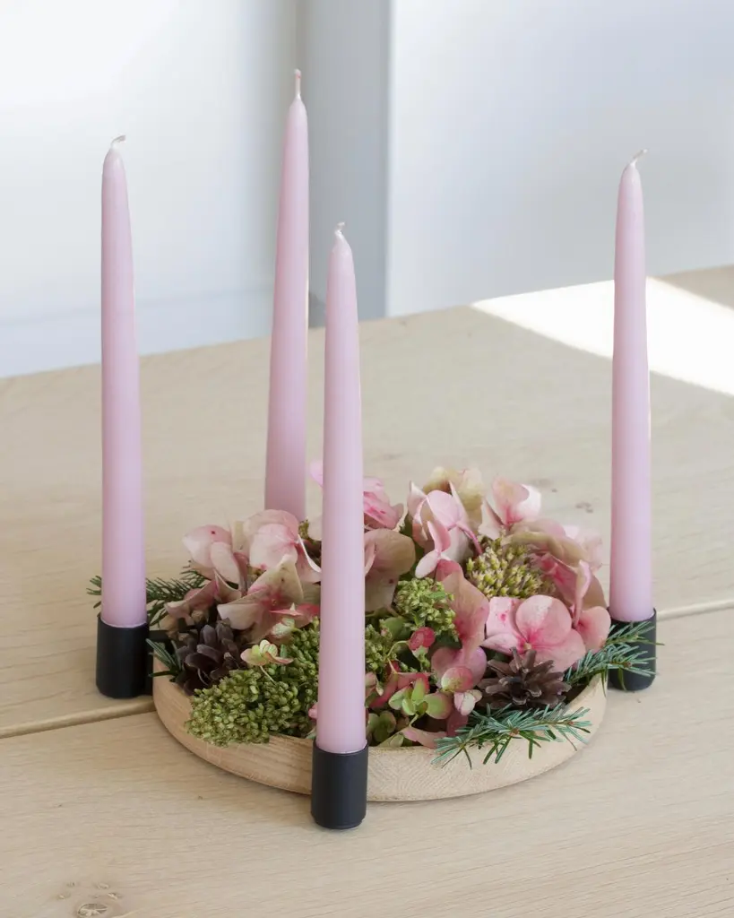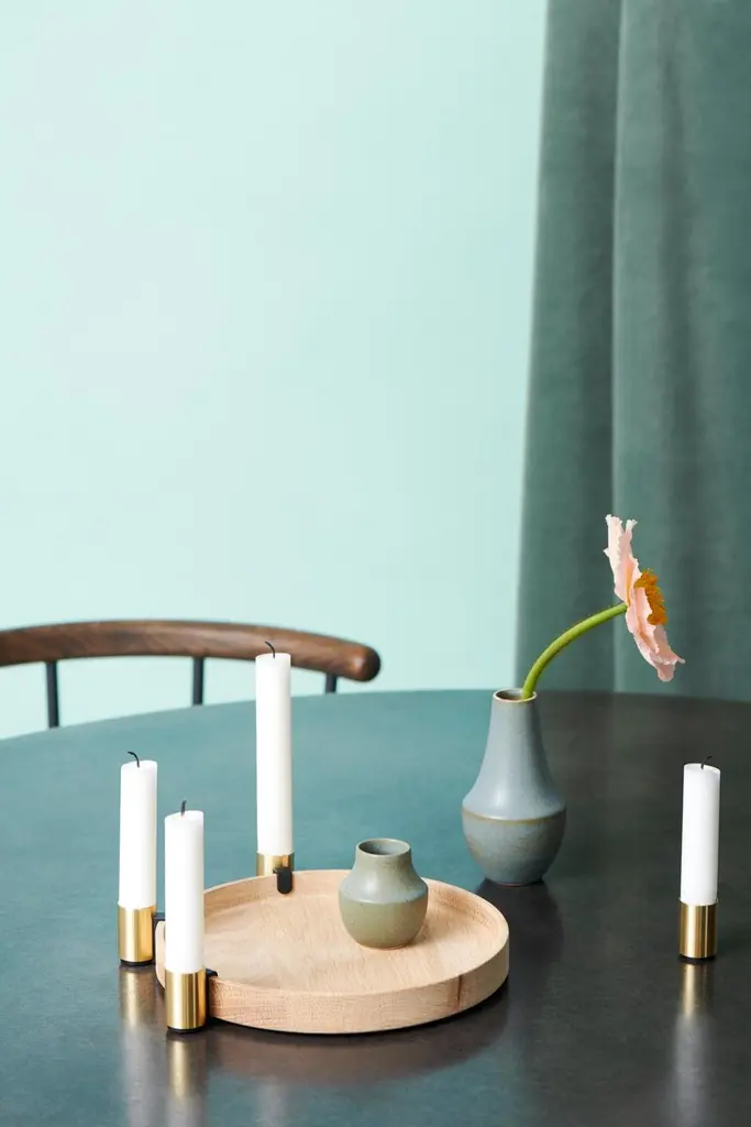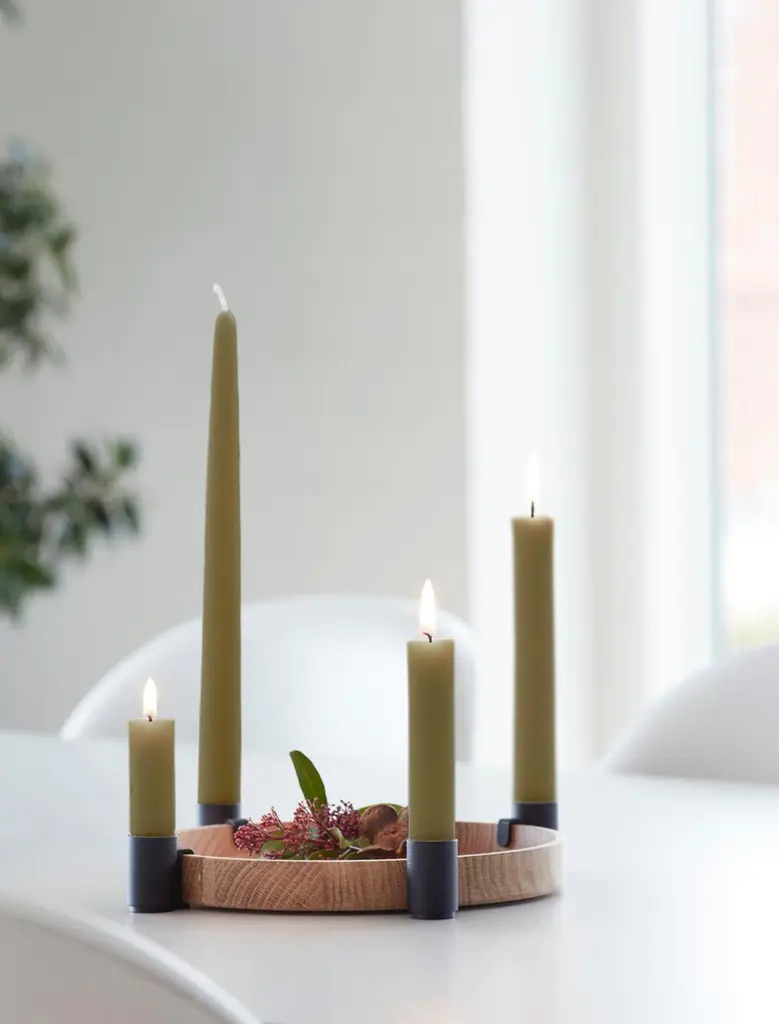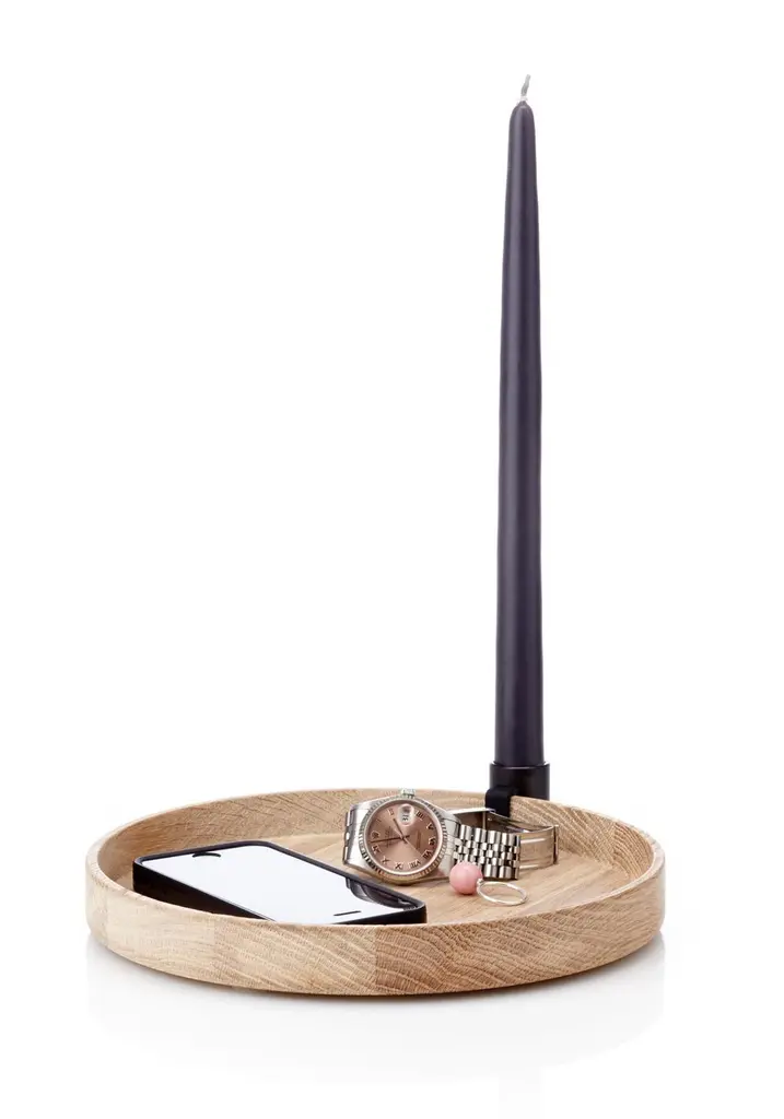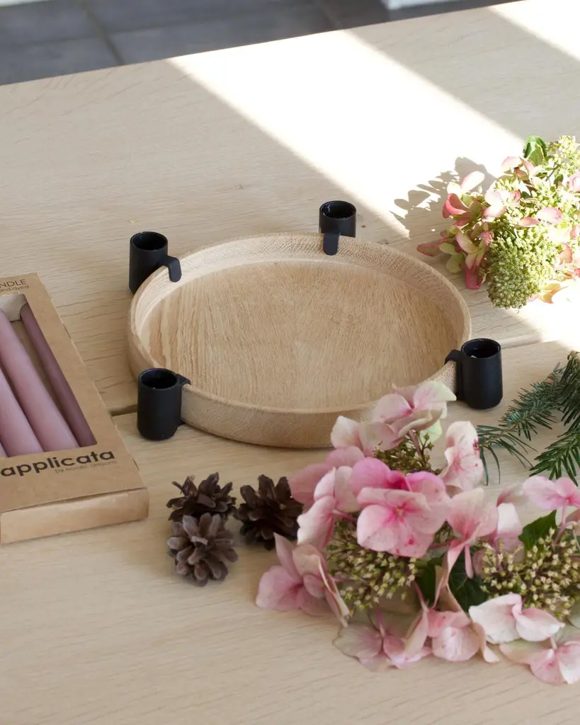 Luna Black Candleholder and Tray by ApplicataDimensions: D 27 x W 27 x H 3.7 cmMaterials: Metal, oak.Available in black or brass candleholders.Available in the Maxi version.The idea was to design a candleholder that can be used all year round for parties and everyday life, with the possibility to add your own style.LUNA can be used as an everyday candleholder on the dining table with nuts or fruit, or it can be decorated for the holiday season. The small candleholders are movable or can even be removed for your choice.LUNA is inspired by the night sky, changing and admirable, with the moon as the focal point and the stars around - sometimes a few, sometimes many. LUNA comes with 4 black or 4 brass candleholders.Applicata’s entire collection is based on the idea of creating "A SPECIAL GIFT FOR A SPECIAL OCCASION" To that end, we have allied ourselves with exciting design talents and artists.We have brought exclusive and genuine materials into play – and ensured that everything is produced in Scandinavia. Even our Eco-friendly gift boxes.Our design DNA is distinctive by taking the vibrant energy, aesthetics, and wildness found among new and rising design talents and artists and coupling it with traditional artisanship, ensuring that everything is produced at family-owned, Scandinavian workshops. That is how our new collection came into being. And this approach will be an existing springboard for future design collaborations.