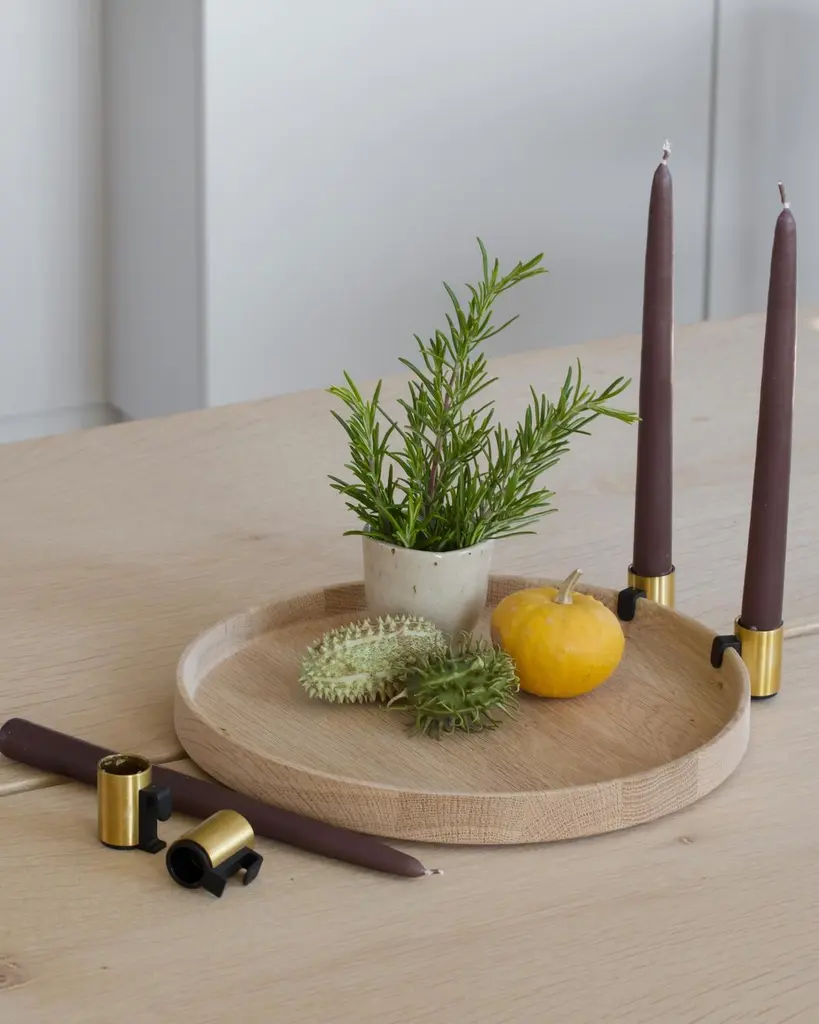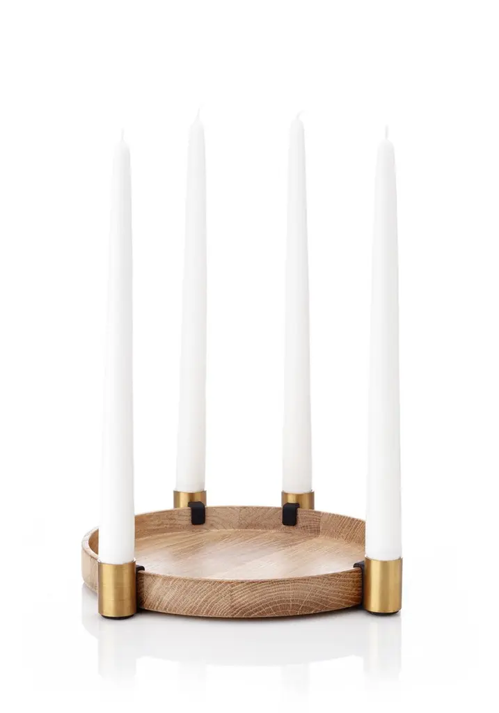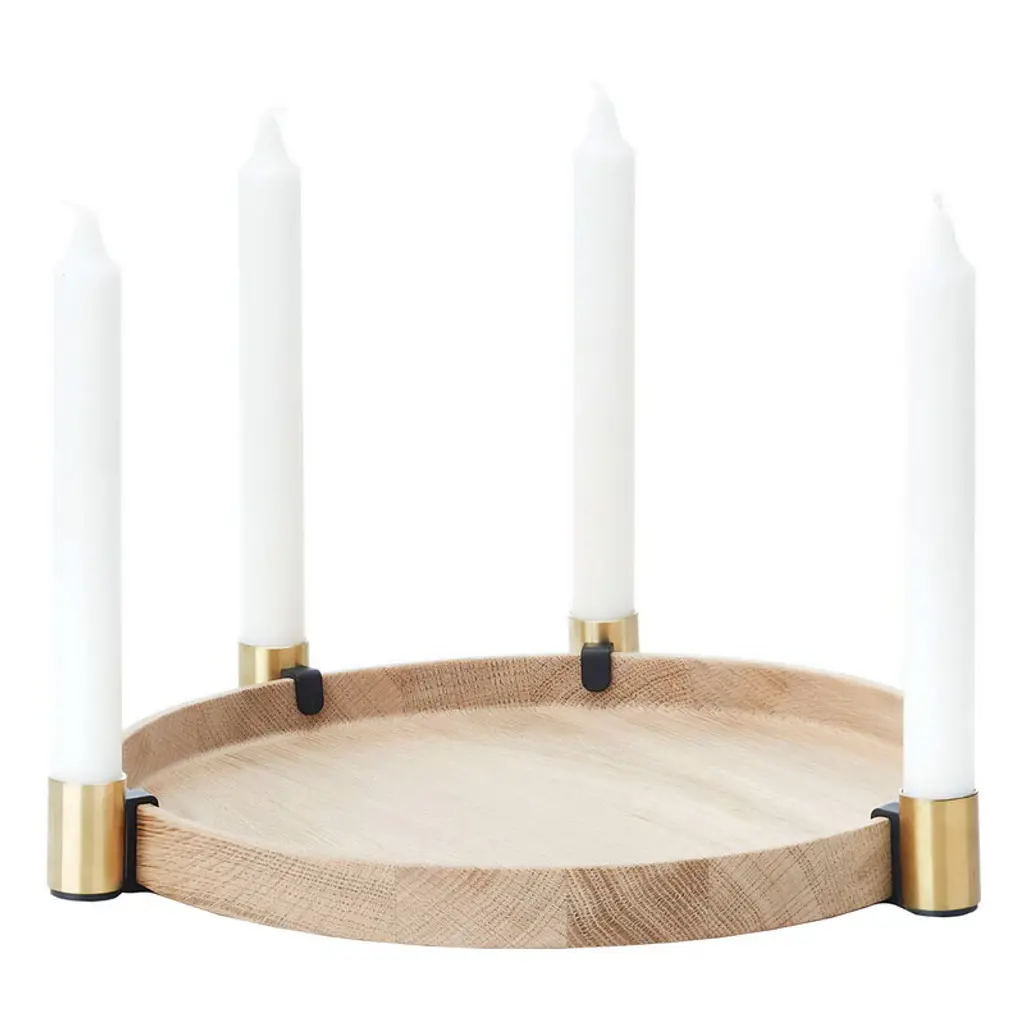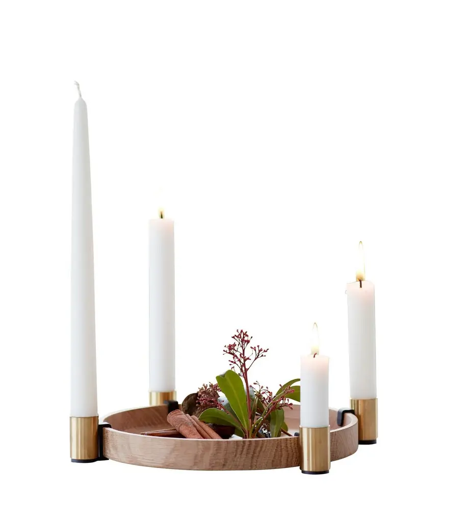 Luna Brass Candleholder and Tray by ApplicataDimensions: D 27 x W 27 x H 3.7 cmMaterials: Brass, oak.Available in black or brass candleholders.Available in the Maxi version.The idea was to design a candleholder that can be used all year round for parties and everyday life, with the possibility to add your own style.LUNA can be used as an everyday candleholder on the dining table with nuts or fruit, or it can be decorated for the holiday season. The small candleholders are movable or can even be removed for your choice.LUNA is inspired by the night sky, changing and admirable, with the moon as the focal point and the stars around - sometimes a few, sometimes many. LUNA comes with 4 black or 4 brass candleholders.Applicata’s entire collection is based on the idea of creating "A SPECIAL GIFT FOR A SPECIAL OCCASION" To that end, we have allied ourselves with exciting design talents and artists.We have brought exclusive and genuine materials into play – and ensured that everything is produced in Scandinavia. Even our Eco-friendly gift boxes.Our design DNA is distinctive by taking the vibrant energy, aesthetics, and wildness found among new and rising design talents and artists and coupling it with traditional artisanship, ensuring that everything is produced at family-owned, Scandinavian workshops. That is how our new collection came into being. And this approach will be an existing springboard for future design collaborations.