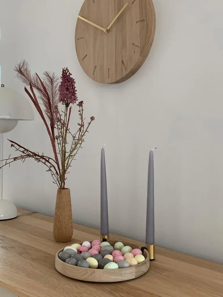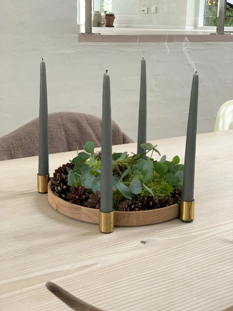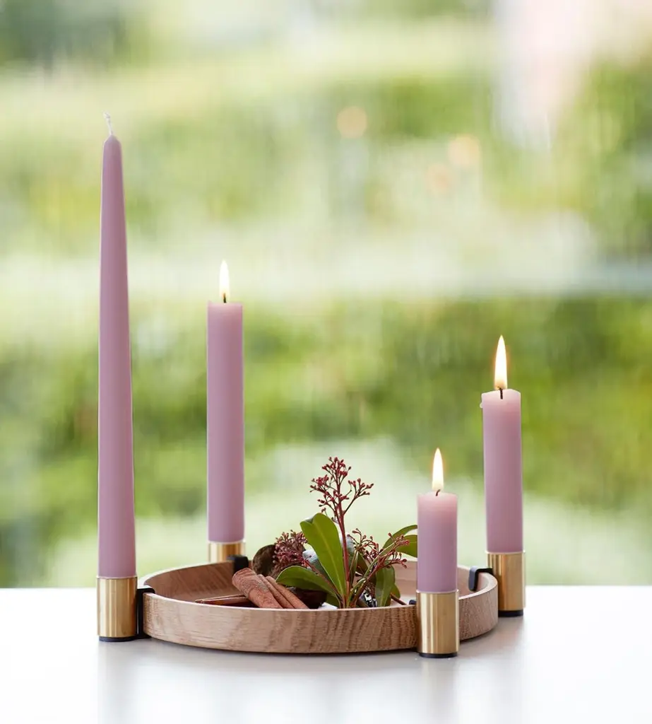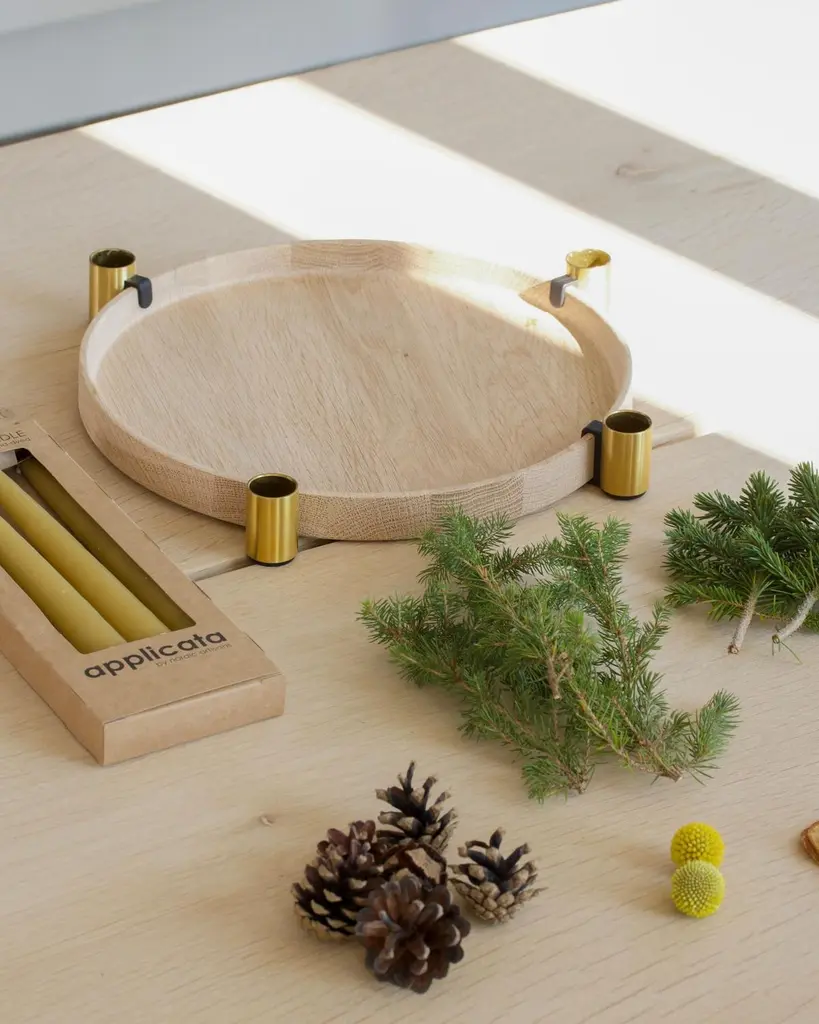 Luna Brass Candleholder and Tray by ApplicataDimensions: D 27 x W 27 x H 3.7 cmMaterials: Brass, oak.Available in black or brass candleholders.Available in the Maxi version.The idea was to design a candleholder that can be used all year round for parties and everyday life, with the possibility to add your own style.LUNA can be used as an everyday candleholder on the dining table with nuts or fruit, or it can be decorated for the holiday season. The small candleholders are movable or can even be removed for your choice.LUNA is inspired by the night sky, changing and admirable, with the moon as the focal point and the stars around - sometimes a few, sometimes many. LUNA comes with 4 black or 4 brass candleholders.Applicata’s entire collection is based on the idea of creating "A SPECIAL GIFT FOR A SPECIAL OCCASION" To that end, we have allied ourselves with exciting design talents and artists.We have brought exclusive and genuine materials into play – and ensured that everything is produced in Scandinavia. Even our Eco-friendly gift boxes.Our design DNA is distinctive by taking the vibrant energy, aesthetics, and wildness found among new and rising design talents and artists and coupling it with traditional artisanship, ensuring that everything is produced at family-owned, Scandinavian workshops. That is how our new collection came into being. And this approach will be an existing springboard for future design collaborations.