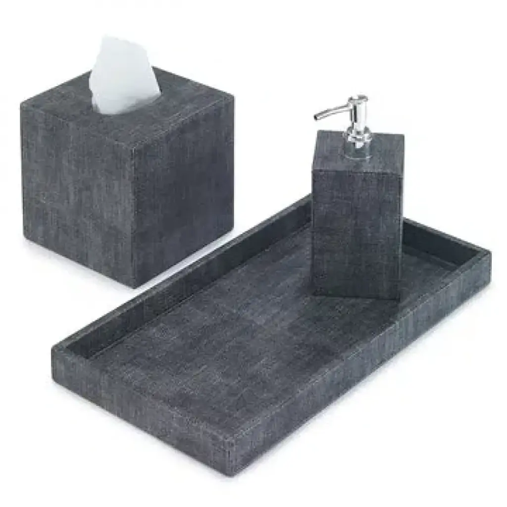 This brand-new easy-care Bath Accessories line features the same luxurious material used in our Luster Placemats. This collection will bring a touch of sophistication to your room and make every day feel like a spa day! They are perfect for gifting or for pampering yourself. Available in Tissue Box, Vanity Tray, Soap Dispenser, and Waste Basket.