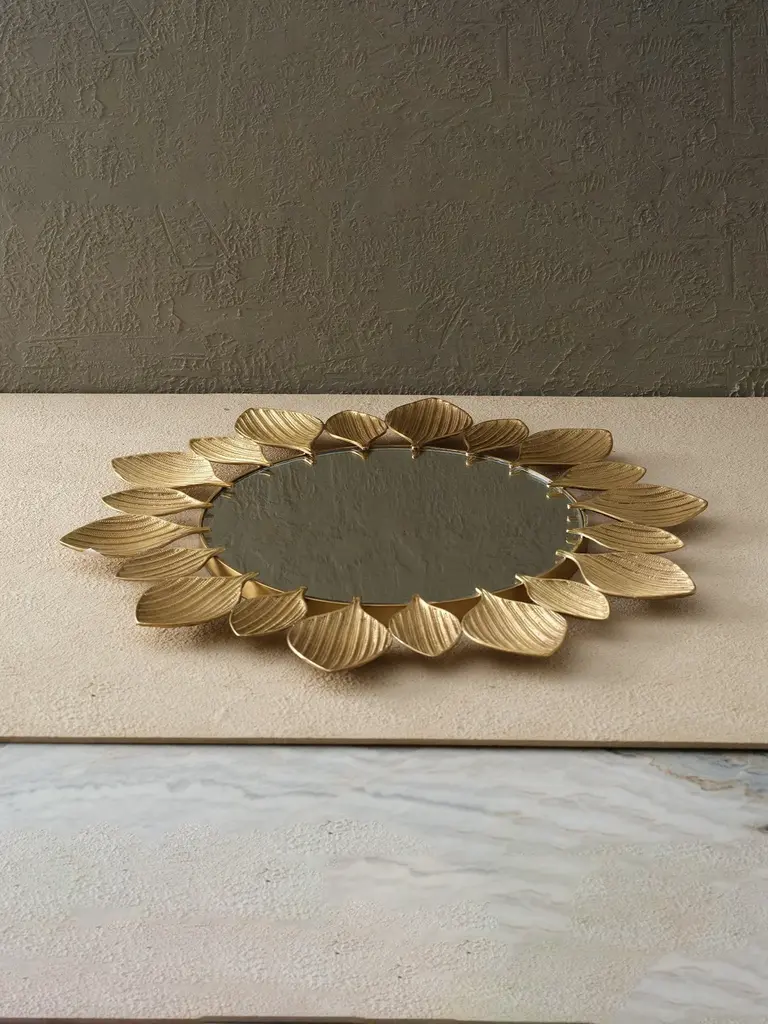 Radiant and sculptural, the Lotus-Inspired Brass Tray with Mirrored Center – Gold Finish brings a sense of harmony and elegance to any space. Designed to resemble the layered petals of a blooming lotus flower, this round tray features a border of textured brass leaves encircling a central mirrored surface. The golden tones and reflective center create a luminous effect, making it ideal for displaying candles, glassware, or statement décor. More than just a tray, it is a decorative centerpiece that captures nature’s grace in a timeless metallic form.