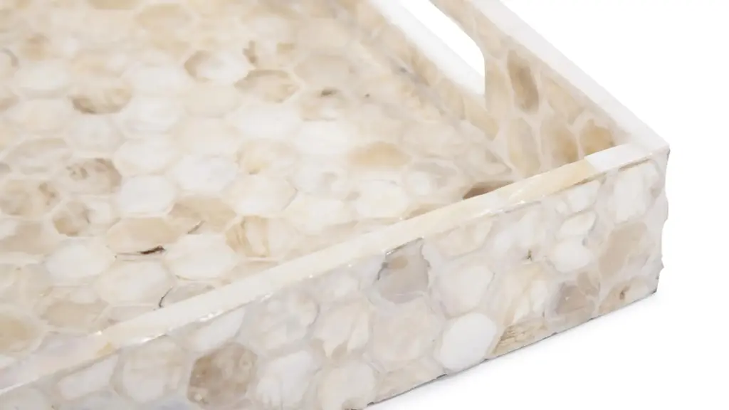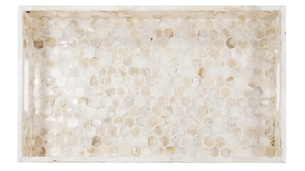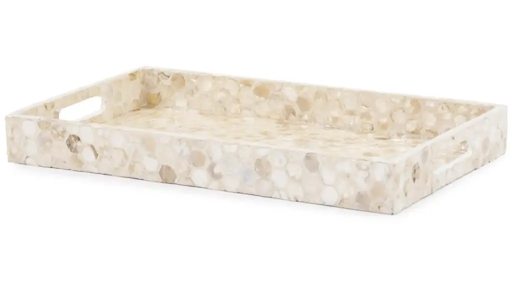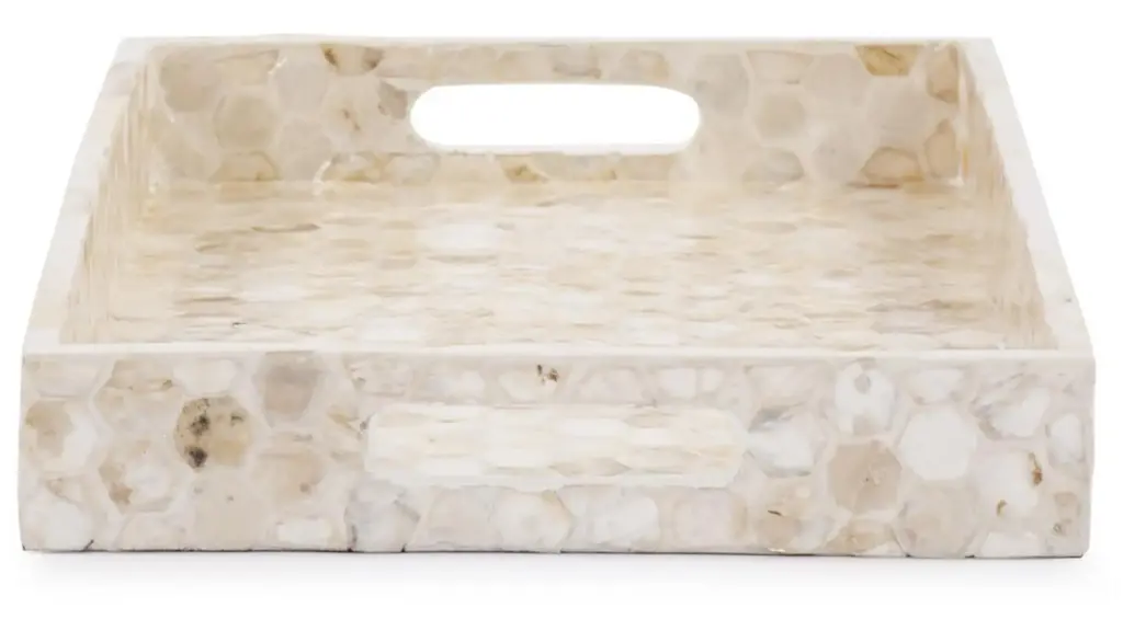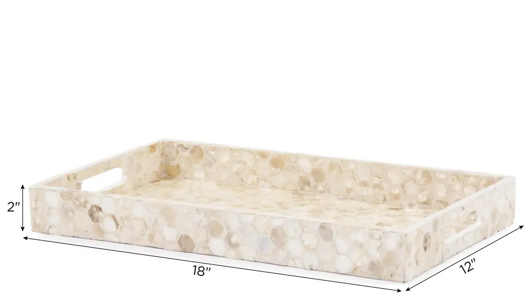 The Lynn Capiz Shell Tray features a simple style fashioned from wood. What sets this piece apart is the pattern of hexagon shaped Capiz shells adorning the piece. The simplicity of the tray allows it to fit right in with any decor style. From Contemporary, to Art Deco; from Transitional to a Coastal look, plus everything in between. This tray features convenient cut out hand holds.