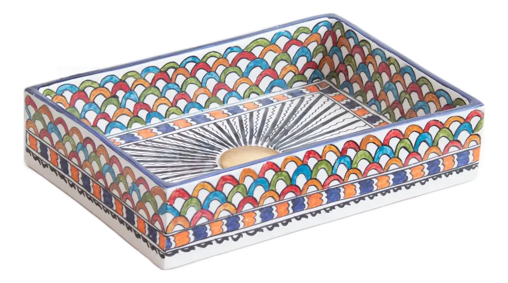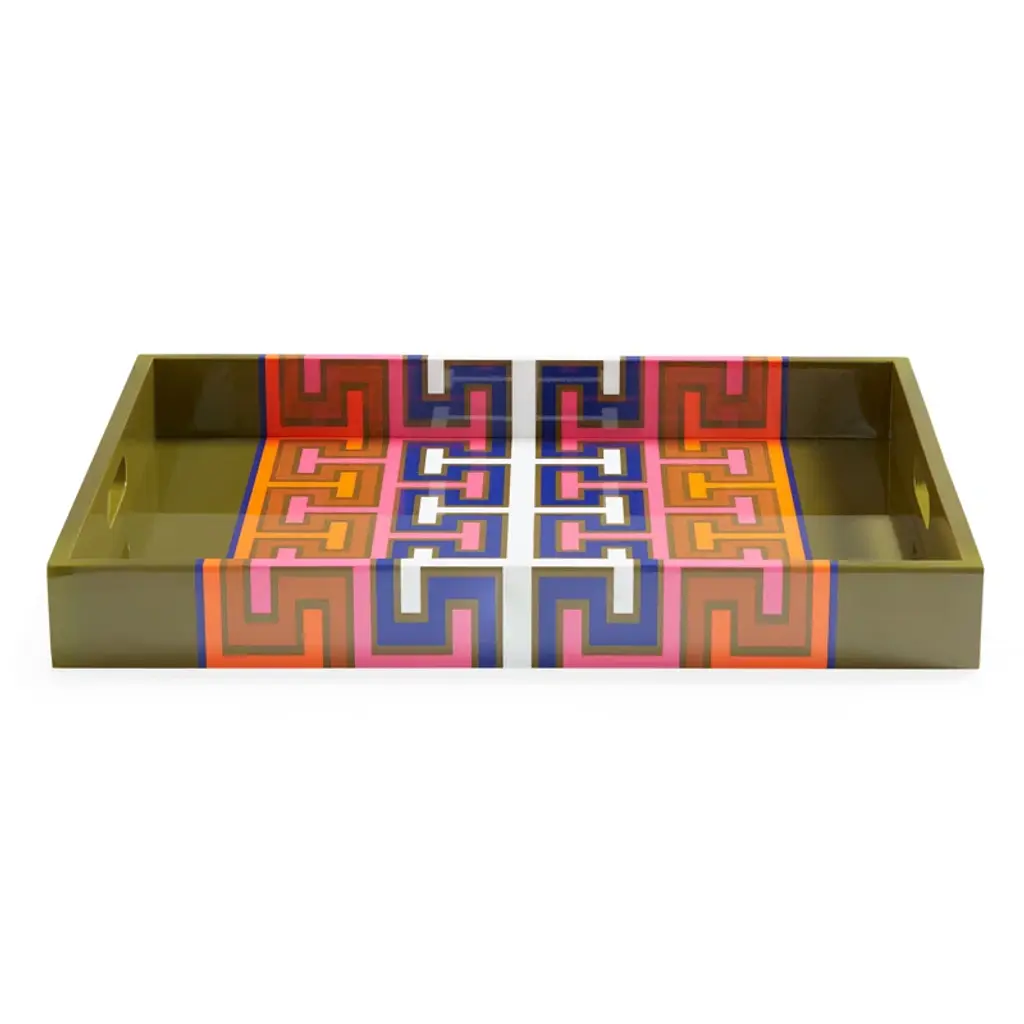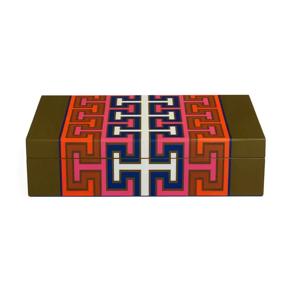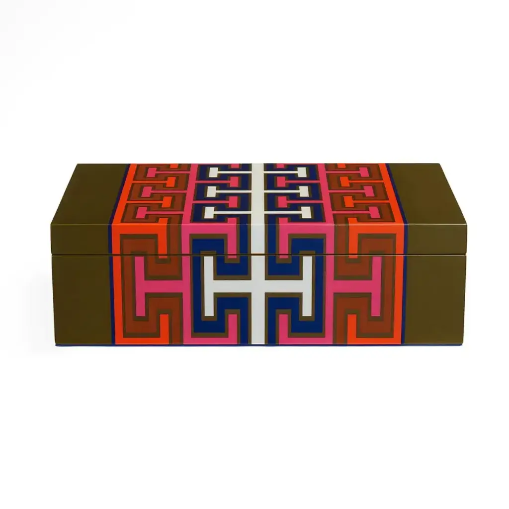 Ultra Vivid. Featuring a bold pattern in vivid cool tones with a white and navy accent down the middle and a hand-finished high-gloss shine. A bold addition to any counter, console, or cocktail table, it corrals your stuff without any fuss.