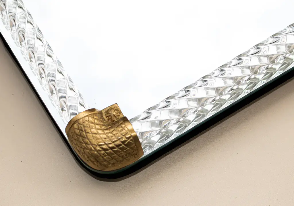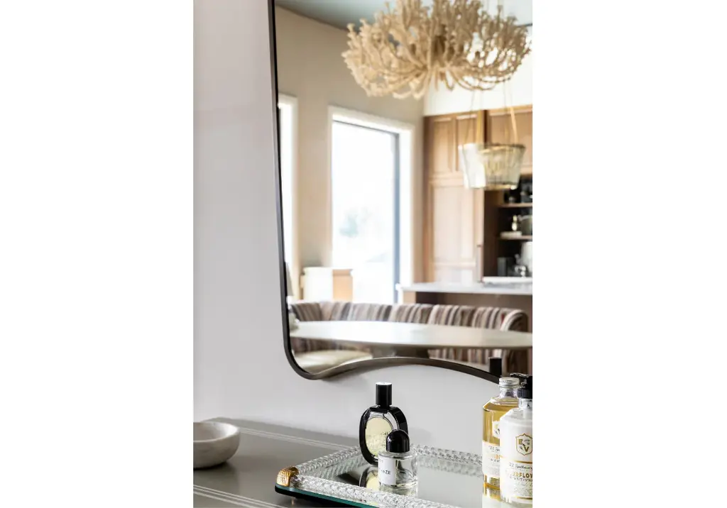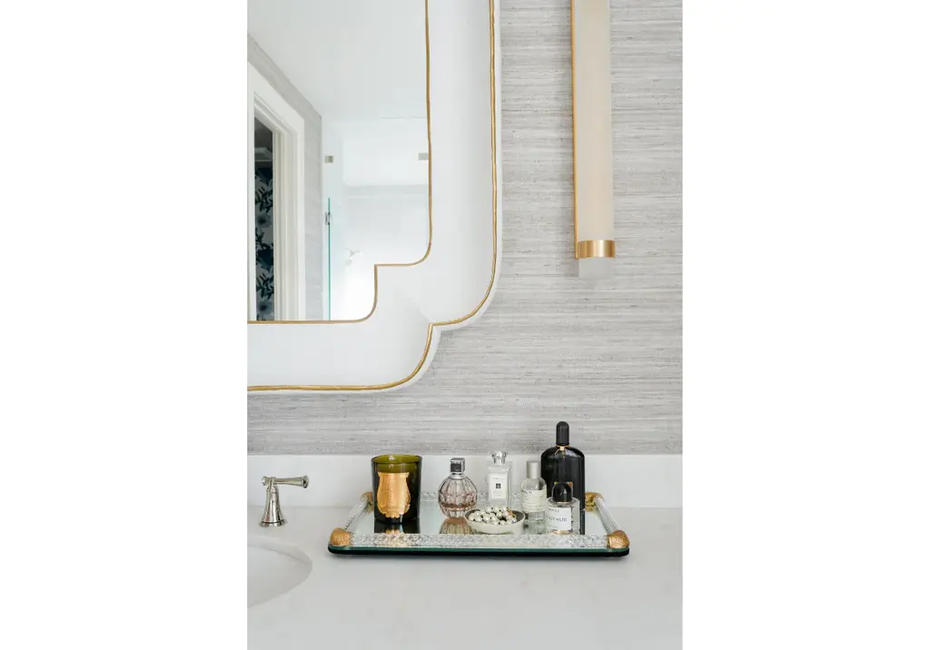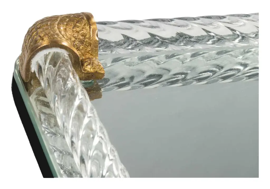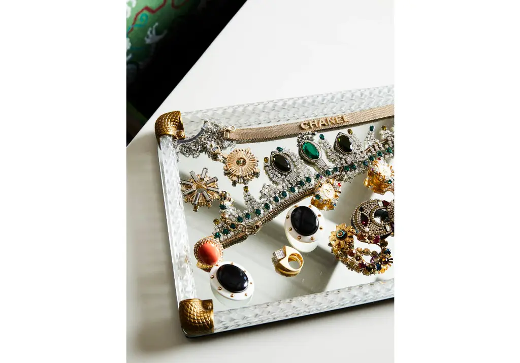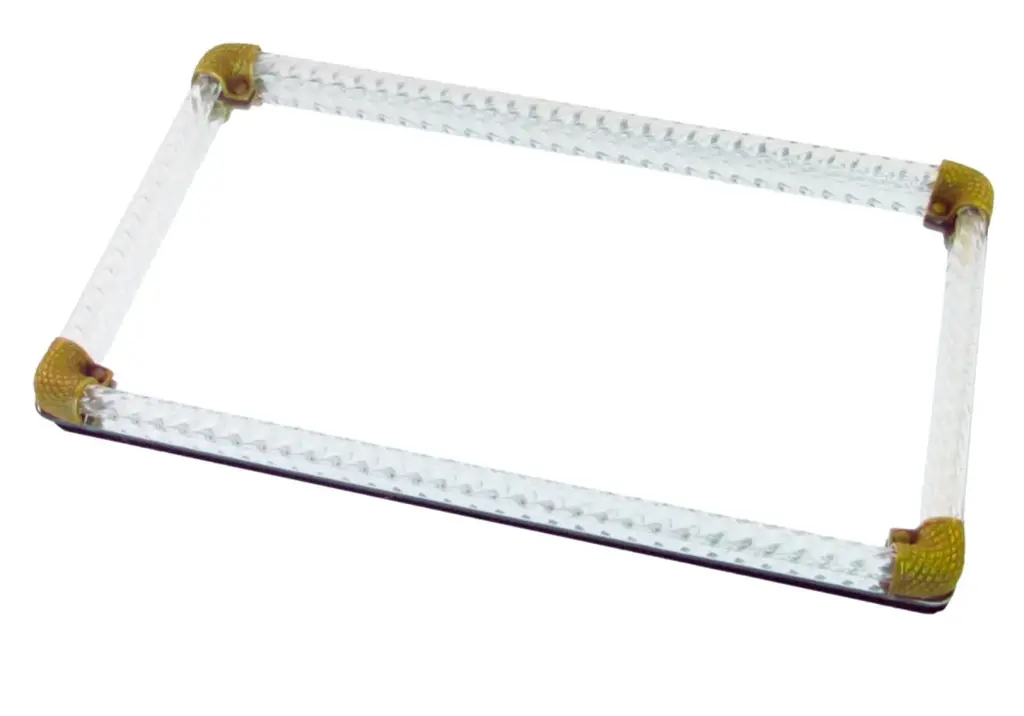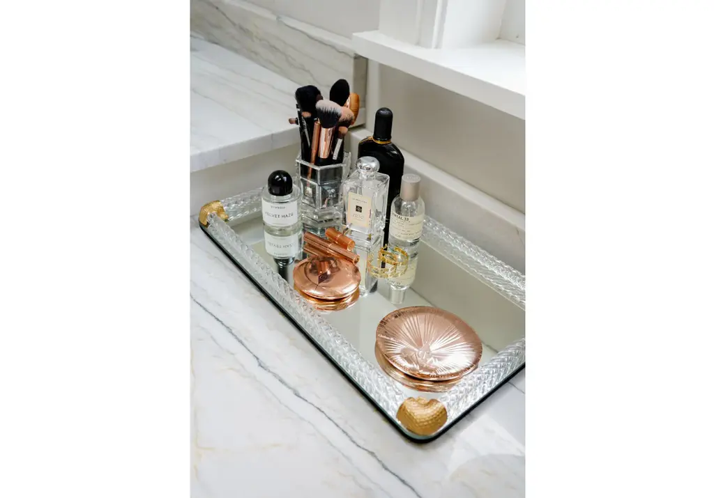 The Maison lends sophisticated elegance with its elongated glass tray enclosed by textured acrylic edging and accentuated by stunning brass corners. It effortlessly styles on a vanity with jewelry or on a coffee table with tabletop decor for an elevated design.