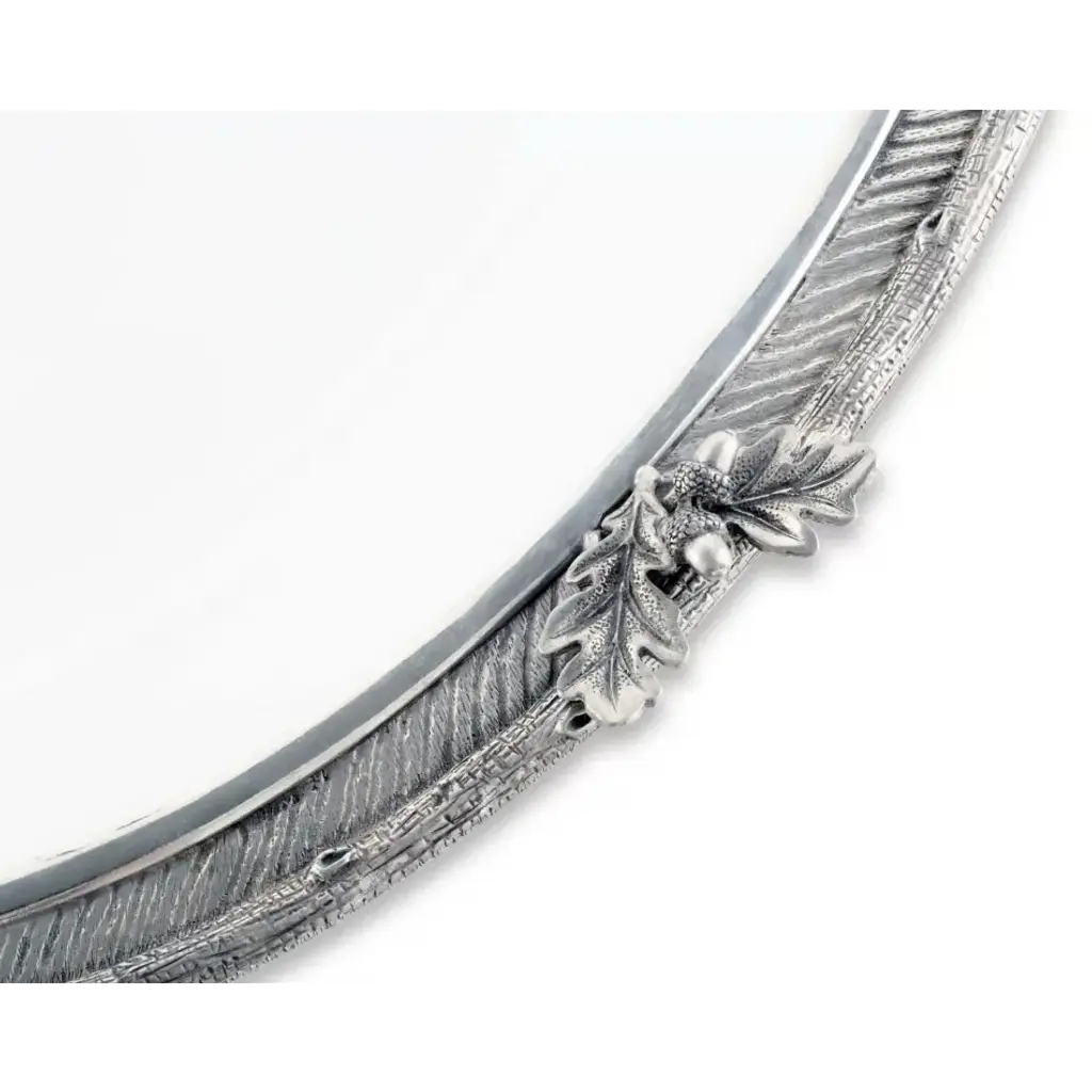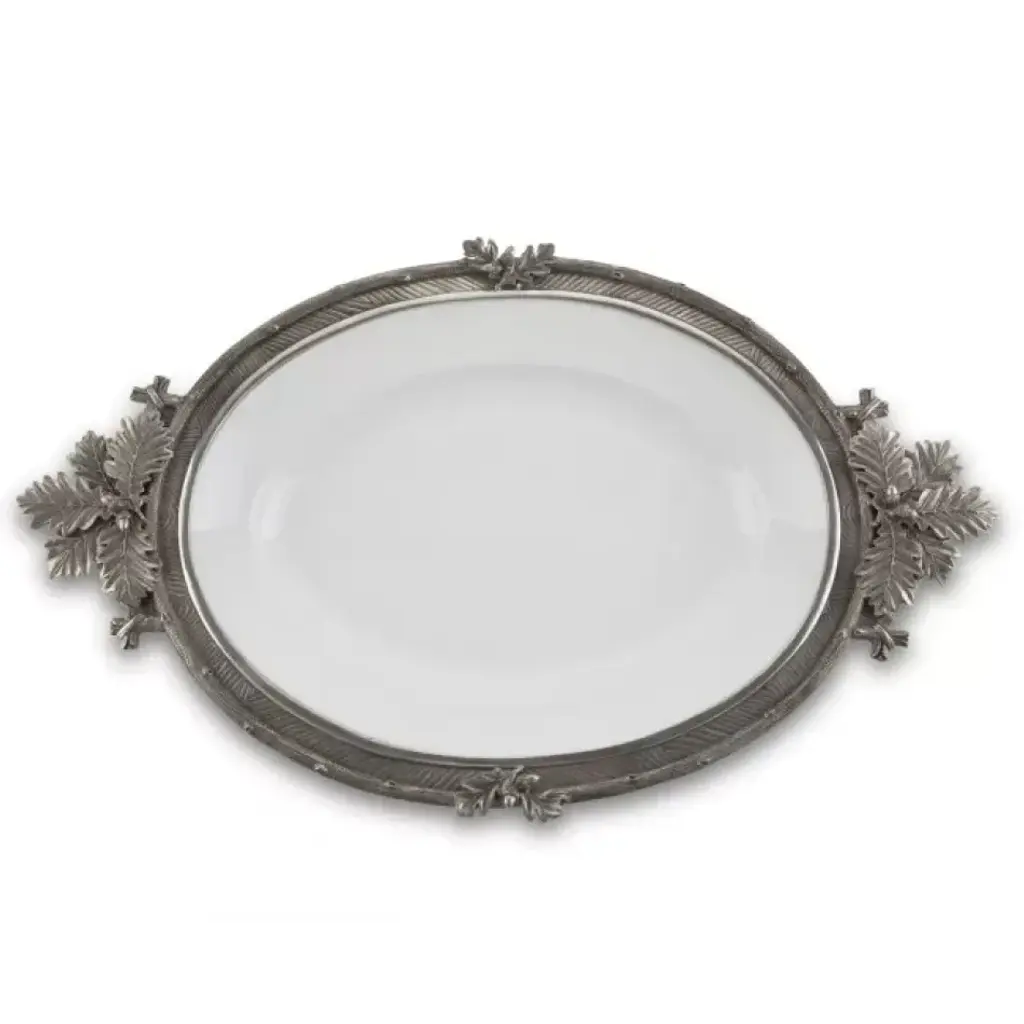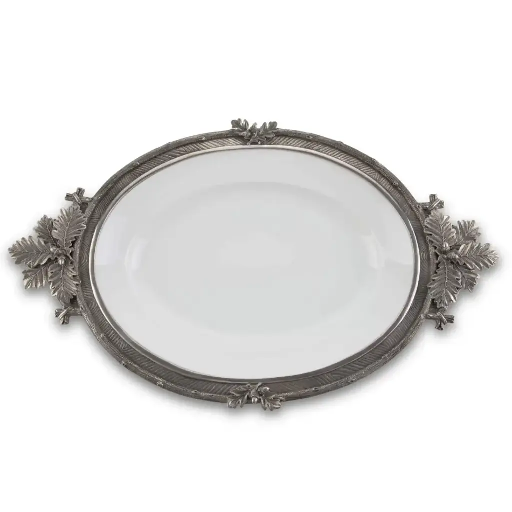 Luxury is in the details and this tray is one of our most luxurious products. The large, double hand-glazed fine stoneware tray nestles in a pure pewter frame with a faux bois grain pattern and handles depicting a spray of intricately detailed acorns and oak leaves. Two additional acorn and oak leaf embellishments further enhance the tray and enchant your guests. A treasure to own and a family heirloom to treasure. Vagabond House is a family-owned American company specializing in fine pewter tableware, servingware and giftware. Largely inspired by nature, their exclusive products are designed to be unique, functional heirlooms for those who seek to express tradition and style in both family and formal entertaining.