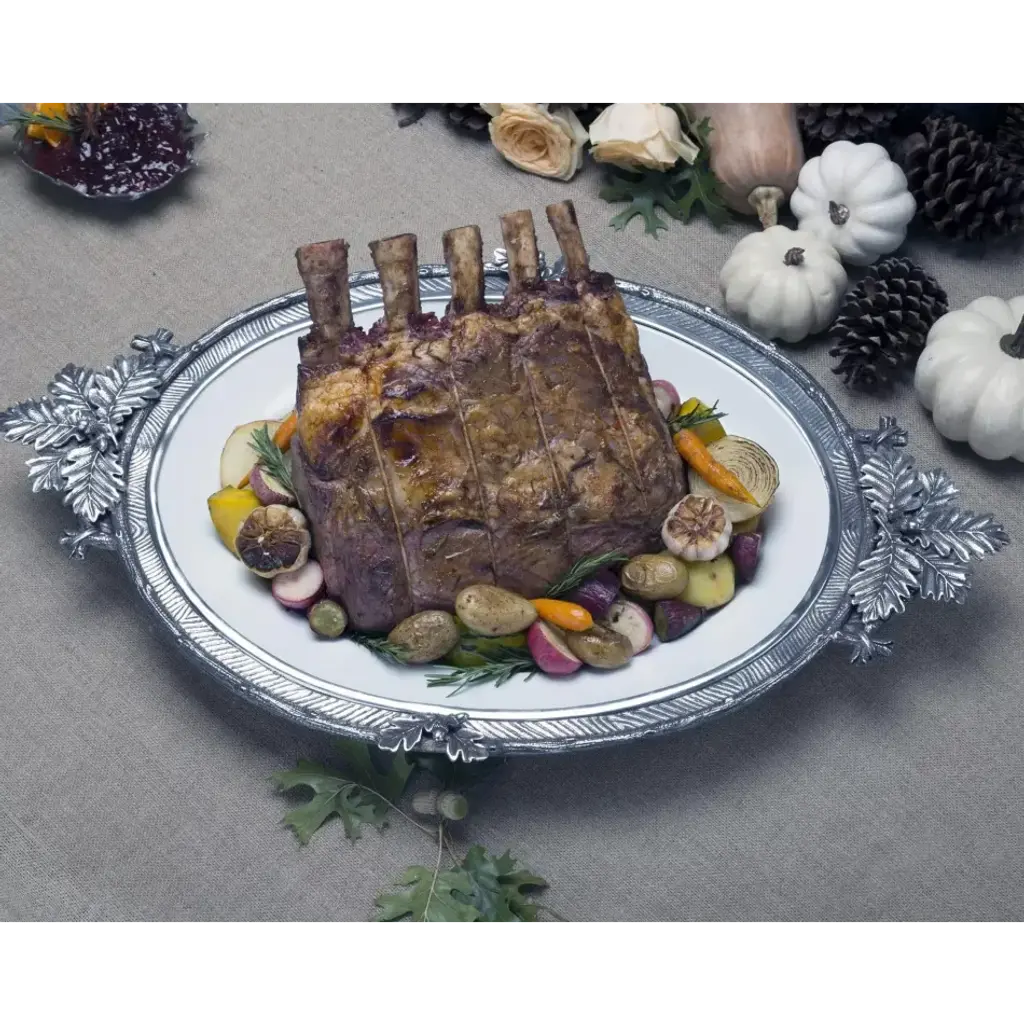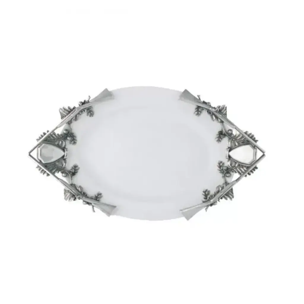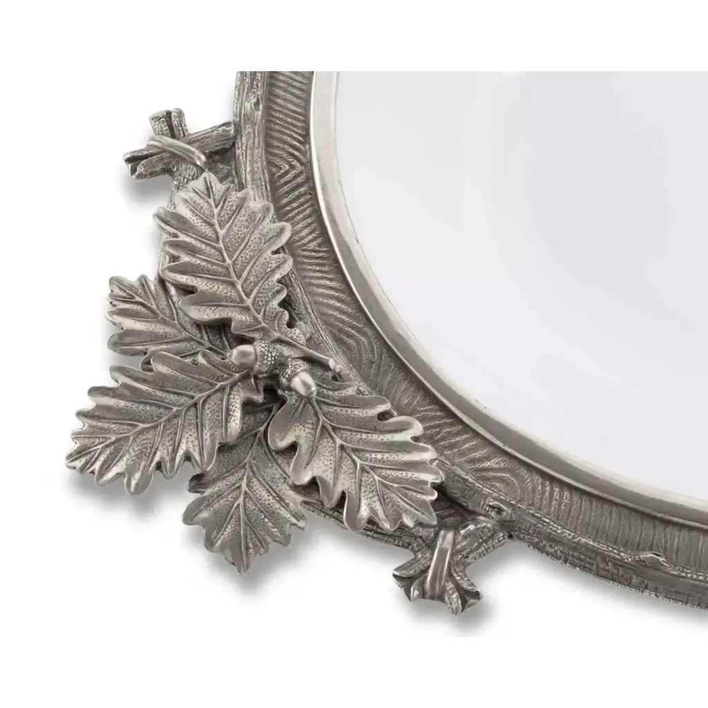 Luxury is in the details and this tray is one of our most luxurious products. The large, double hand-glazed fine stoneware tray nestles in a pure pewter frame with a faux bois grain pattern and handles depicting a spray of intricately detailed acorns and oak leaves. Two additional acorn and oak leaf embellishments further enhance the tray and enchant your guests. A treasure to own and a family heirloom to treasure. Vagabond House is a family-owned American company specializing in fine pewter tableware, servingware and giftware. Largely inspired by nature, their exclusive products are designed to be unique, functional heirlooms for those who seek to express tradition and style in both family and formal entertaining.