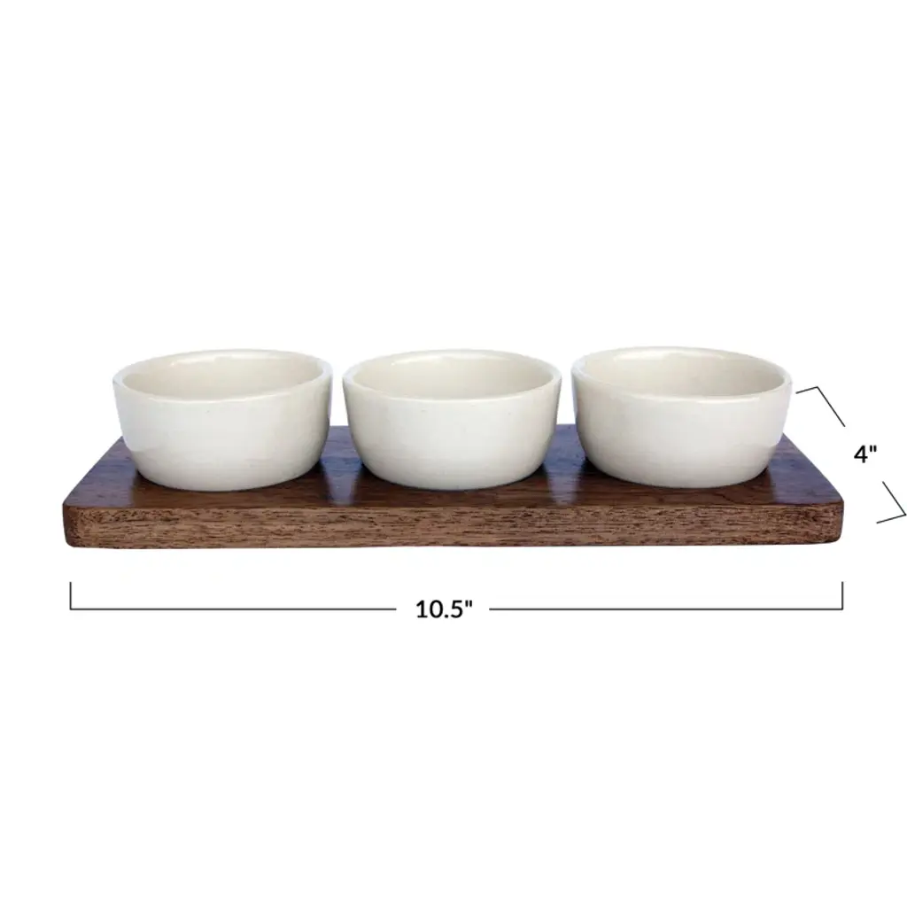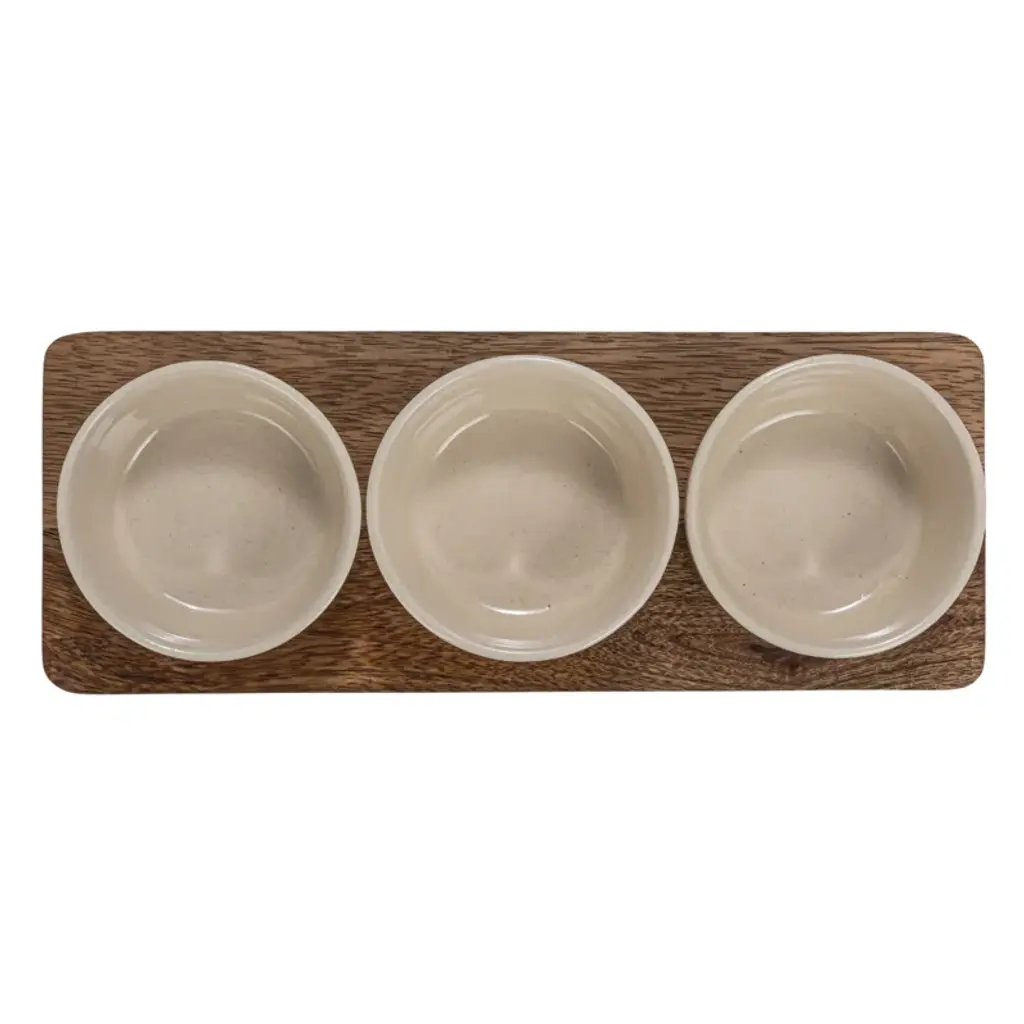 This stoneware bowl with a mango wood tray set is a wonderful way to add warmth and charm to the home. The bowls are made of stoneware that has a cream color and a smooth surface. The bowls are round and ideal for serving or displaying dips, sauces, nuts, or candies. The bowls also come with a natural mango wood tray with a handle for easy carrying and serving. The tray also adds some contrast and texture to the bowls. The set measures 10.5 inches in length and 4 inches in width, and each bowl holds 2 oz of liquid. Use this set for any farmhouse, lodge, Scandinavian, cabin, or casual-style home. This stoneware bowl with mango wood tray set is a versatile and beautiful piece that will make the meals more enjoyable and inviting.