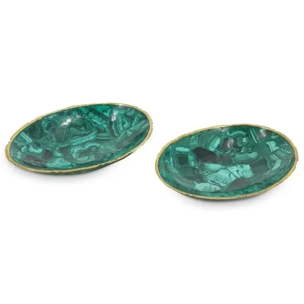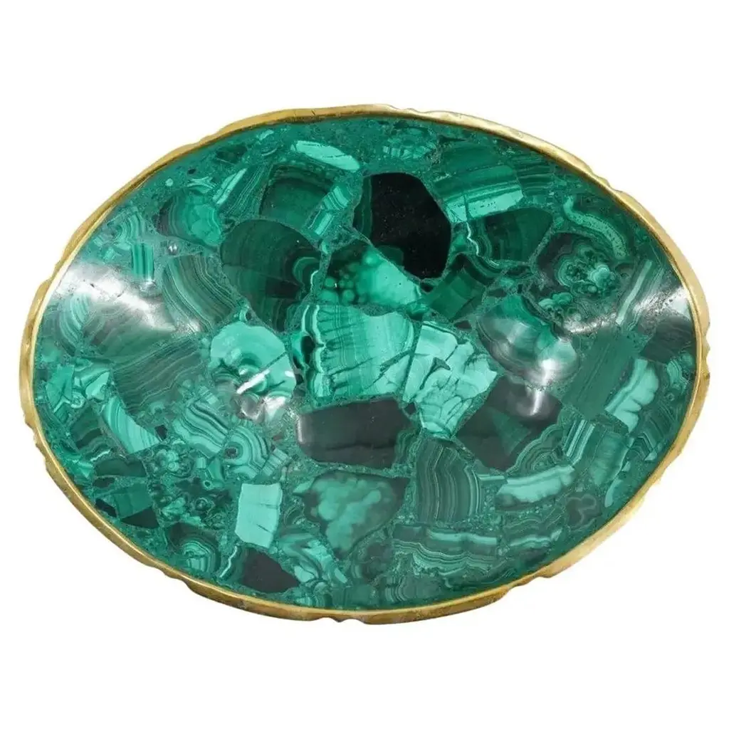 Oval malachite catch-all tray with brass rim. The vintage videpoche bowl (2 available for sale separately) are decorated with shaped gilt rims. The rich emerald hues enhanced by the golden accents add a luxurious touch to any home.In excellent condition without cracks or chipping.