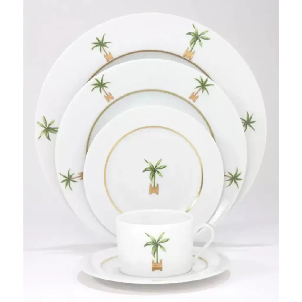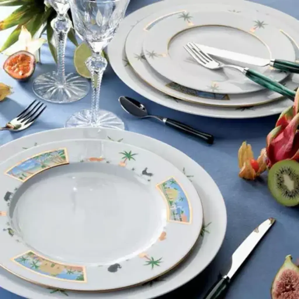 This whimsical dinnerware collection features scenes from island life in the Caribbean and Maldives. The charming decorations are an invitation to travel, a one-way ticket to a sunny destination. Five piece place setting includes dinner plate, dessert plate, bread & butter plate, teacup and saucer. Founded in 1826, Deshoulières is the leading French porcelain maker today. Their fine white Limoges porcelain is strong enough for everyday use. Their style is well known around the world. The painters and decorators have generations of knowledge. Inspired by trends from both interiors and fashion, their patterns are always refined. Deshoulières embodies a true spirit of French style. With their new collections, Deshoulières delights everyone from homeowners to professional chefs. Invite elegance to your table with Deshoulières.