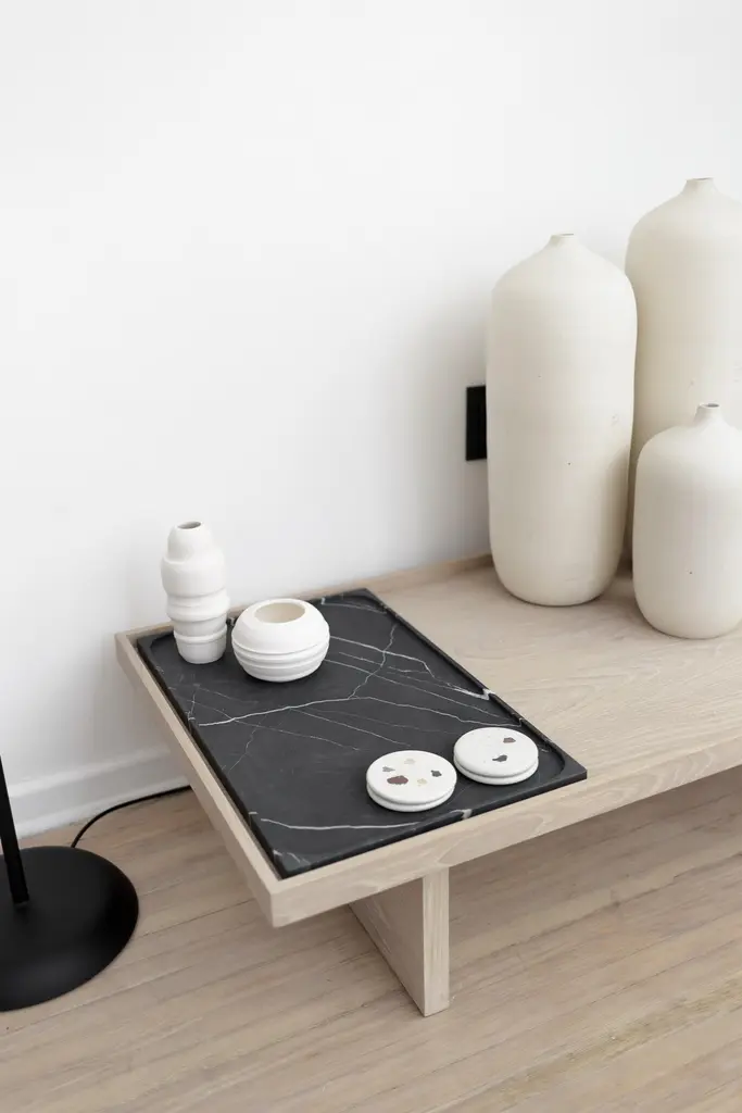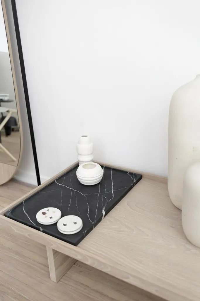 Monterrey black marble serving tray. Production time: 6-8 weeks for items without marble / 13-14 weeks for marble pieces. Shipping +10 additional business days. Casa Quieta uses natural materials such as woods, stones, fabrics etc. These materials may vary in tone, veining, and cavities due to their natural origin. This is part of the inherent beauty of materials and is not considered a flaw. Due to the artisan nature of our production process, there is a +/- 3mm measurement tolerance.