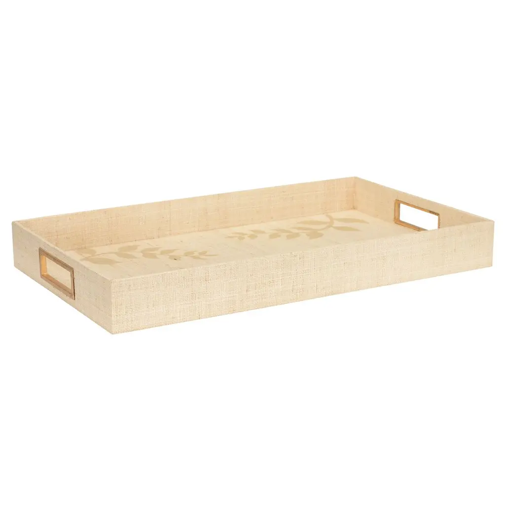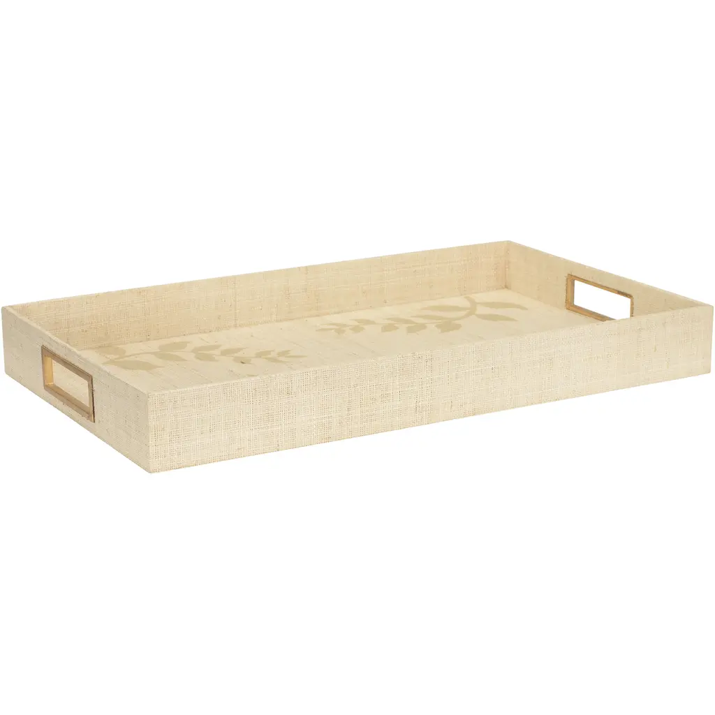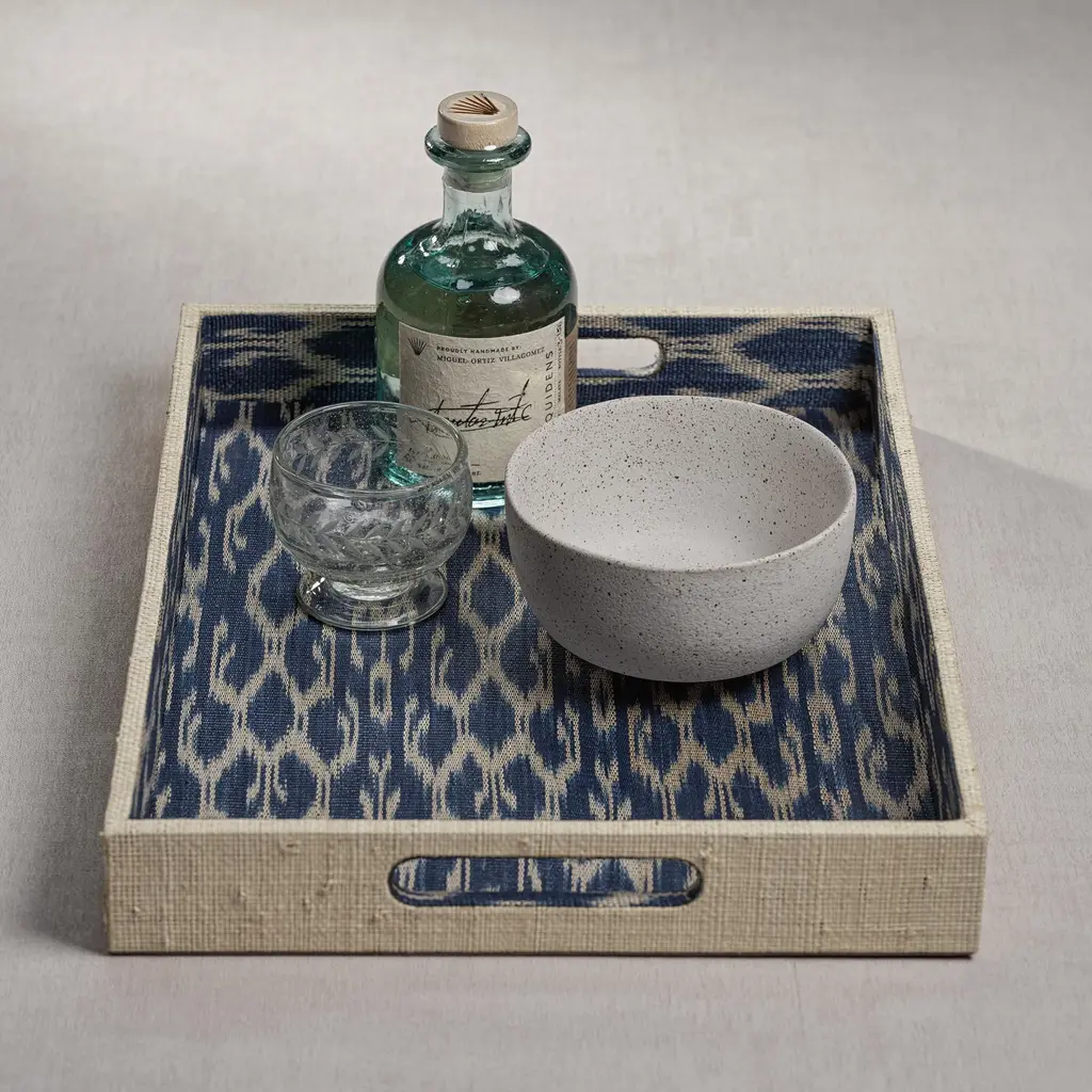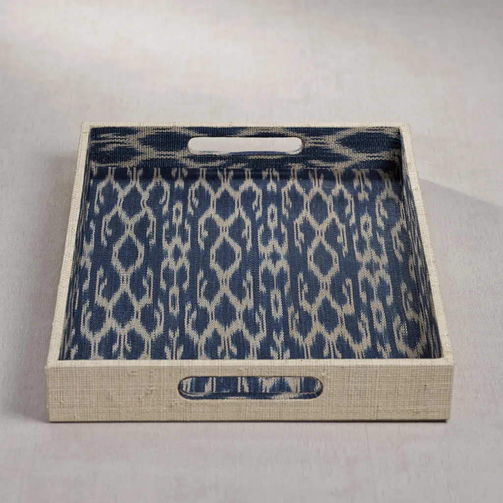 Multifunctional rectangular t'nalak and raffia tray. Whether styling or entertaining , this tray is a useful piece to have in your home. You can use it as a serving piece, or simply display it in a living room or bedroom to hold some of your decorative stuff. Colors: Natural, Blue Material: T'nalak Interior with Raffia Base Ikat pattern design T'nalak interior Raffia base With cut out handles Stunning representation of cultural fusion Care Instructions: Wipe clean with dry cloth