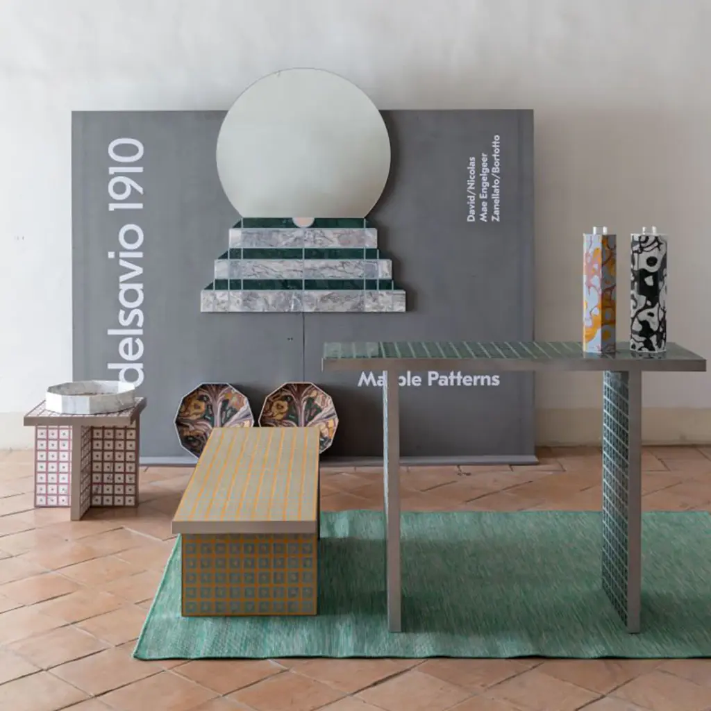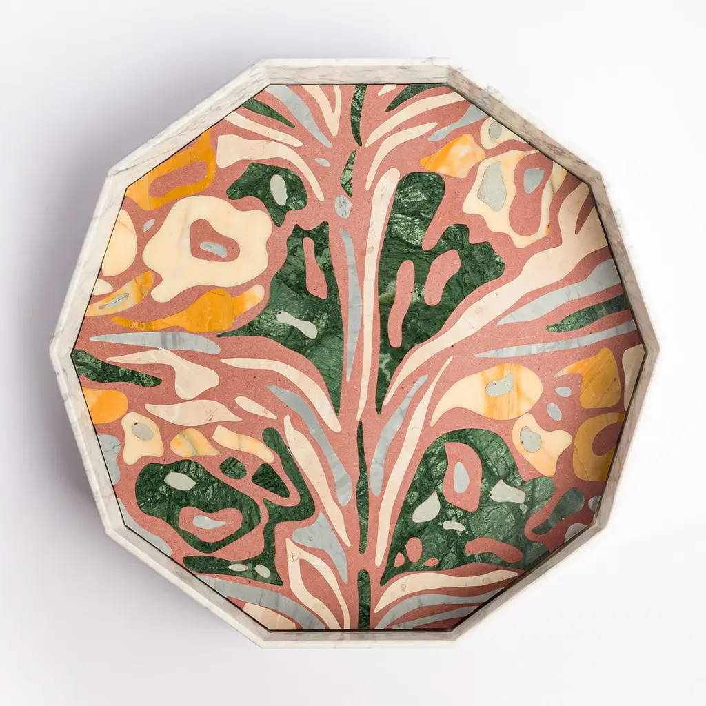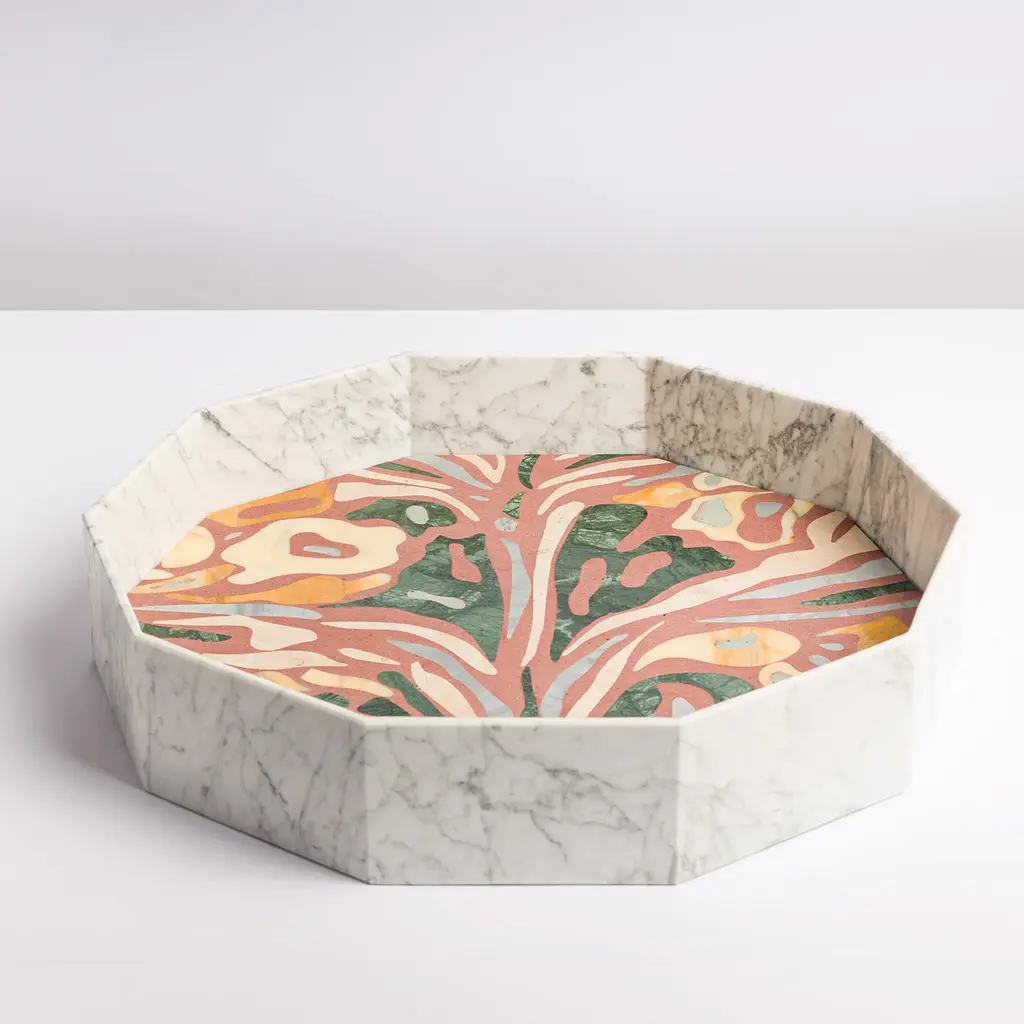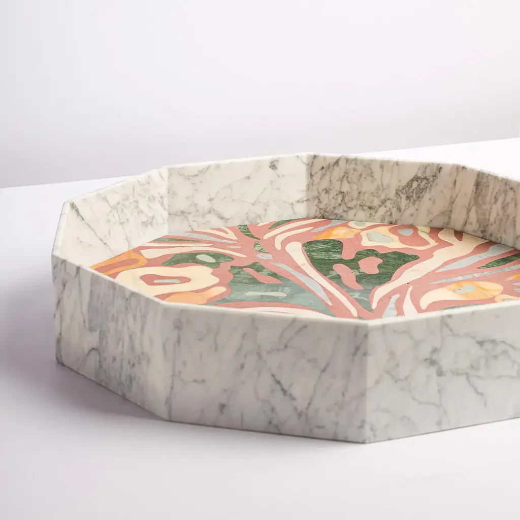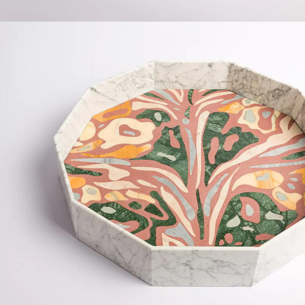 A decagonal-cut marble belt embraces the strikingly decorated bottom of this tray, where multiple marble leftovers and colorful cement resists are combined creating a motif of fluid lines. This stupefying effect is obtained by employing the Eastern paper marbling technique to authentic marble, a playful choice giving birth to a unique material. This piece belongs to the Marble Marbling Collection, other pieces are available in the Artemest catalog.