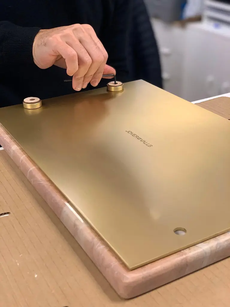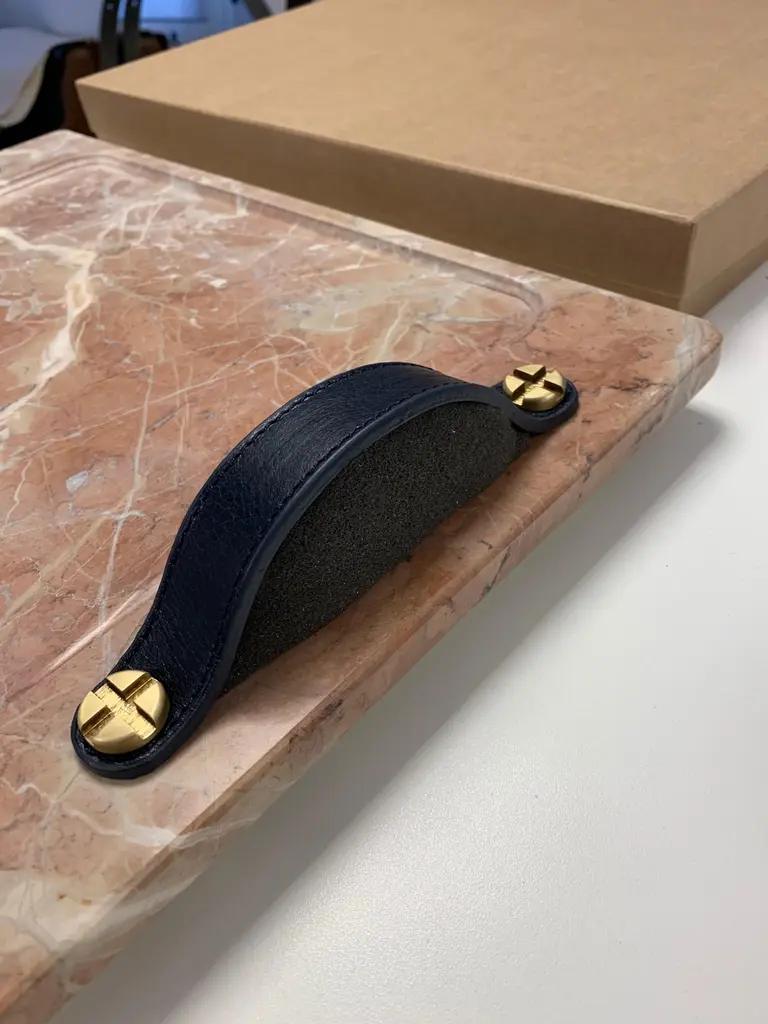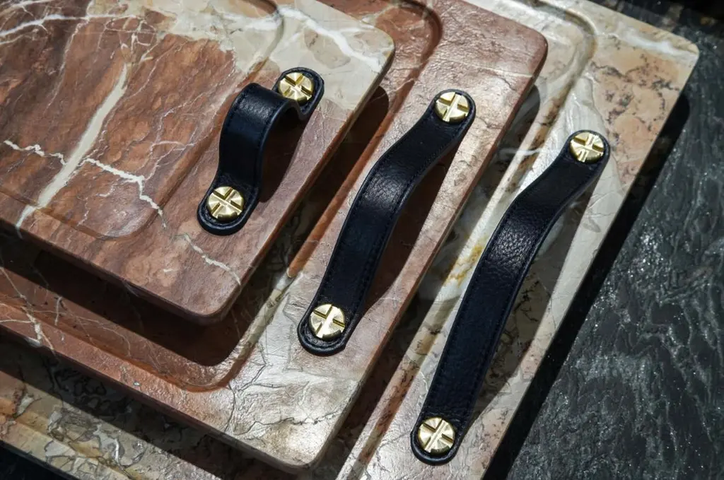 Marble trays with leather straps and brass bottom reinforcement. Leather tips on the legs to avoid scratching surfaces. Marble is a non-foliated metamorphic rock composed of recrystallized carbonate minerals, most commonly calcite or dolomite.