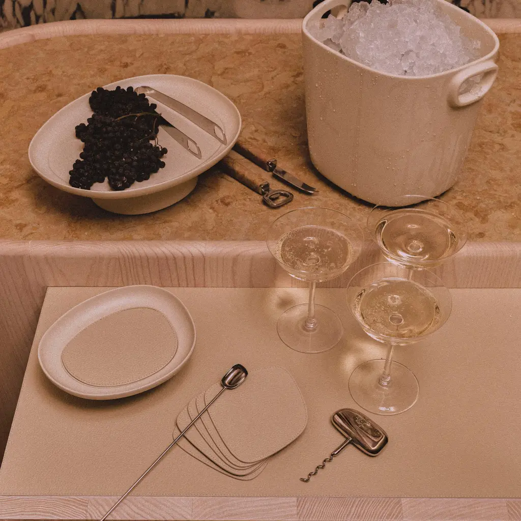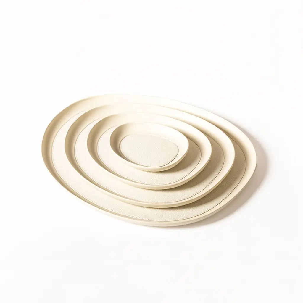 Embodying the essence of organic design with their wave-like, nestable forms that seamlessly stack together, the Maris Round Trays are perfect for both display and service. The pieces are crafted of enameled aluminum and with a removable leather inlay.