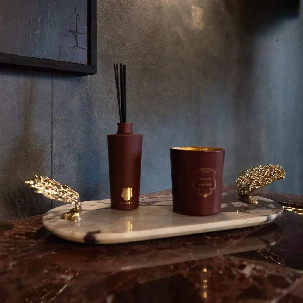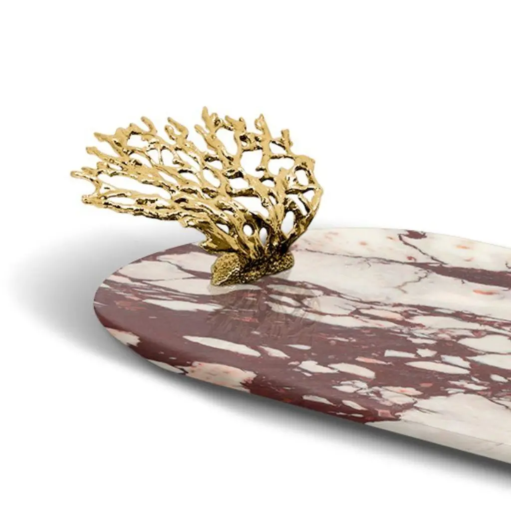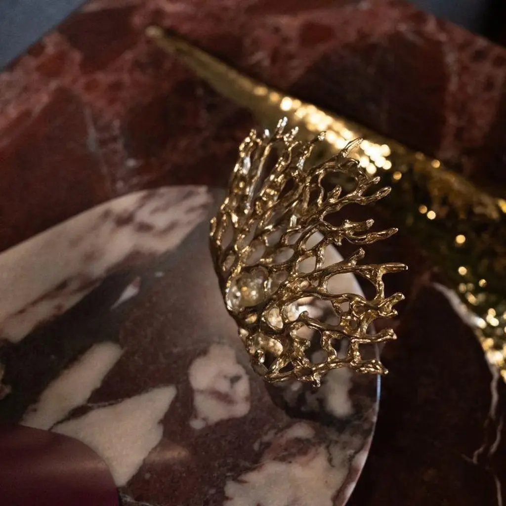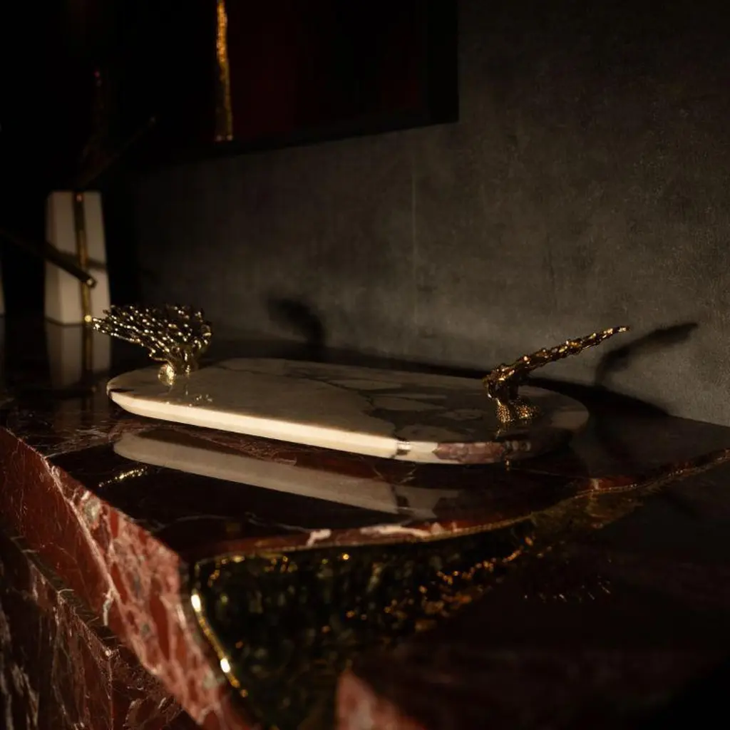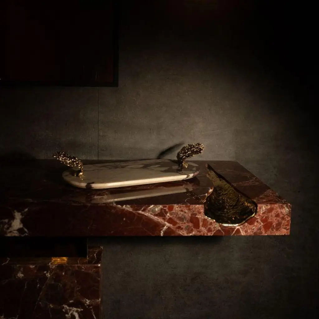 The Maris Tray with Calacatta Viola marble is a bold and poetic reinterpretation of an iconic piece. With its fluid brass structure, inspired by the rhythms and textures of sea life, this tray brings organic elegance into a sculptural form.The addition of Calacatta Viola marble, known for its expressive veining and dramatic violet tones, introduces a powerful visual contrast that enriches the piece with emotive intensity and refined character. Whether styled as a centerpiece, used for hosting, or displayed on its own, this version of the Maris Tray invites both admiration and contemplation.It embodies the essence of MAEVE: a deep respect for craftsmanship, material beauty, and timeless design. A piece that transforms its function into an artful gesture of presence.