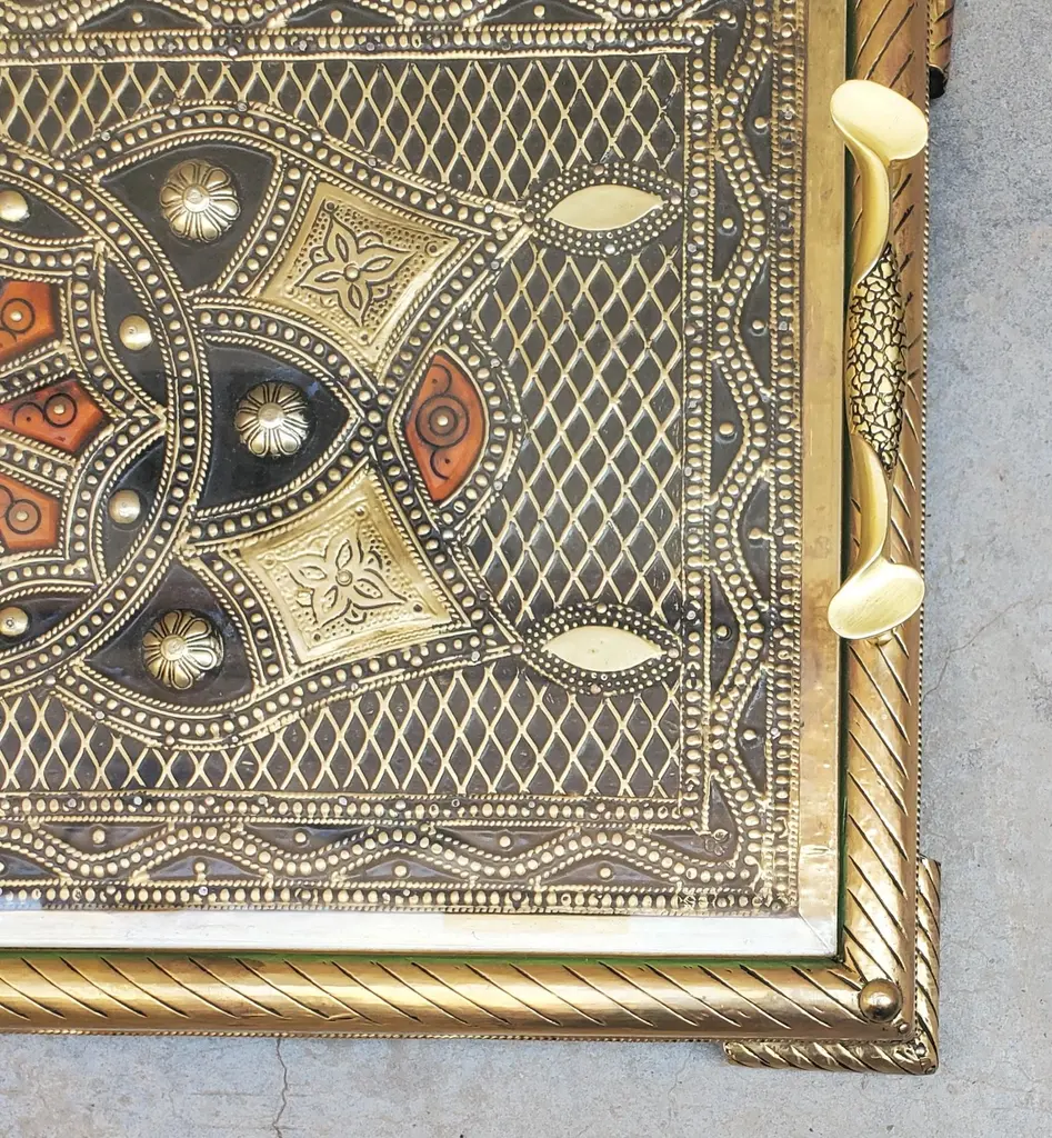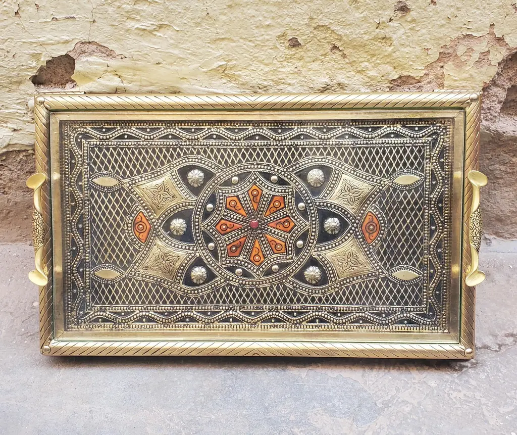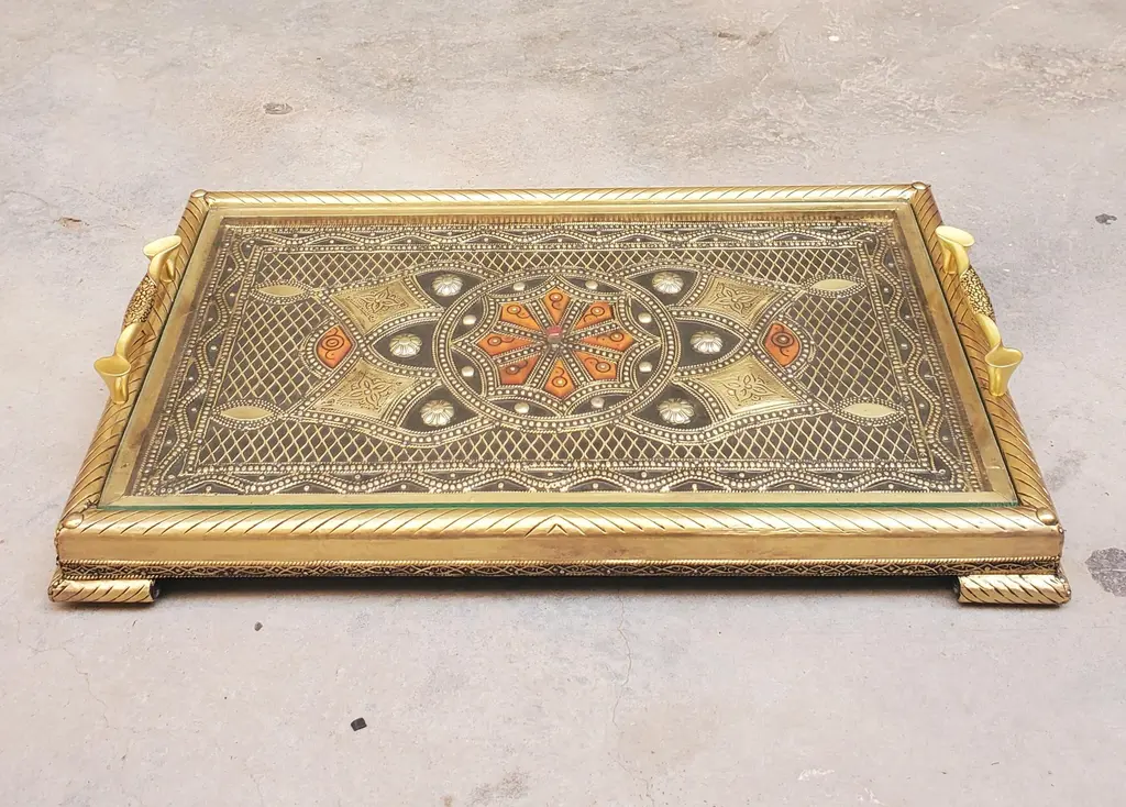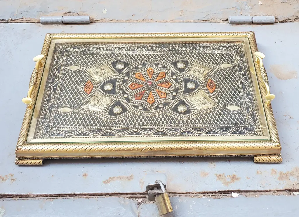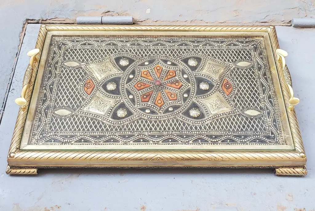 A new arrival. This amazing metal inlaid gold finish Moroccan serving tray measures approximately 18″ in length and 11″ in width. Height is about 2" (3" handles included). A glass top is already added for extra protection. Adorned with resin fragments. A total of 2 handles (1 on each end) makes this stunning tray easy to use and move around. Very intricate and detailed work was put in to make it a great addition to your home décor or office. This item is handmade, and some imperfections may apply, but that only adds to its charm and beauty.