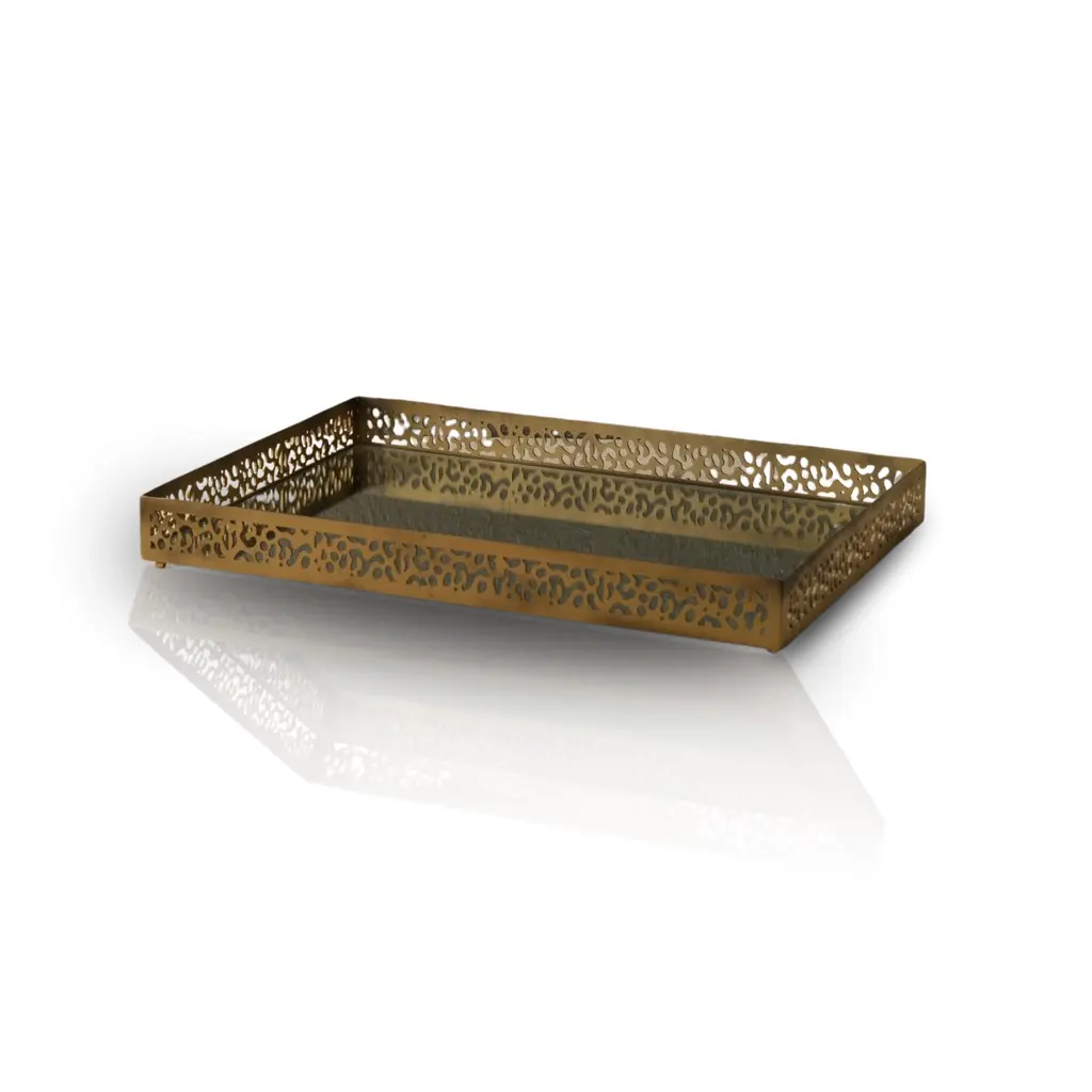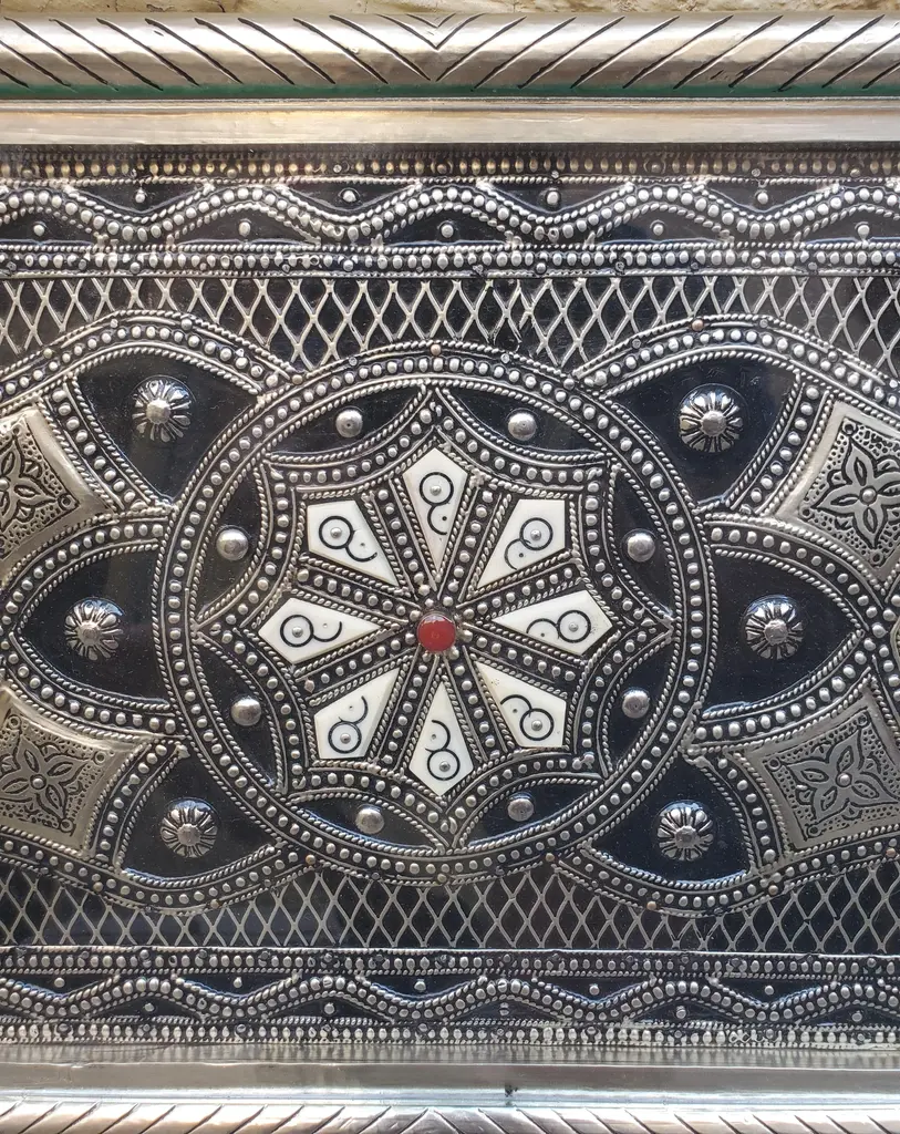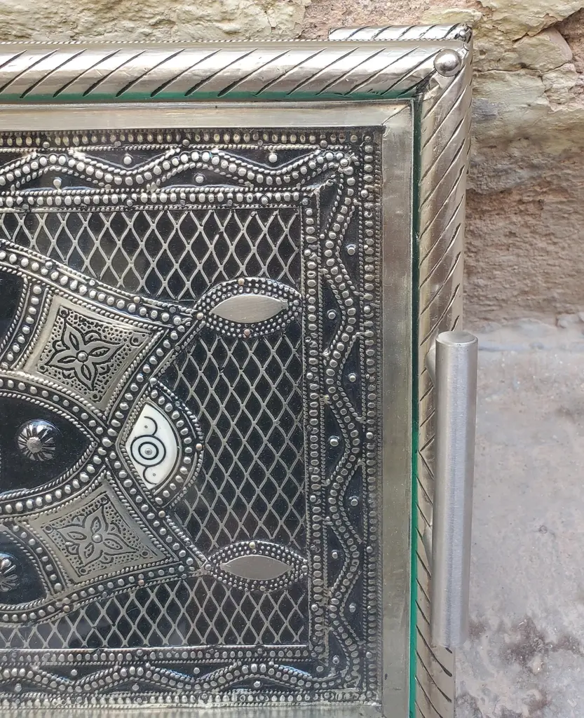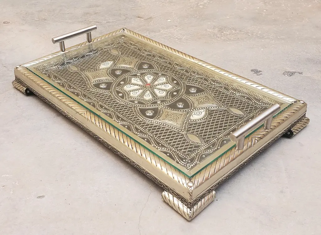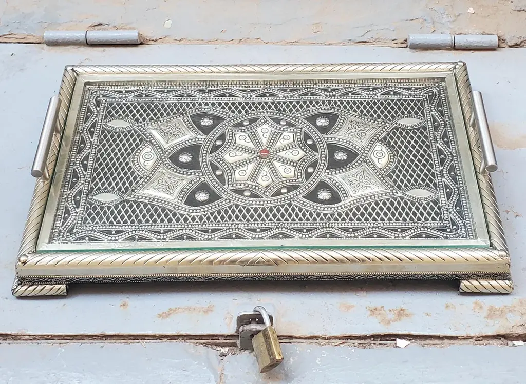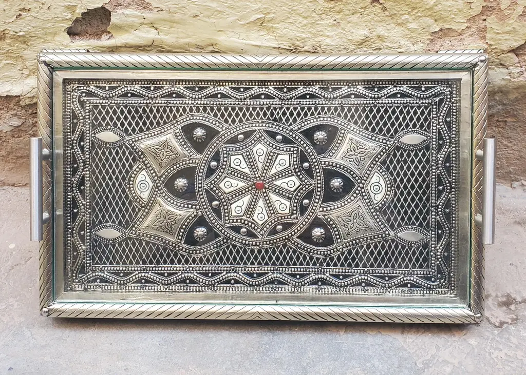 A new arrival. This amazing metal inlaid silver finish Moroccan serving tray measures approximately 18″ in length and 11″ in width. Height is about 2" (3" handles included). A glass top is already added for extra protection. Adorned with some resin fragments. A total of 2 handles (1 on each end) makes this stunning tray easy to use and move around. Very intricate and detailed work was put in to make it a great addition to your home décor or office. This item is handmade, and some imperfections may apply, but that only adds to its charm and beauty. Add a Mediterranean touch to your home with this piece of art.