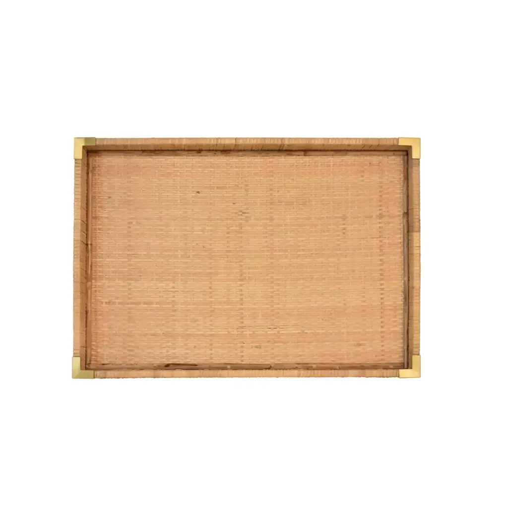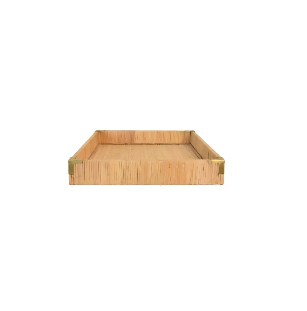 Tommy is the perfect mix of function and flair! The small rectangular tray feature natural rattan wrapping with elegant brass corners. Keep your belongings organized and add a touch of sophistication to any space. Dimensions: 20.25"W x 2.375"H x 14.125"D *Rattan has natural variations and may differ slightly between panels. Width:20.25" Height:2.38" Depth:14.13"