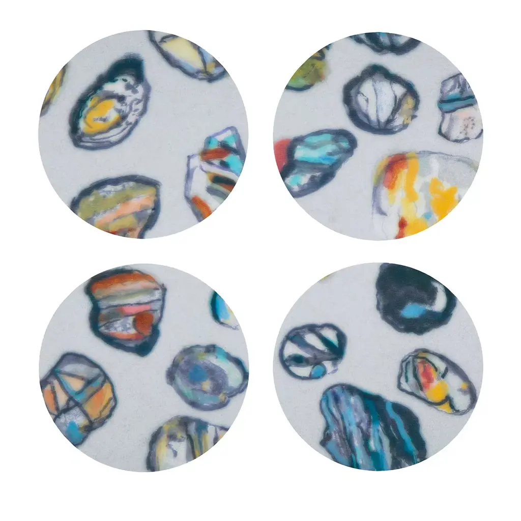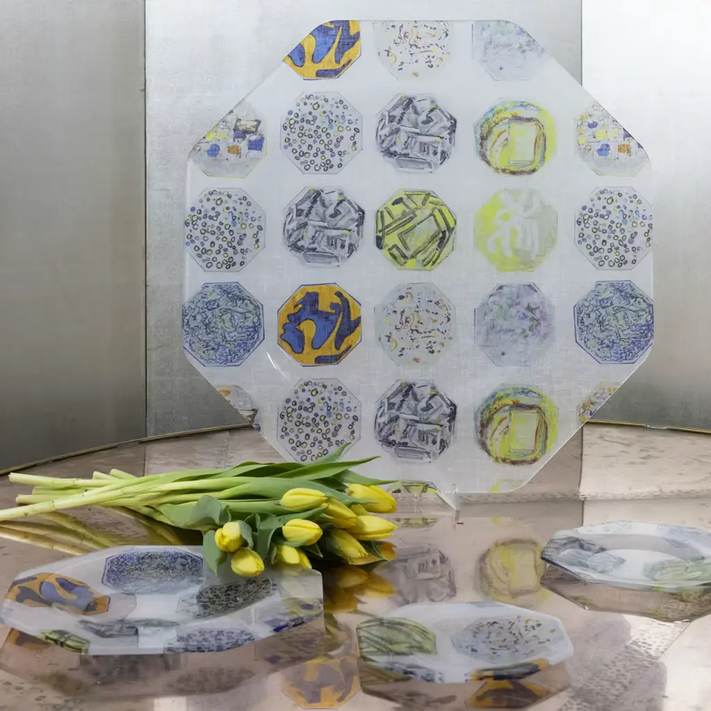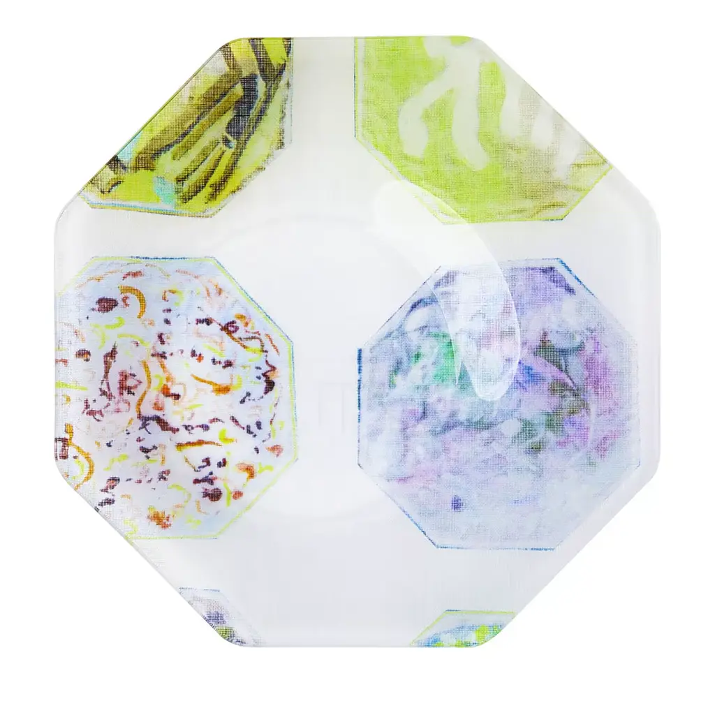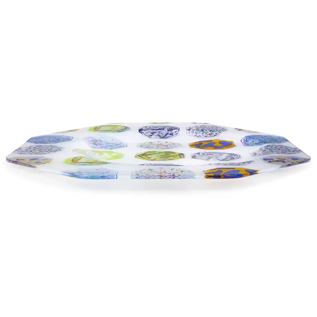 The perfect tray-shape to be held with one hand to be filled with refined finger food. The octagonal shape is asymmetrical with a larger brim for a secure grip. The hollow base is off-center for perfect balance. The crystal-clear material used, methacrylate, is fused together with printed linen, thermo-formed, and finished by hand. Food-certified, impact resistant, dishwasher safe, stackable, handy, and of great impact.