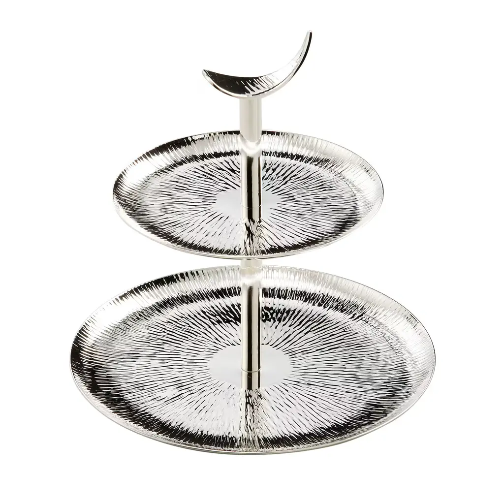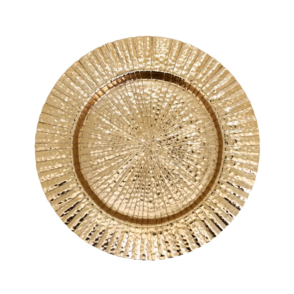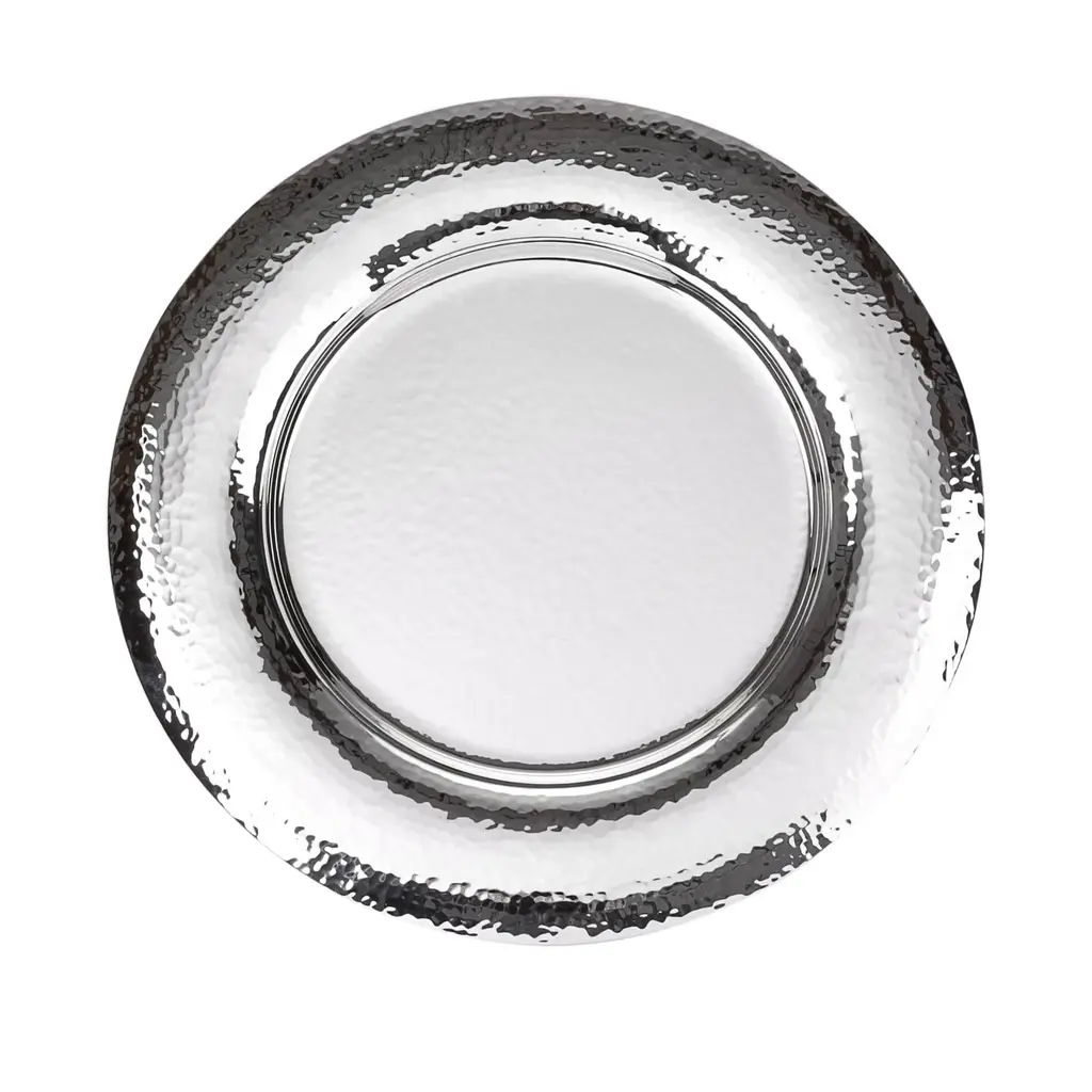 These classic and light round trays make a elegant and rich statement with their 3 dimensional pattern design. Crafted in aluminum, each has a elegant shiny silver patina that shows off just perfectly the hammered texture on the surface.