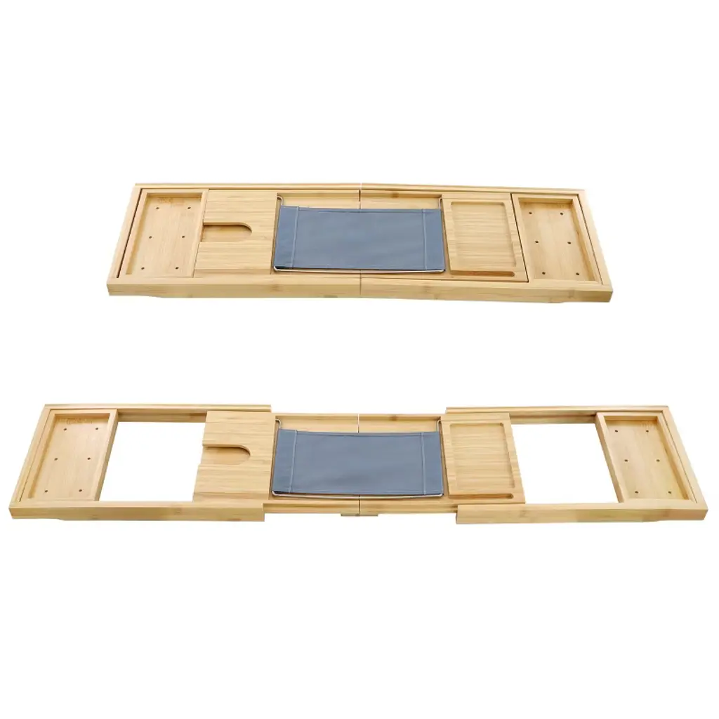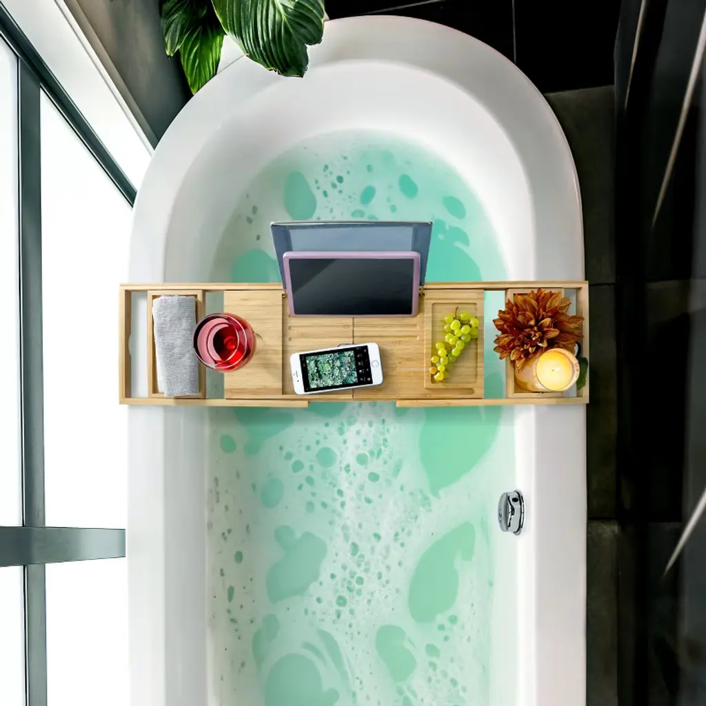Transform your bath into a spa-like retreat with the MegaChef Expandable Bamboo Wood Bath Tray. Made from premium bamboo wood, this elegant bath tray brings both beauty and functionality to your bathroom. Its expandable design adjusts from 29" to 38", ensuring a snug fit for most bathtubs. The tray's foldable construction means you can easily store it when not in use, keeping your bathroom clutter-free. With its natural bamboo finish, this bath tray adds a touch of warmth and sophistication to any bath setup. Designed for ultimate relaxation, the MegaChef Expandable Bamboo Wood Bath Tray includes thoughtful features to enhance your bathing experience. Keep your phone or tablet within reach with the built-in stands, perfect for streaming your favorite show or listening to music while you soak. A convenient wine glass holder slot allows you to sip and unwind without any worries, while the generous center platter space is ideal for candles, bath oils, or your favorite snacks. Additionally, two spa trays offer extra organization for beauty products, candles, or small bath essentials, making this tray as functional as it is luxurious. Whether you're treating yourself to a glass of wine, a soothing face mask, or a quiet moment with a book, the MegaChef Expandable Bamboo Wood Bath Tray is your go-to accessory for creating the ultimate bath experience.