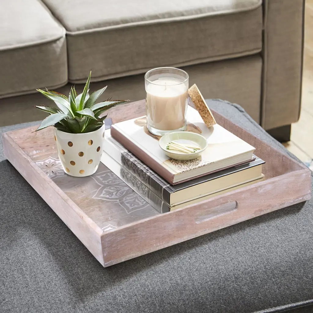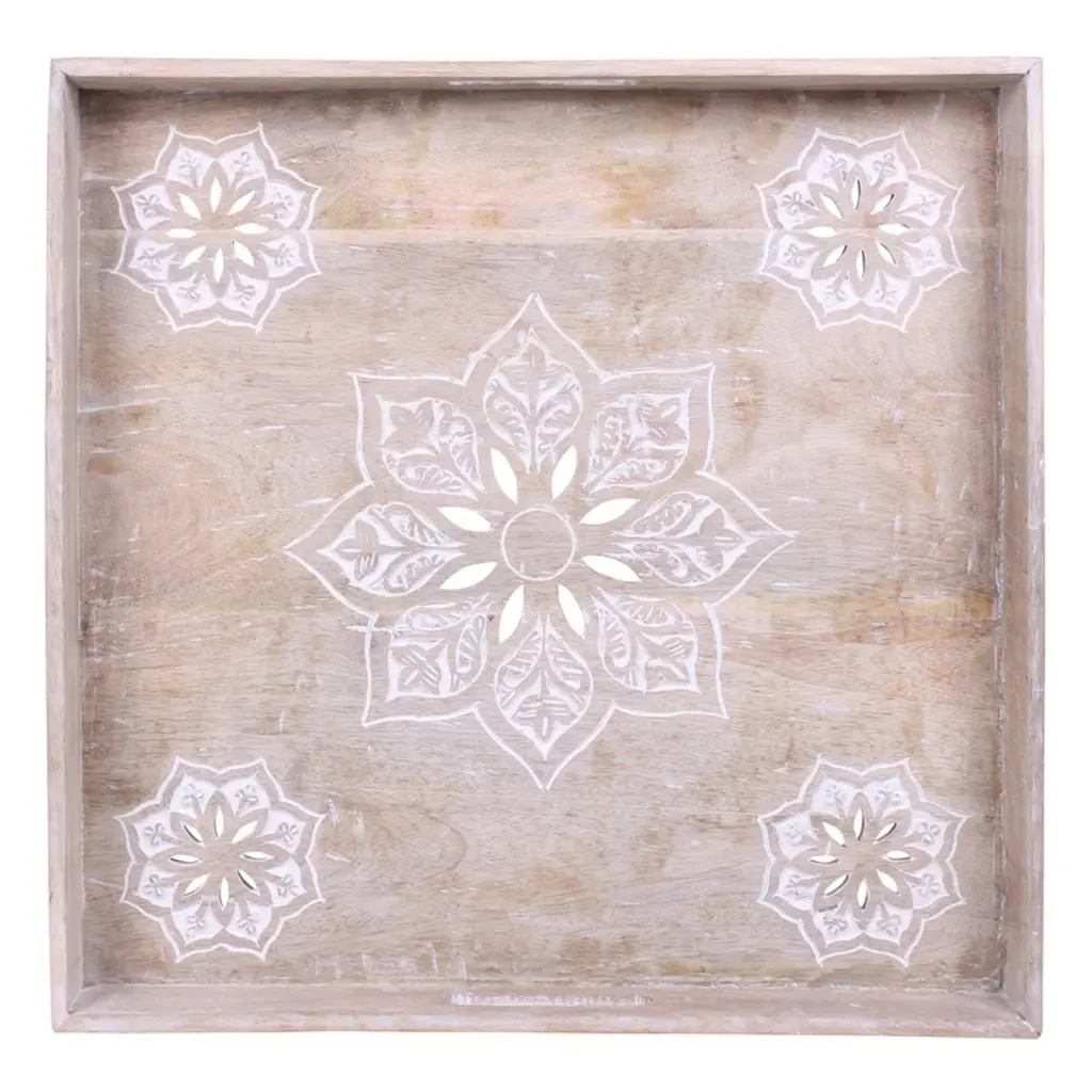 Serena Wooden Tray features premium mango wood material in an elegant white finish. It is equipped with sturdy cut-out handles that make it easy to transport coffee & desserts from the kitchen to the living room. This wood tray offers ample space for serving platters for your guests. You can also use it as an ottoman tray to hold remotes, books, perfumes, or as a catch-all for daily mails and keys. This Decorative Ottoman Table Tray boasts a distinctive design that creates a unique addition to all types of existing decors in your home. It stands out in its intricate details which are carefully crafted and ready to be enjoyed for years to come. This is the perfect item for anyone who loves to have luxurious, trendy, and fashionable items in their home, office, or their place. A perfect housewarming, wedding, or graduation gift. Keep your dorm room feeling comfortable, and an accent to a nursery or bedroom with our beautiful products. Give this special gift for mother's day, valentine's day, wedding, anniversary, birthday, Christmas, Easter, New Year's and any holiday. Even the perfect little gift for yourself. These aesthetic and fresh looks will be sure to provide the extra special touch you are looking for.
