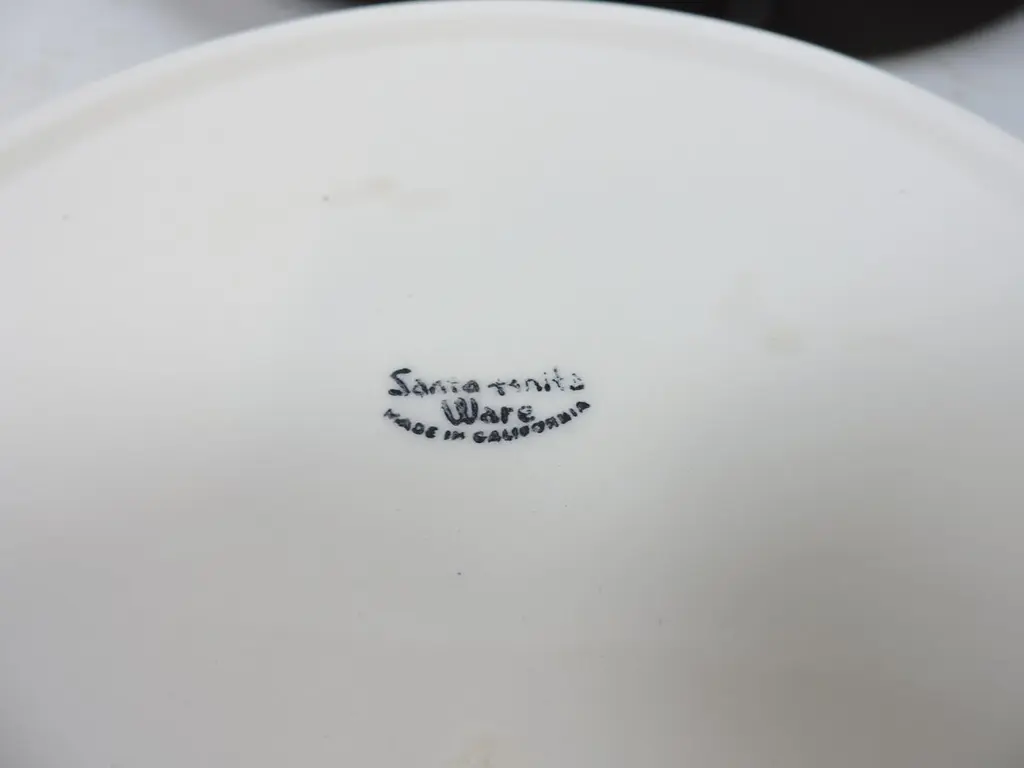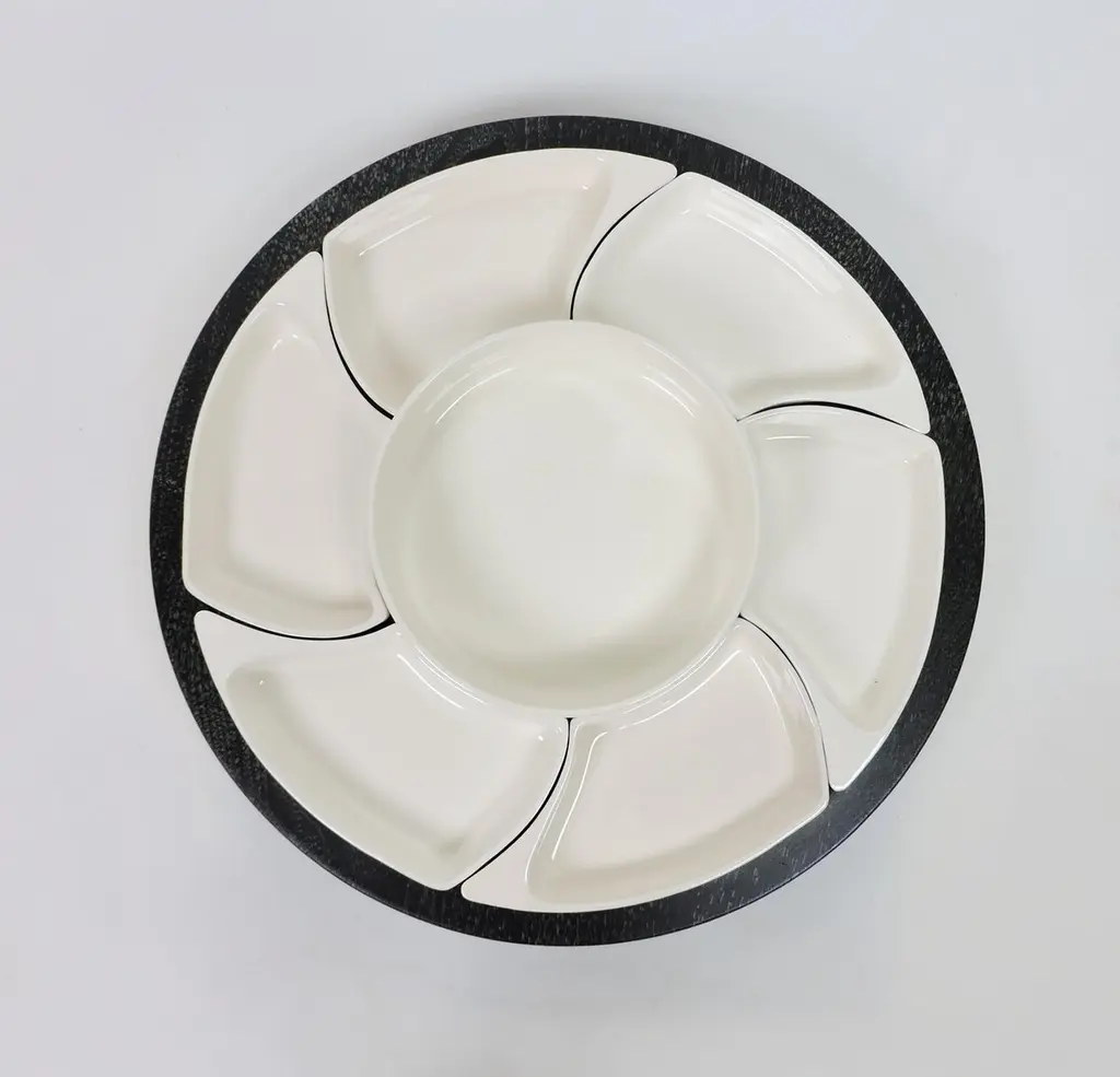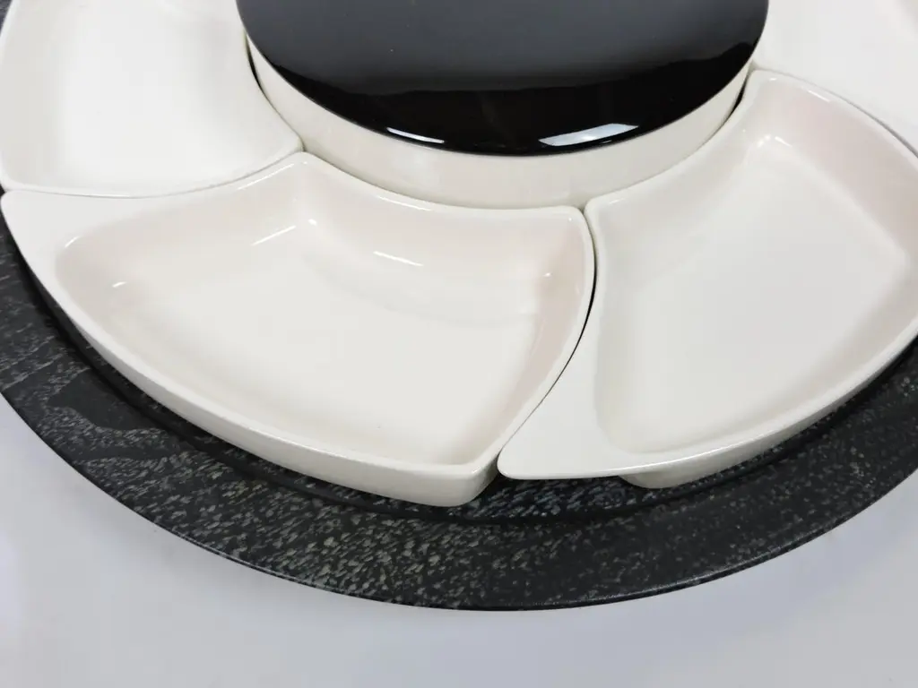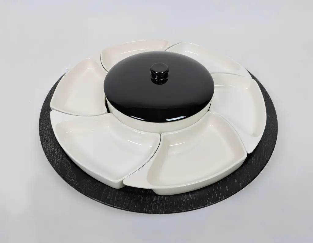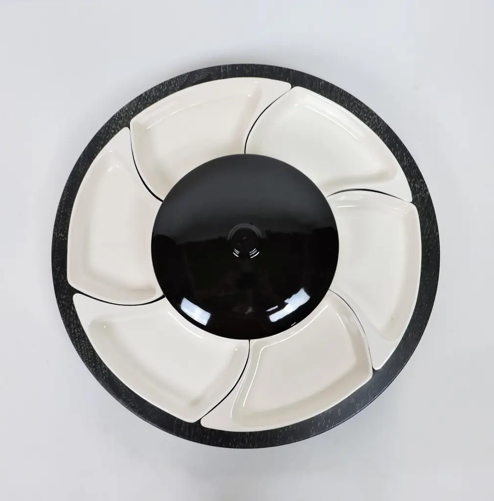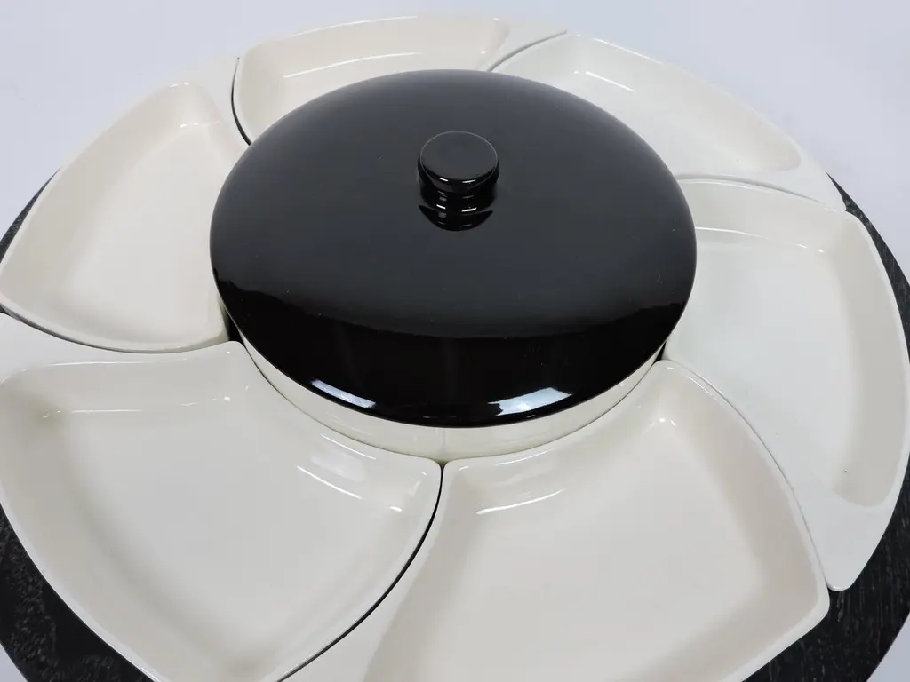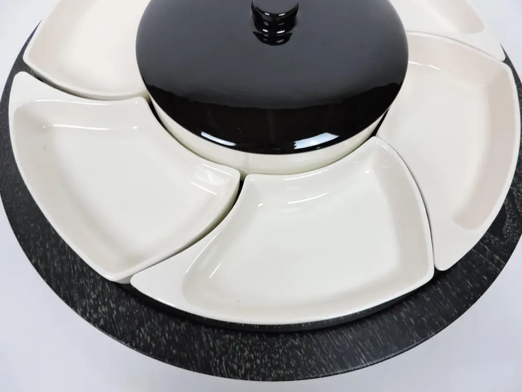Beautiful and large lazy Susan serving tray by Santa Anita Ware of California. This serving platter has 6 individual side dishes that surround a center bowl with a lid in a striking black and white design that will never go out of style. For added convenience the trays rest on a black wood grain base that spins. Center bowl stamped Santa Anita Ware, Made in California. Great piece for entertaining!