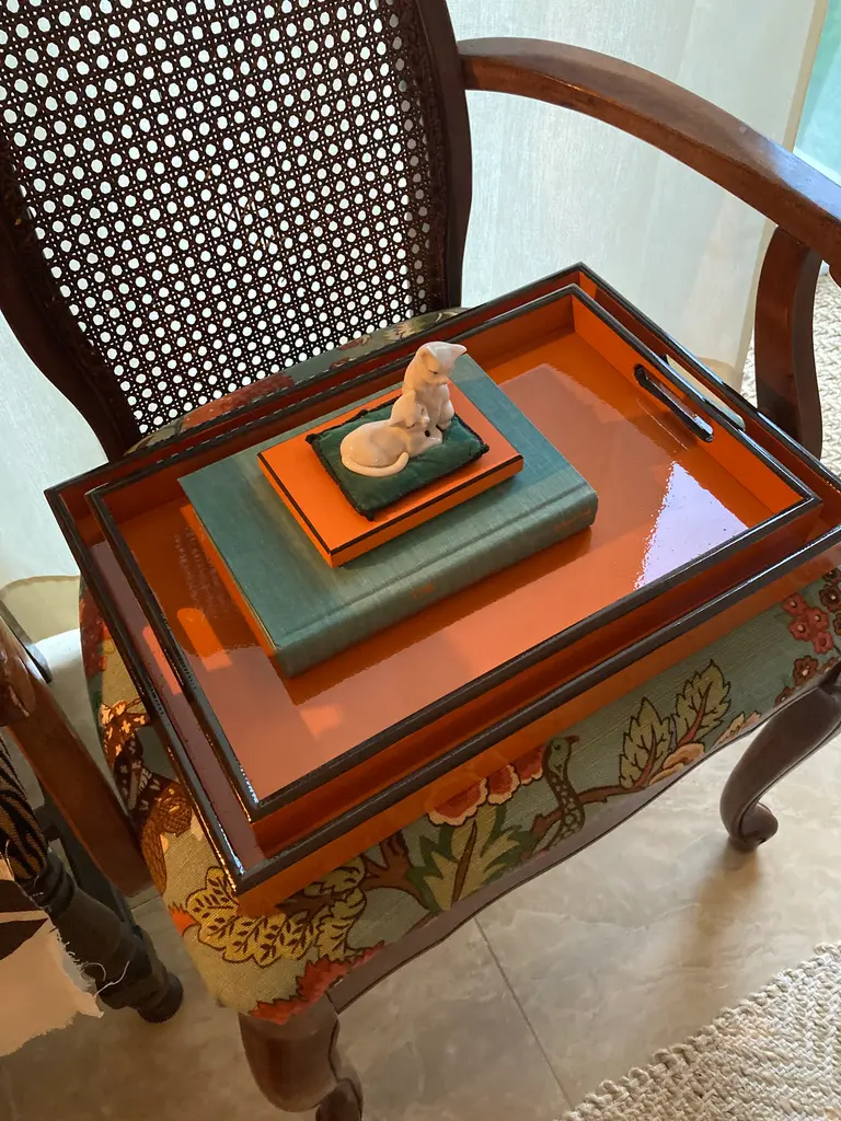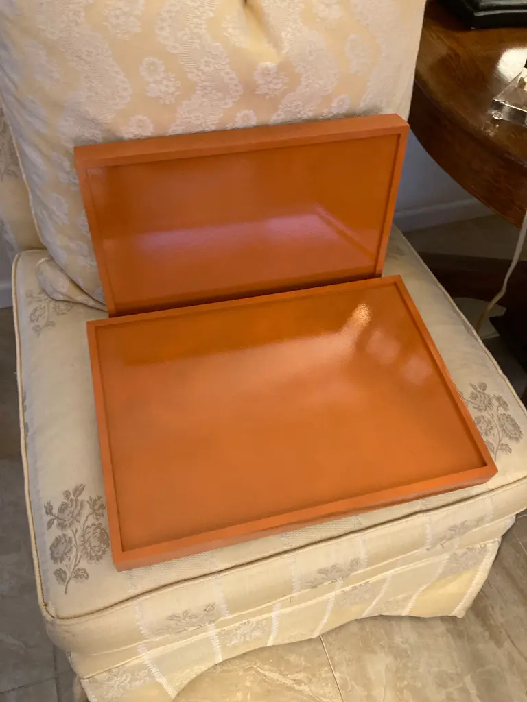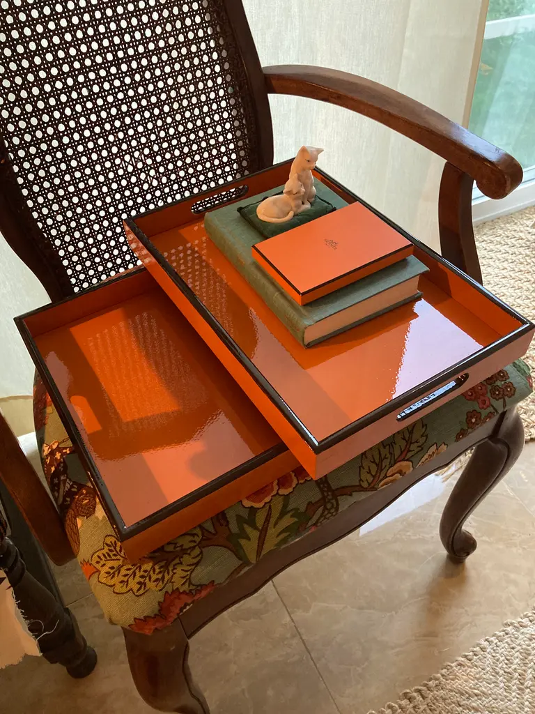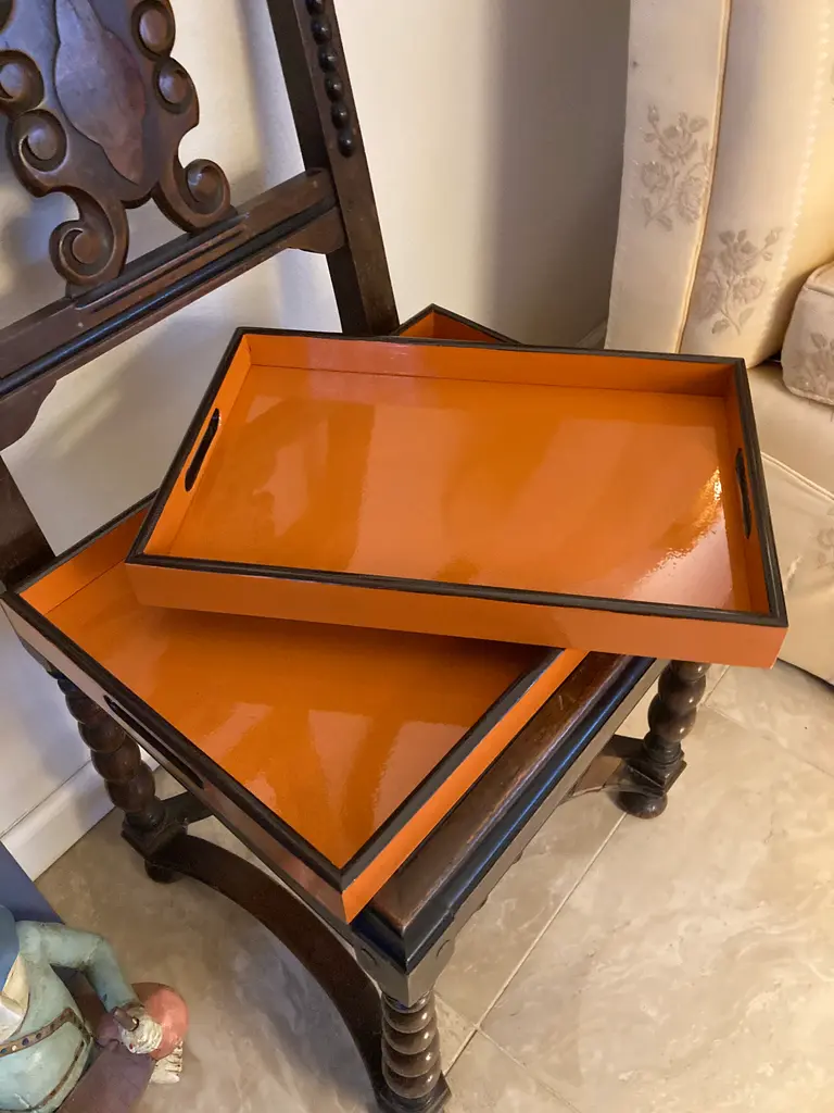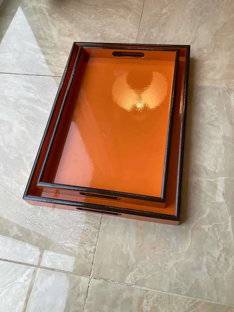 Mid-Century Modern Orange And Espresso Lacquered Tray Set Hermes Inspired- 2 Pieces