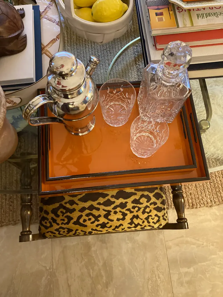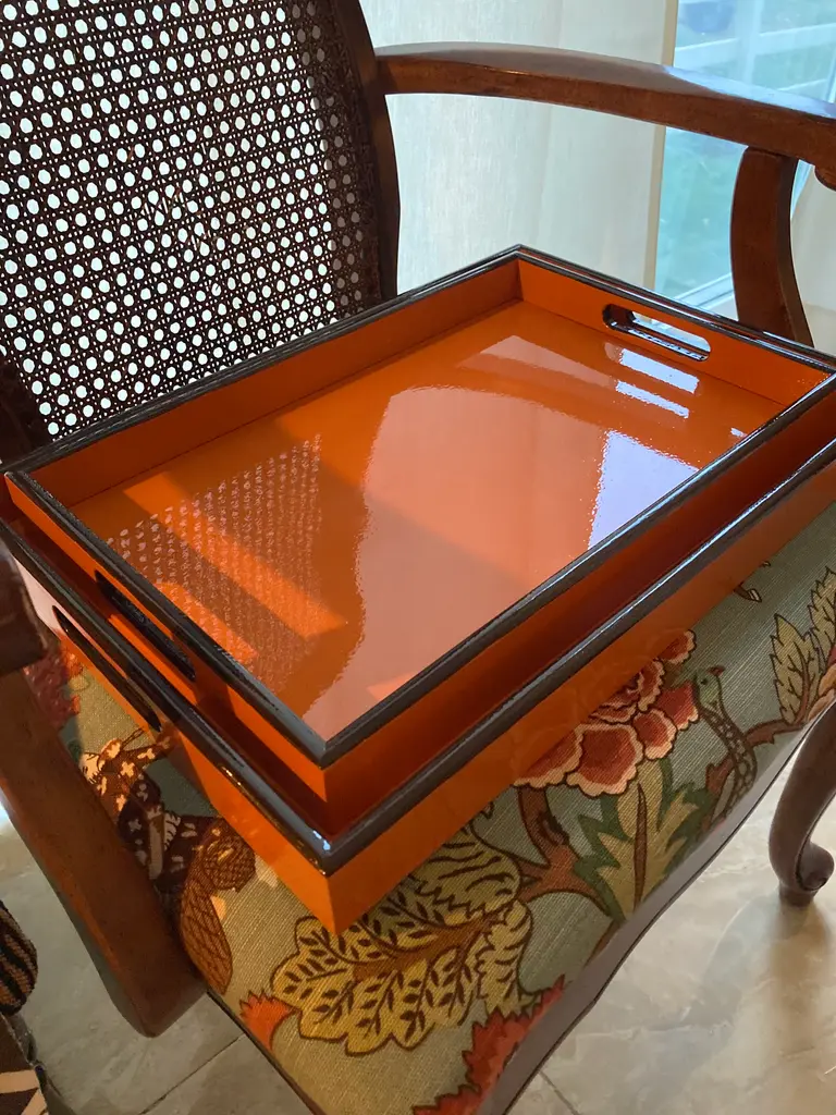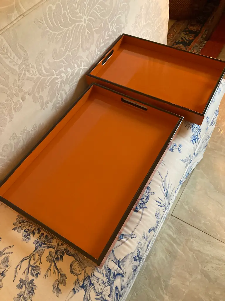 Beautiful glossy orange and espresso brown mid-century modern lacquered tray set, rectangular. Hermes inspired. Lots of layers of lacquer make these bamboo trays durable and suitable for a cocktail tray or serving tray. This is painted in a rustic orange and deep espresso brown for the edges and then heavily lacquered. Each set is made to order so expect approximately two weeks lead time. Measures 17"x12"x1.5" and 15"x10"x1.5"