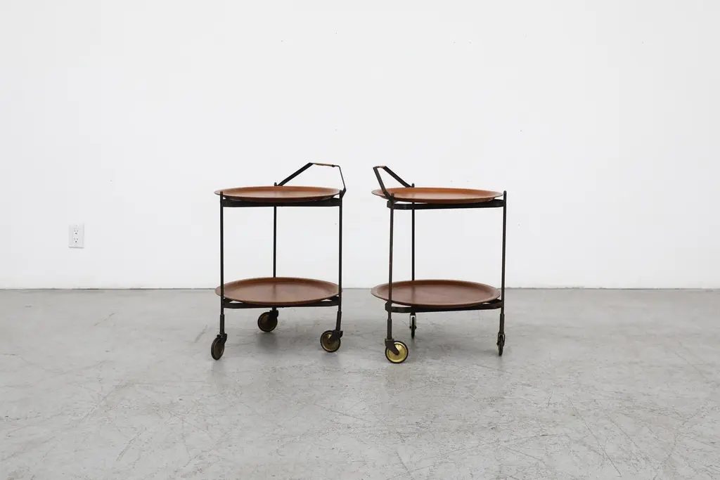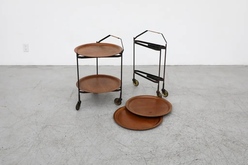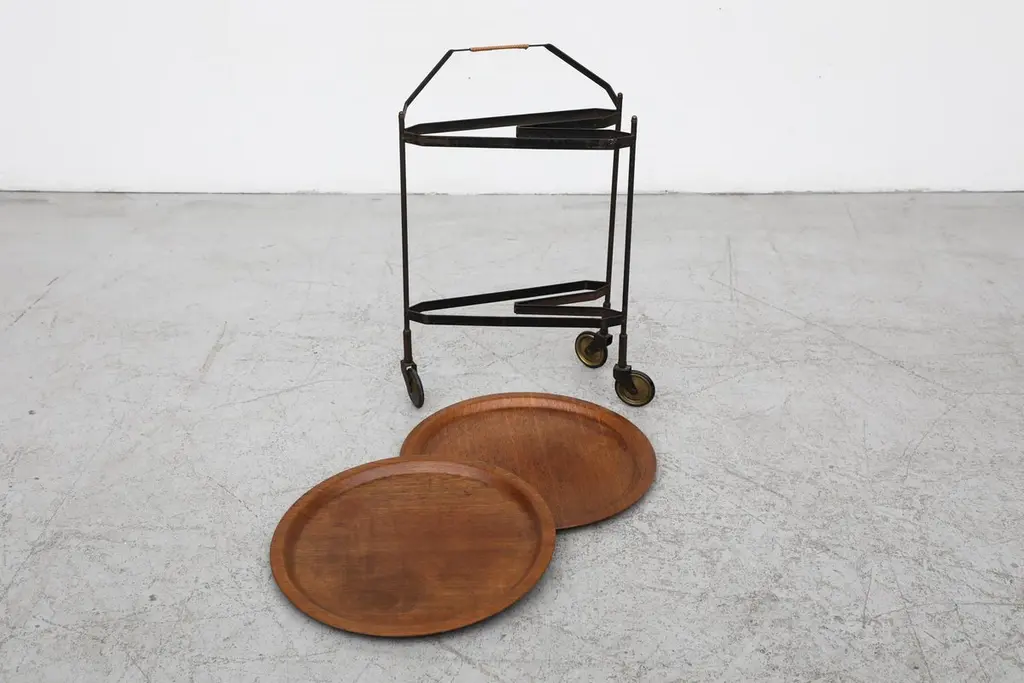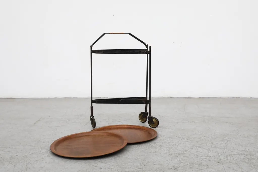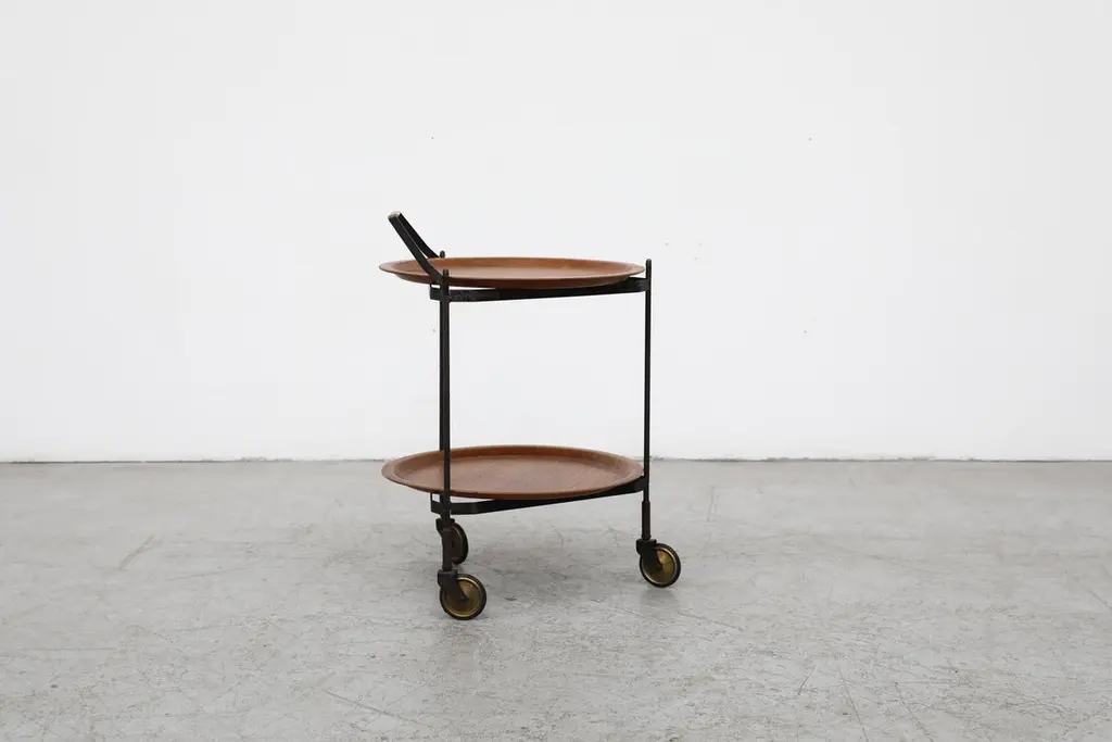 Mid-Century Rolling Cart With Folding Black Frame And Removable Teak Trays
