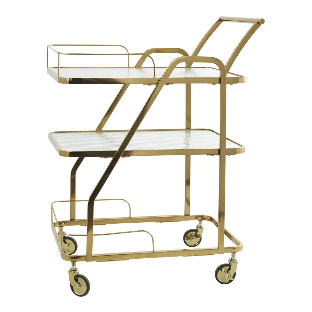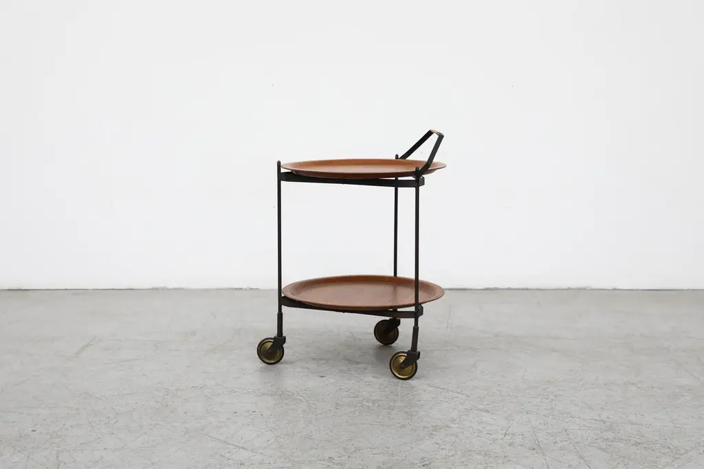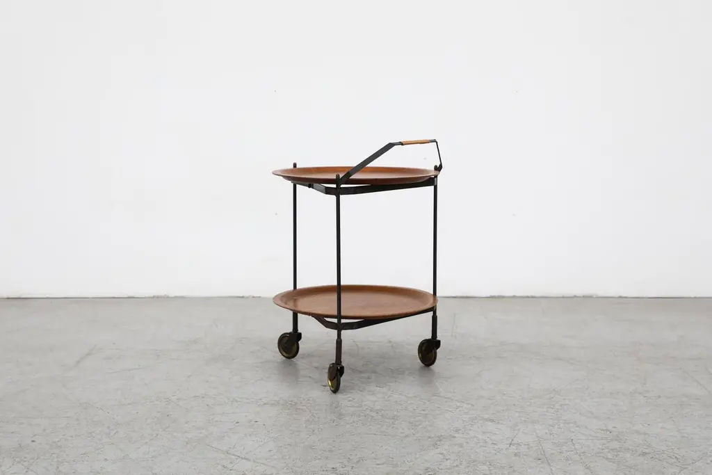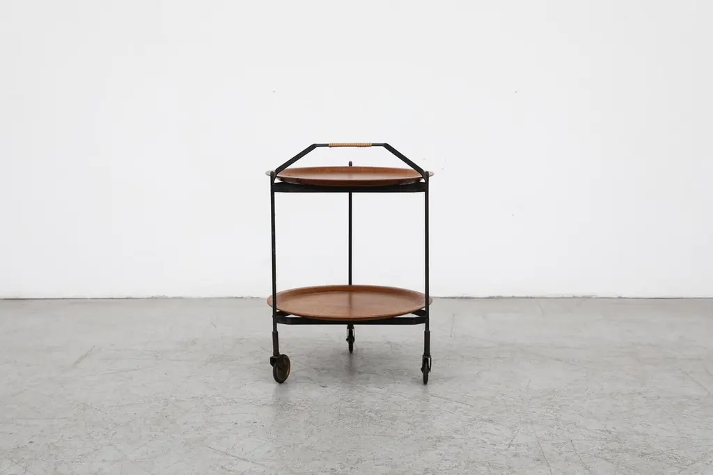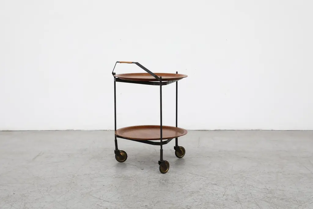 Mid-Century Rolling Cart With Folding Black Frame And Removable Teak Trays