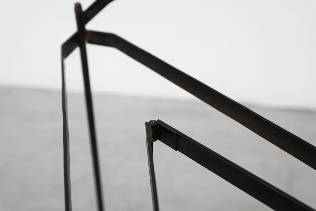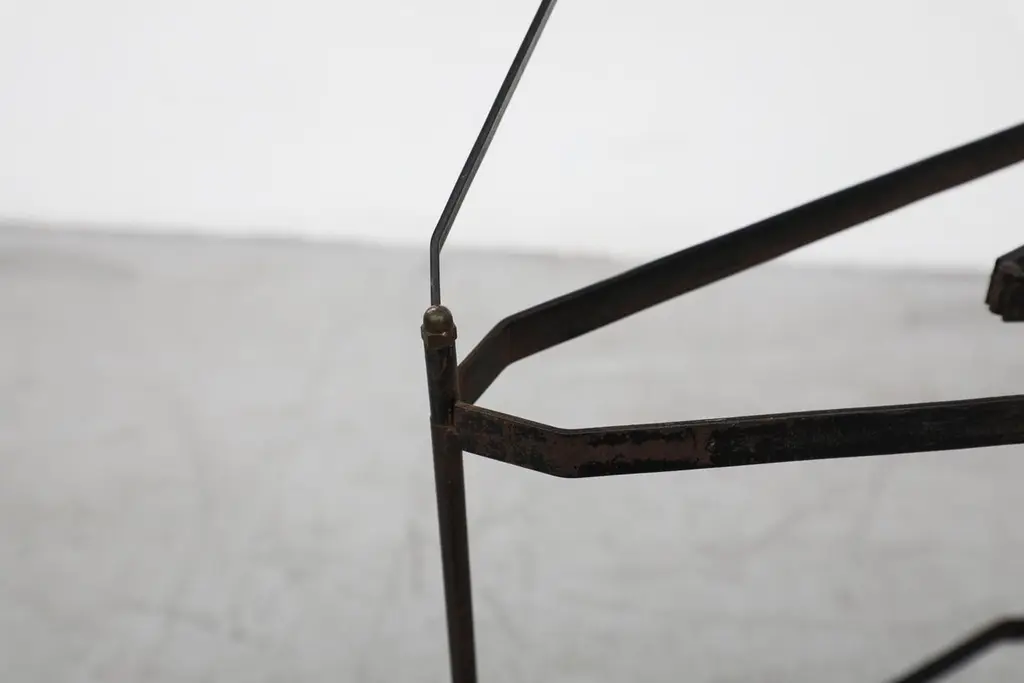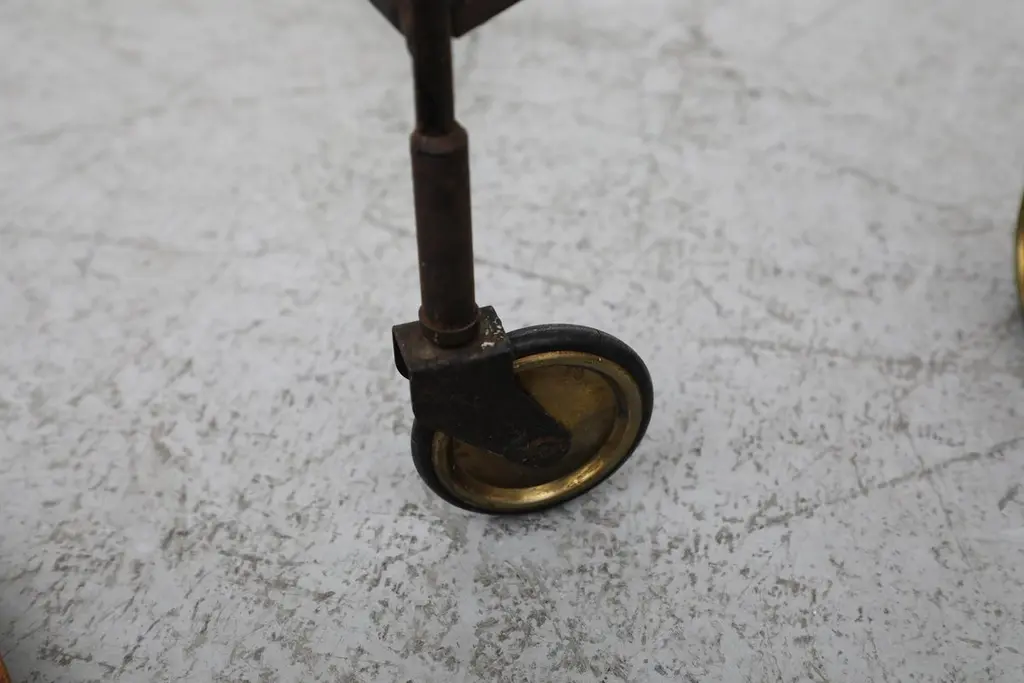 Mid-Century rolling cart with removable trays and faux leather wrapped handle. The trays are in very original condition with visible wear. The frame has heavy patina with enamel loss. Trays measure 17.875" x 0.75". When folded flat, the cart is 3.5/6.25" w x 25.25" h. Two available. Priced individually.