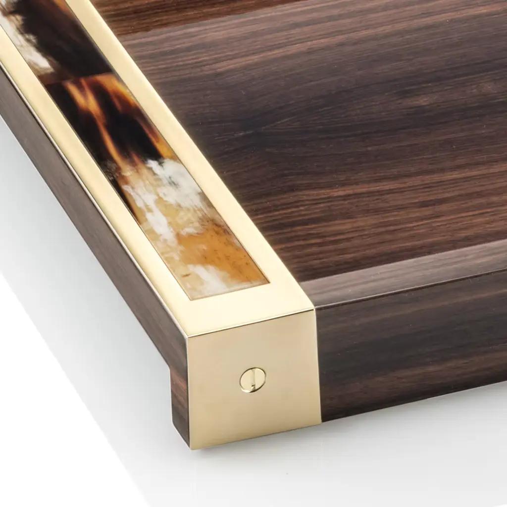 This version of the Mida tray is made in Amara ebony veneer with a gloss finish. Details in horn and 24k gold plated brass, with exposed screws.