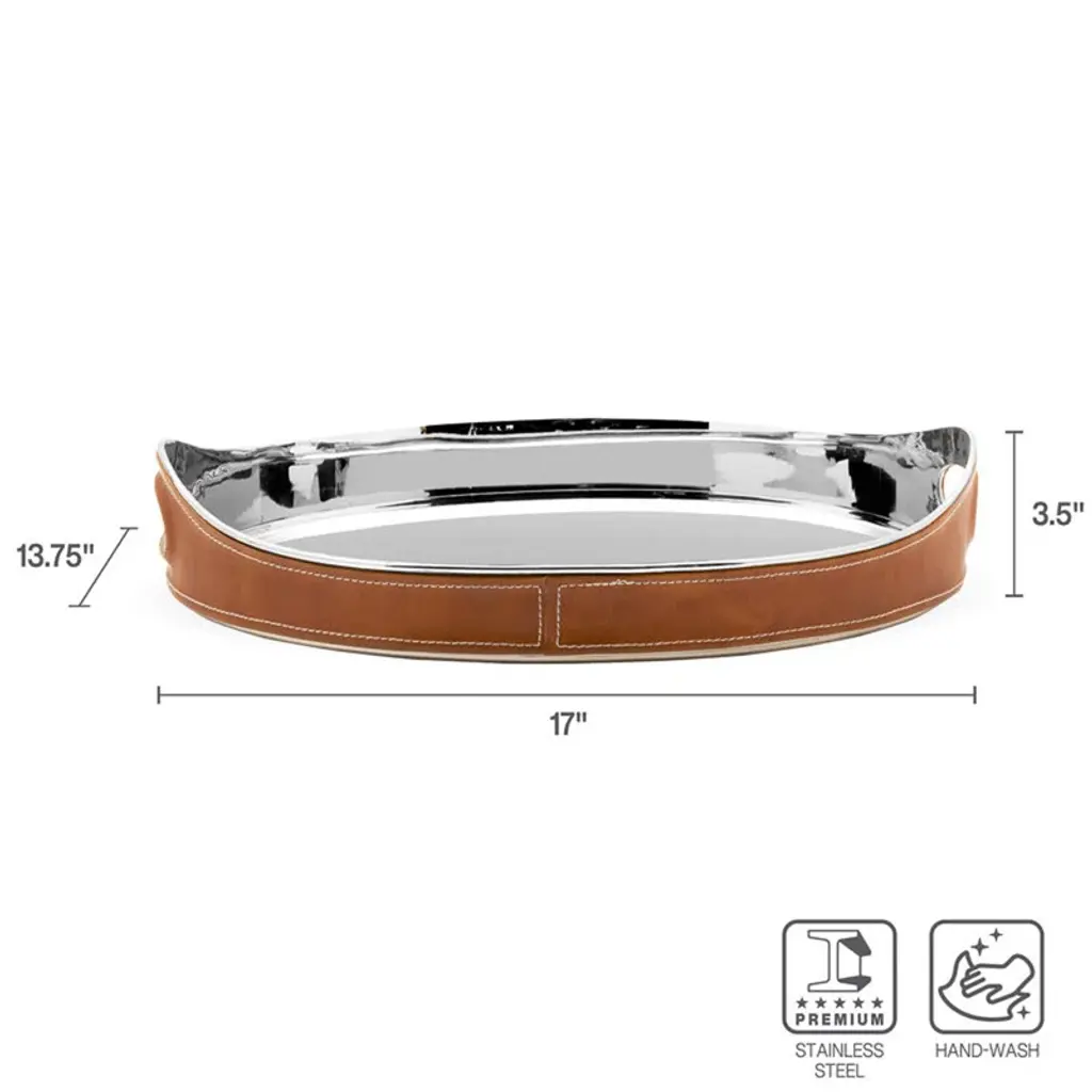 This unique leather accented large oval tray, from Mikasa, is both traditional and modern but also timeless and sophisticated. It takes your home bar to new heights. This handsome oval tray is suitable for elevating a counter, coffee table or your home bar. Measures 17 inches long by 13 ¾-inches wide and has handles for carrying ease. Hand-wash inside with warm water and a mild detergent; wipe outside with a damp cloth.