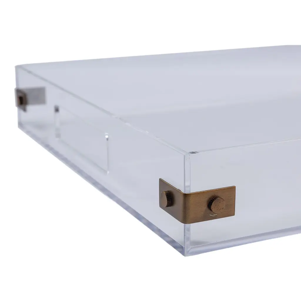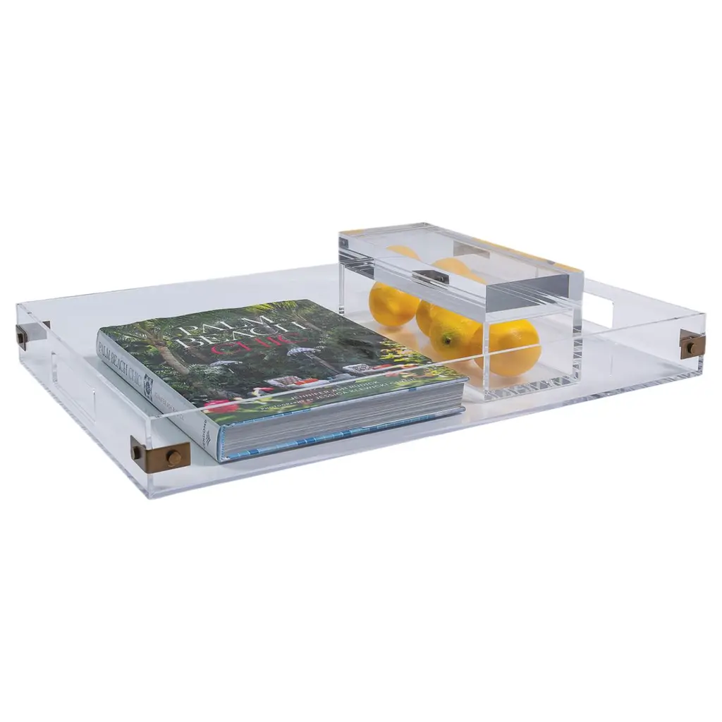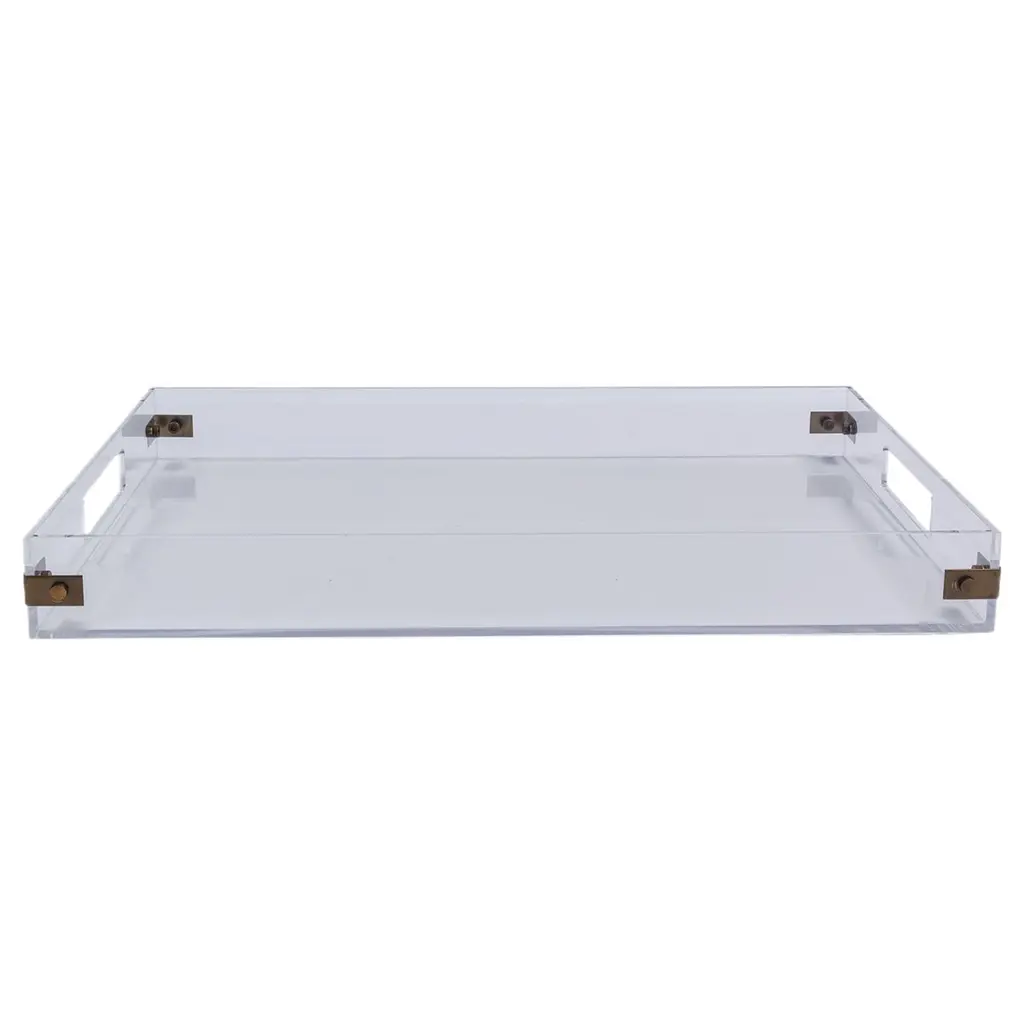 Are you dreaming of your next party or how you're going to display the latest design books on the cocktail table? Sometimes you need that statement tray to make it all happen. The rectangular tray is just that! Dramatic and ever so chic, the tray is accented with 'campaign style' aged brass metal corner hardware and a cut-out end handle for ease when serving drinks. Measurement: 23"W x 15"D x 2.5"H. Materials: acrylic, metal hardware.