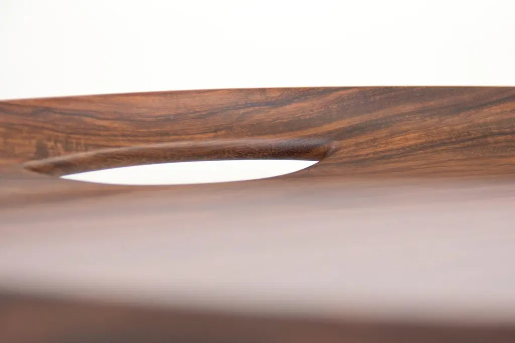 A series of turned trays designed in a perfect circle with two open handles. An expression of the pure beauty of the exotic Mexican woods._design: Ania Wolowskafinish : waxed available in: Carribean Walnut or Black Cabbagebark _Our pieces have a finish based on natural waxes and oils that protect the surface, accentuate the grain and texture and preserve the warm feeling of the wood.All the wood that we work with to create our pieces comes from local "ejidos" (communal land) with responsible forestry management programs and certificates._Wood is a natural and organic element. It will vary in color and grain according to each wood plank’s unique characteristics and applied finish. The image shows only one hue of many, making each chair a one-of-a-kind piece of furniture.