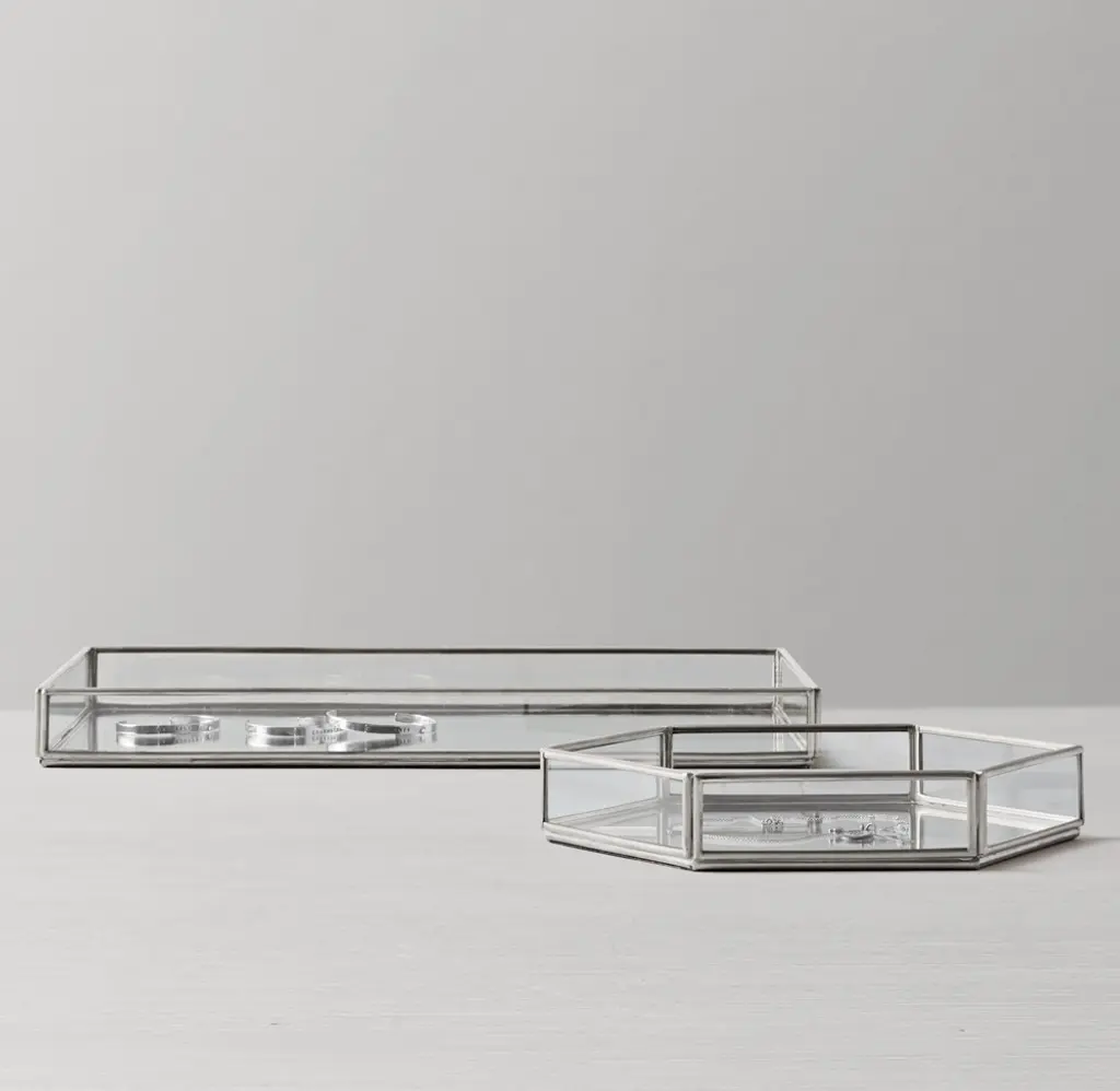 Clear as day. With its mirrored base and glass-and-pewter sides, our tray keeps trinkets and treasures in easy reach and on elegant display.