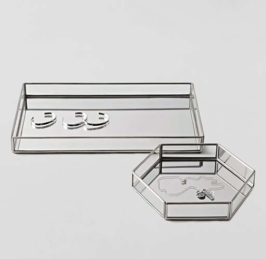 Clear as day. With its mirrored base and glass-and-pewter sides, our tray keeps trinkets and treasures in easy reach and on elegant display.