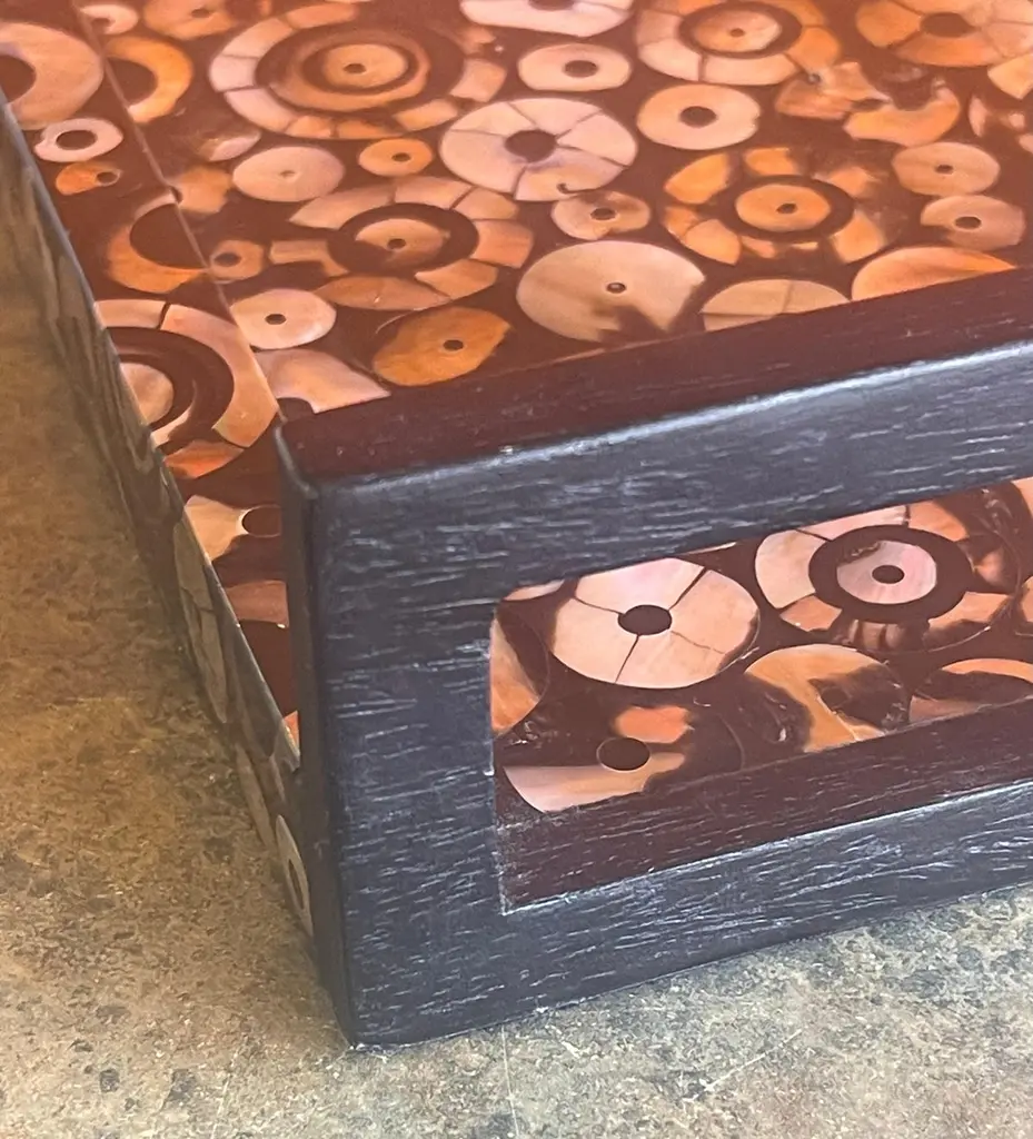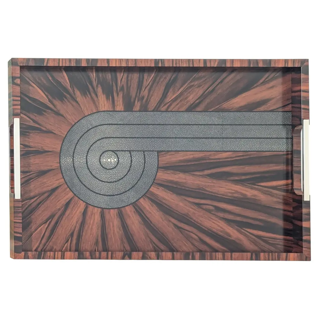 Incredible mixed exotic contemporary serving tray by R&Y Augousti of Paris, circa 2000s. The tray is in very good vintage condition and measure 17.75"W x 17.75"D and 2.75"H. 2464R&Y Augousti was founded in 1989 by husband-wife duo Ria & Yiouri Augousti. Their artistic backgrounds brought them together as innovators in their field by reviving the artisanal techniques of shagreen and other exotic materials that were predominant in the Art Deco period of the 1930s.Through their mix of vintage and contemporary design their furniture and home accessories brand were met with worldwide praise.From a debut collection for the luxurious Hotel Crillon in Paris, to exclusive collections for luxury stores like Barneys New York & Bergdorf Goodman, they finally opened their flagship store on the famous Rue Du Bac in the 7th arrondissement of Paris, France.From this they began to work closely with worldwide famous interior designers, architects and celebrities to create custom pieces for their homes and projects all within keeping to the Augousti universe.R&Y Augousti was founded in 1989 by husband-wife duo Ria & Yiouri Augousti. Their artistic backgrounds brought them together as innovators in their field by reviving the artisanal techniques of shagreen and other exotic materials that were predominant in the Art Deco period of the 1930s.Through their mix of vintage and contemporary design their furniture and home accessories brand were met with worldwide praise.From a debut collection for the luxurious Hotel Crillon in Paris, to exclusive collections for luxury stores like Barneys New York & Bergdorf Goodman, they finally opened their flagship store on the famous Rue Du Bac in the 7th arrondissement of Paris, France.From this they began to work closely with worldwide famous interior designers, architects and celebrities to create custom pieces for their homes and projects all within keeping to the Augousti universe.Although shagreen is their signature DNA, R&Y Augousti are known as pioneers of pattern mixes of exotic materials of shagreen, shell, parchment, eel-skin, semi-precious stones, snakeskins and metal. Their stunning patterns are identifiable by their worldwide clientele.
