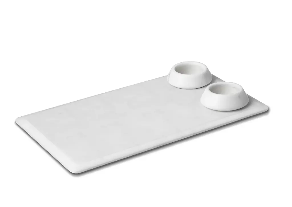 Let us cut off the ordinary: a board is not necessarily just a serving platter. It is an individual way of serving cheeses, meats, vegetables or bread. Marble lends itself to the game by providing the special staging. The item includes two White Michelangelo Marble Bowls. Smooth finishing, stain treatment compatible with food. Commercial name: Symposia (Board) and Thera (Bowls) - Materia e Tavola Collection by Ivan Colominas, Spanish Designer. Also available in Black Marquinia Marble. Made in Italy, hand finished. Bowls' dimensions: 2.9 x 1.0 in The item is made to order. Please note that marbles and stones are natural materials, and therefore can differ slightly in appearance - even when coming from the same quarry or the same block. Picture can then differ slightly from purchased item, as every piece is unique.