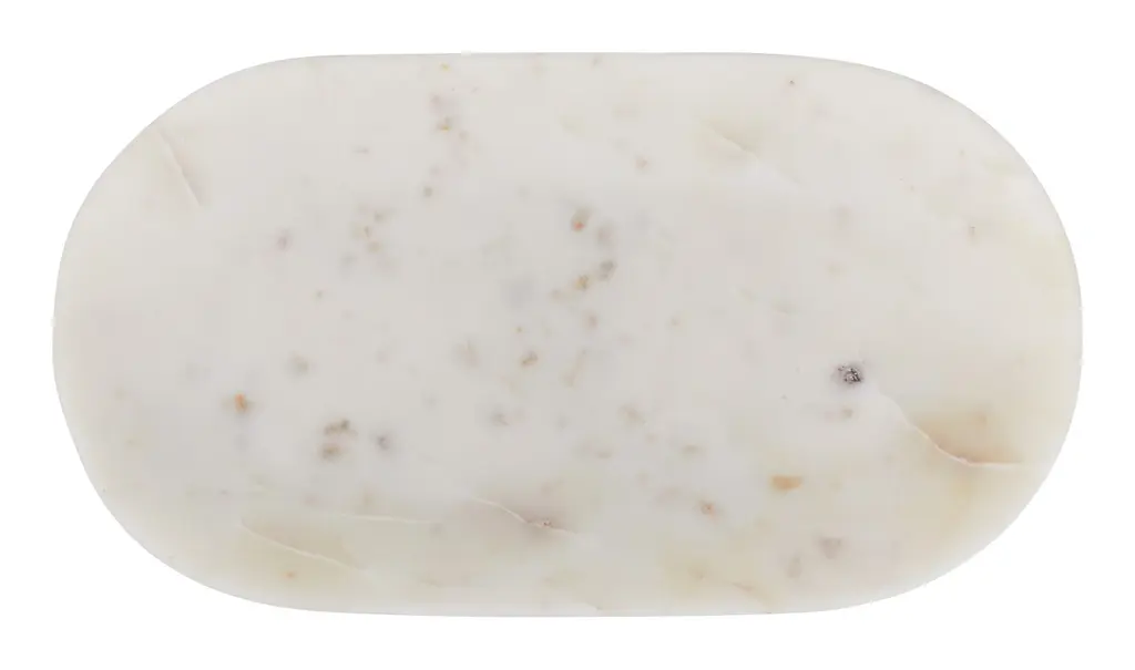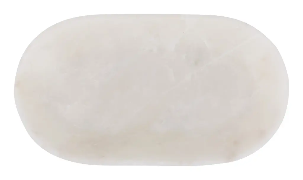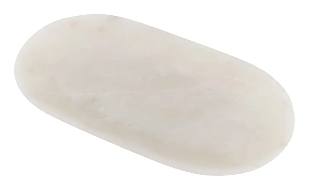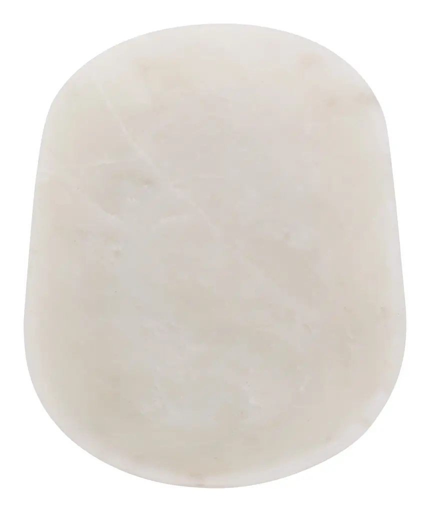 Our versatile Monika Tray can truly do it all. Chic and simple, Monika is carved into a sleek ovoid shape from cool white marble with touches of grey veining. Perfect for serving up small bites or a block of cheese during cocktail hour, we also love this dish as a catchall on an entryway console or as a vanity tray on the dressing table. •white marble •food safe •hand wash only•each is unique Dimensions •10.75"W x 5.25"D x 1"H