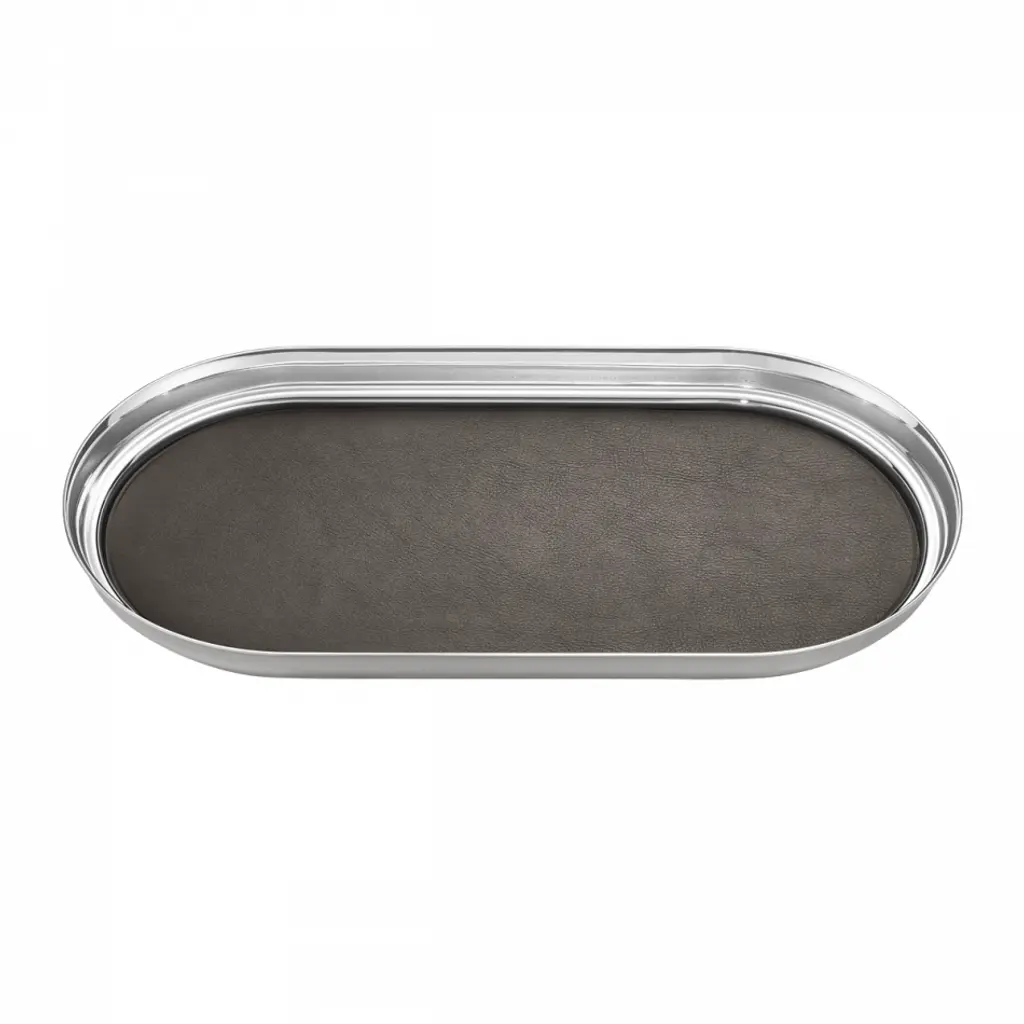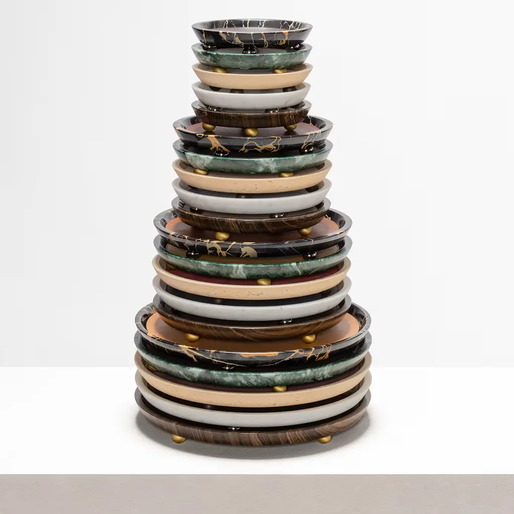Marble structure with metal rounded feet available in different finishes. Provided with removable leather placemat. Marble finishes available: Arabescato white / green Guatemala / Eramosa brown / black Portoro / Travertino. Metal finishes available: chrome / bronze / brass.