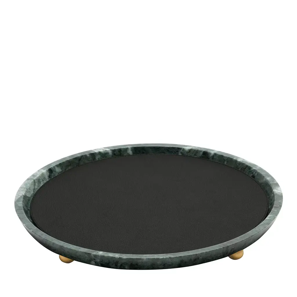 Marble structure with metal rounded feet available in different finishes. Provided with removable leather placemat. Marble finishes available: Arabescato white / green Guatemala / Eramosa brown / black Portoro / Travertino. Metal finishes available: chrome / bronze / brass.